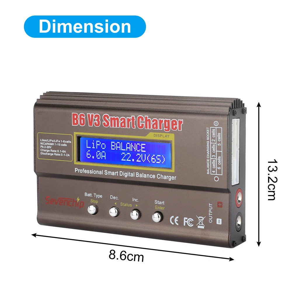 Product Description B6 V3 Smart Battery Balance Charger 80W Digital Discharger For RC LiPo NIMH LiHV Product Feature ๐ฏ๐Multiple Functions: Except for charge, balance, and discharge, it also has these functions, Terminal Voltage Control; Battery Internal Resistance Checking, Let you know when a cell is going bad; Data Storage and Memory Loading(Store up to 20 packs in memory); Digital DC Power. Automatically identify the cell counts of the lithium battery section. Support LiHV battery. Lithium Battery Capacity & Voltage Checking. ๐ฏ๐Wide Voltage Compatibility: Use the battery pack balance charger on LiPo/Li-ion 3.7V-22.2V(1-6 cell); LiFePO4 3.2V-19.2V (1S-6S); LiHv: 1-6 cell; NiMH/NiCd 1.2V-18V (1A-15S); PB: 2-20V; Smart Battery: I, II, III. So it is very useful. ๐ฏ๐High Quality & Safe: Using superior chips and materials to deliver quality performance, the charger is designed with Reverse Polarity Protection, Short Circuit Protection, Over-Charge Protection, Over-Current Protection, and Over-Temperature Protection for safety. ๐ฏ๐Universal Voltage Compatibility: 80W high power, Max 6A charging current, this RC lipo balance charger can balance, fast charging, data storage, cyclic charging and discharging, and much more for all of your battery packs. Note ๐๐ Please Note: Battery and power adapter are not included in the package. We recommend using a 12V 5A-6A adapter for optimal performance. Product Specification Type Battery Balance Charger Color Brown Input Voltage DC Charge Current 0.1-6.0A Discharge Current 0.1-2.0A Charge Power Max.80W Discharge Power Max.5W Temperature Sensor port Yes Built-in Balance Yes Current drain for balancing Li-Po 300mAh/cell NiCd / NiMH battery cell count 1~15 cell Li-Ion / Polymer cell count 1~6 series Pb battery voltage 2V~20V Dimension 135 * 86* 32mm(L*W*H) Package Included ๐1 x B6 V3 Charger ๐1 x Charging Cable With XT60 and T-Plug ๐1 x Universal Crocodile Clip ๐1 x English User Manual Location Descriptions To improve your buying experience and ensure fast delivery, Your order will be shipped from the warehouse located in either new jersey or california that is closest to your address. If you have any questions, Please contact us. Thank you for your support !