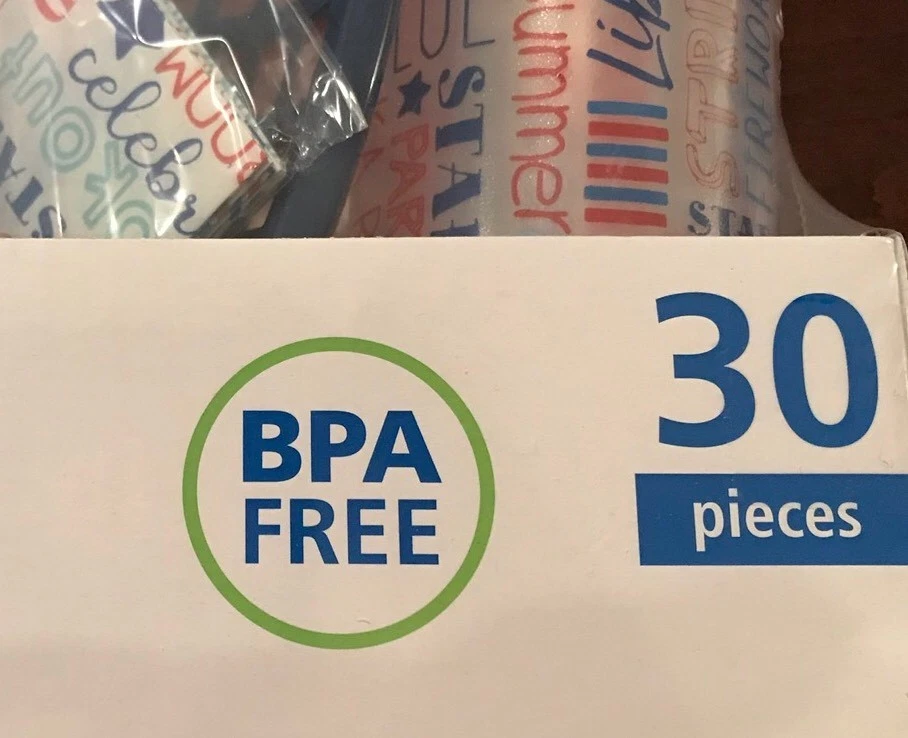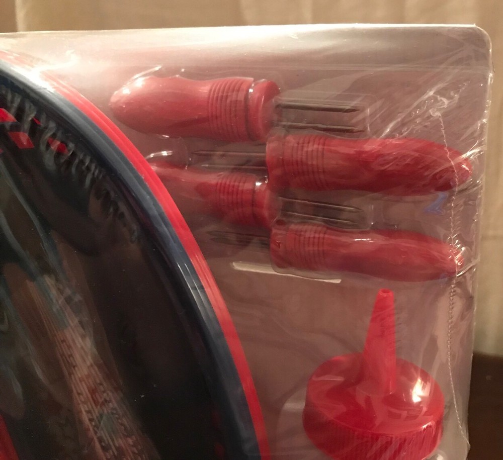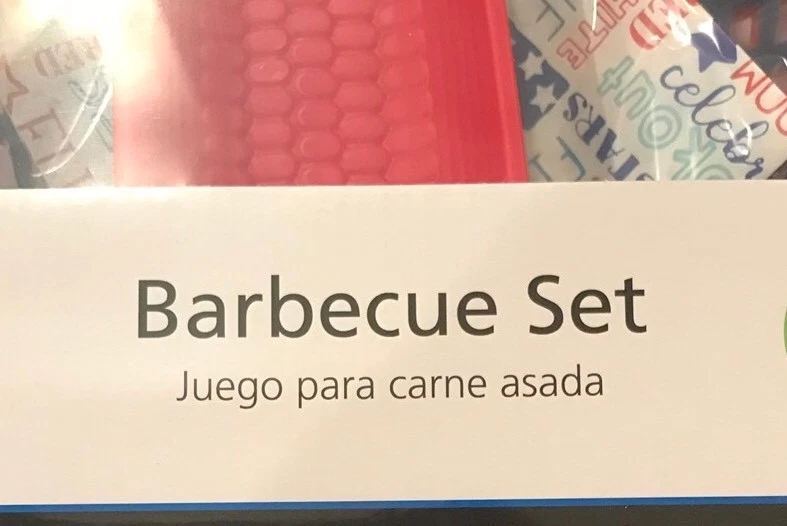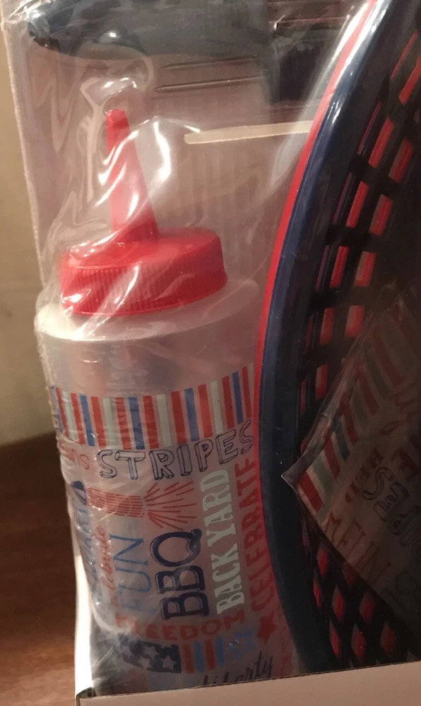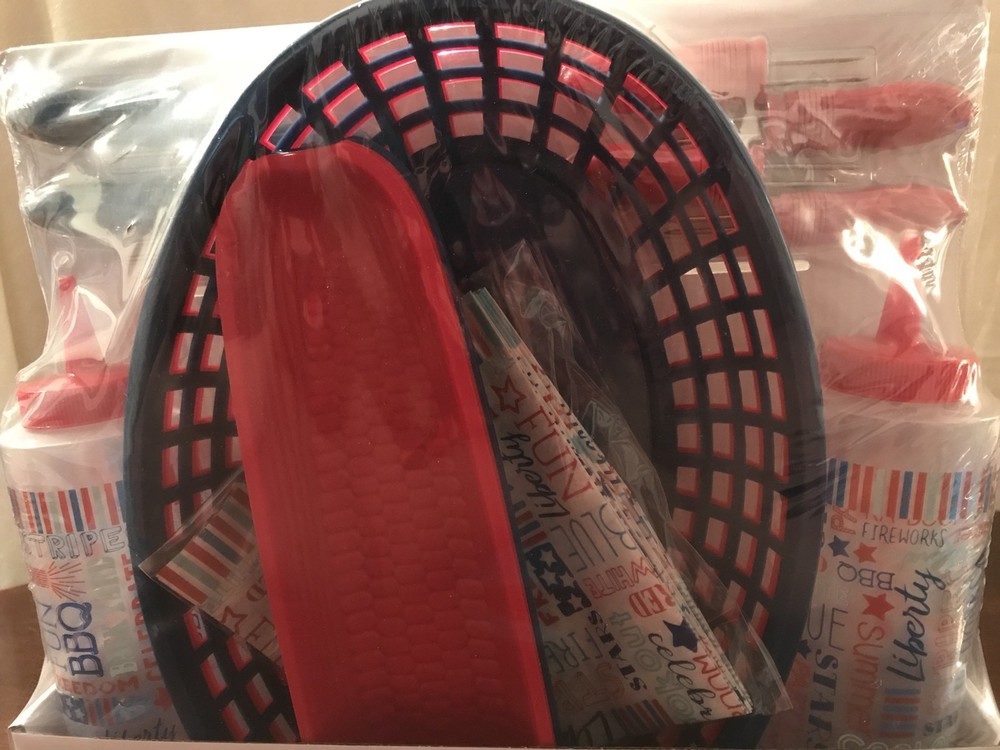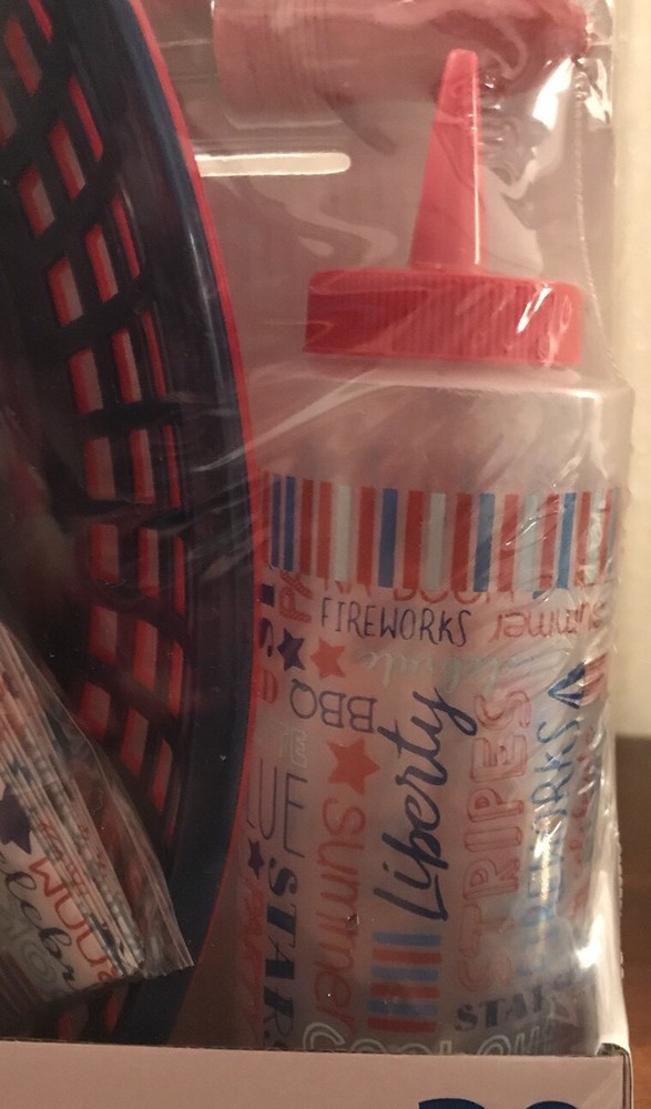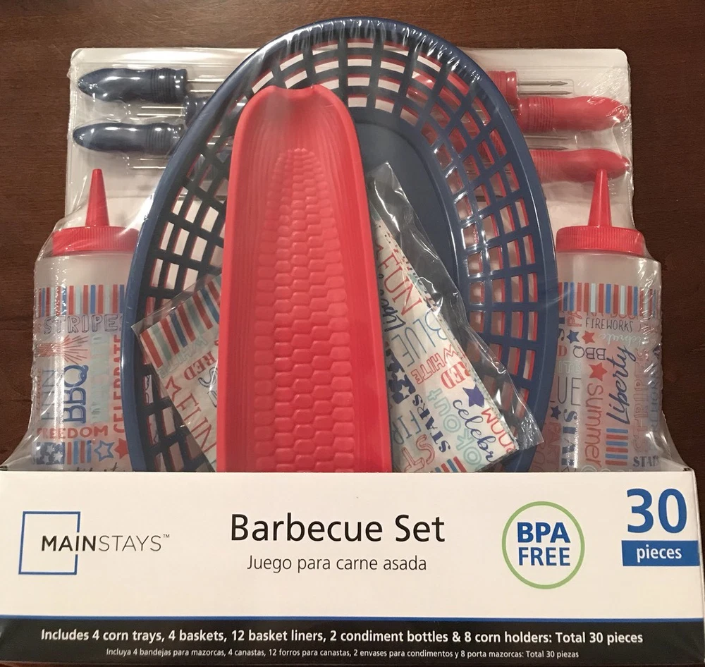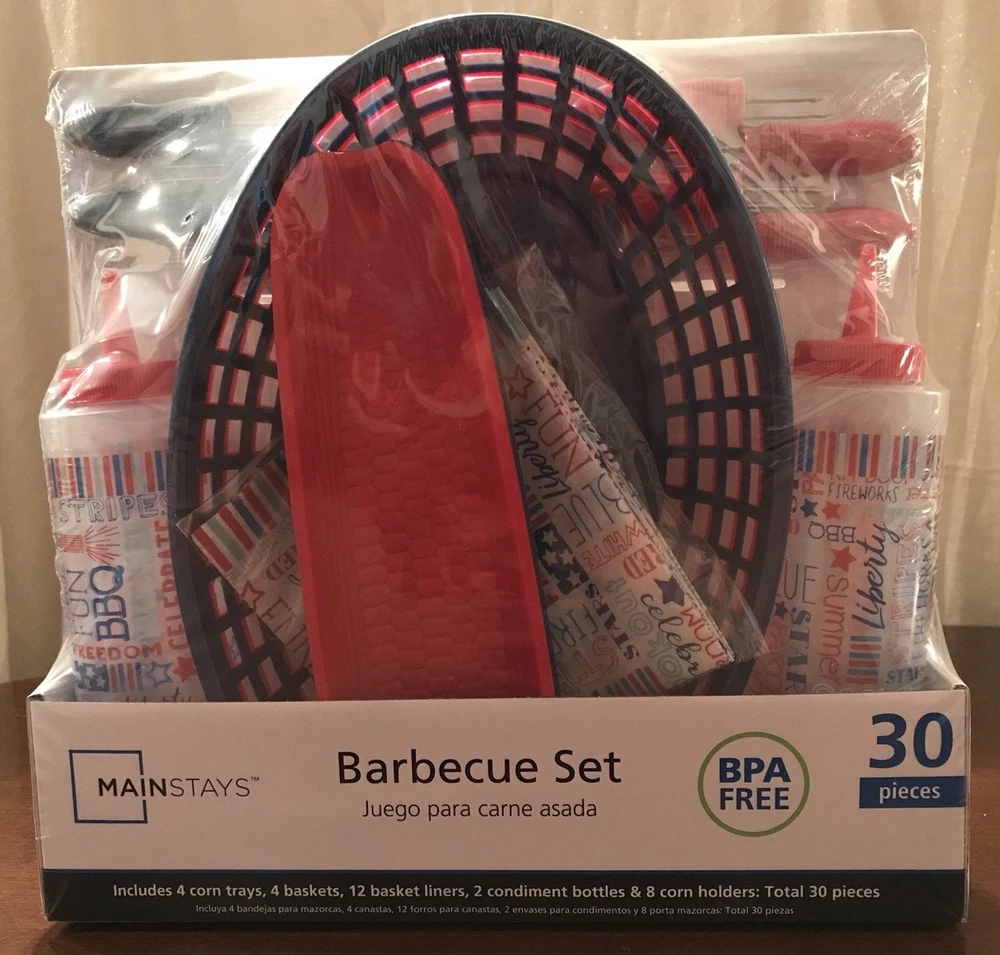 BARBECUE SET, in an Americana Red, White, and Blue Pattern. (30 Piece). NEW. (In Factory Sealed Packaging) 30 Pieces include: 4 corn-on-the-cob trays, 4 baskets, 12 basket liners, 2 condiment bottles, and 8 corn-on-the-cob holders. BPA FREE. (See Pictures) (#1818-19-20-21-22-23)