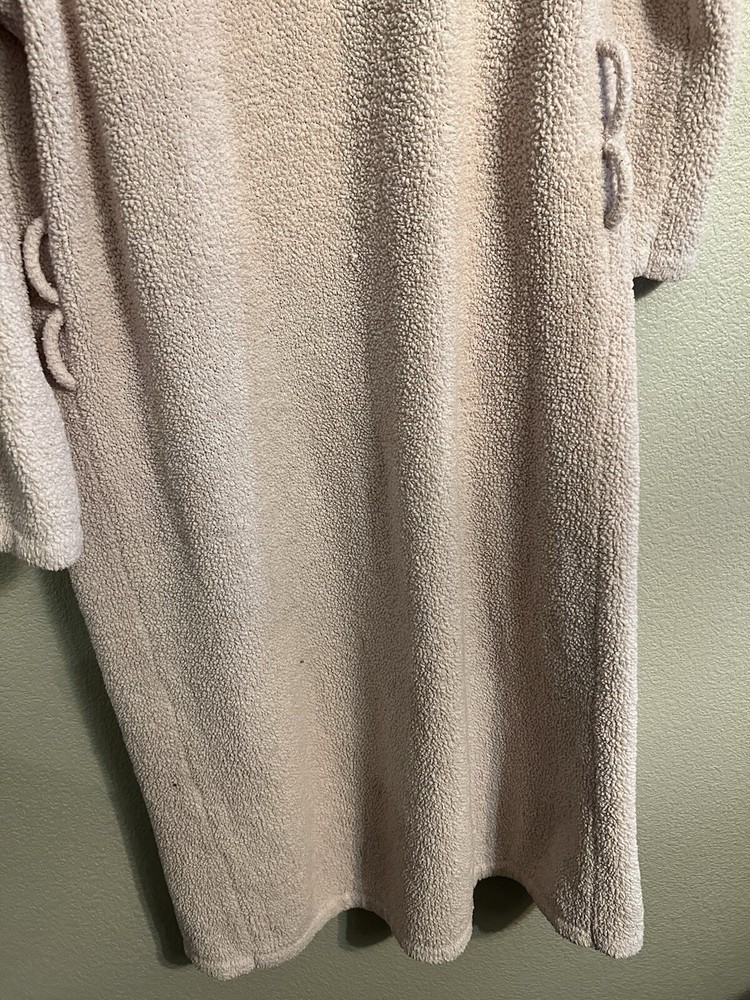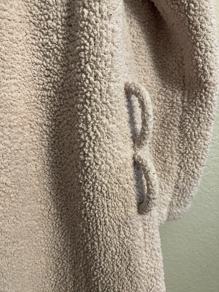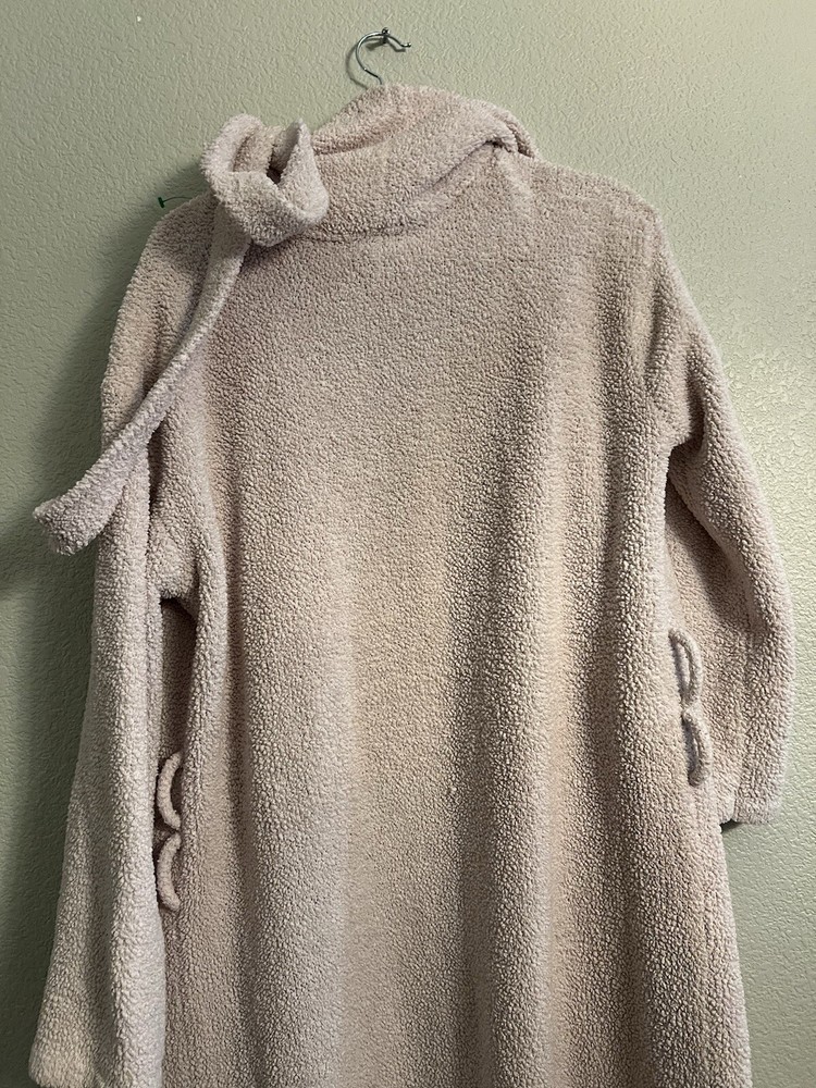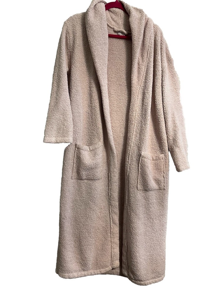 Indulge in luxurious comfort with this Barefoot Dreams Cozy Chic wrap robe in a beautiful dusty pink hue. Crafted from soft and cozy knit fabric, this robe features a V-neckline, long sleeves, and a belted waistline for a chic and comfortable look. The robe also boasts convenient pockets for added functionality. Ideal for winter, fall, and spring seasons, this Barefoot Dreams Cozy Chic robe is a must-have addition to your sleepwear collection. The solid pattern and cozy accents make it perfect for women who value both style and comfort. This robe is machine washable and easy to maintain. Please see photos for wear.