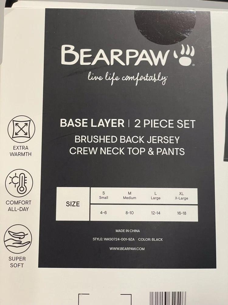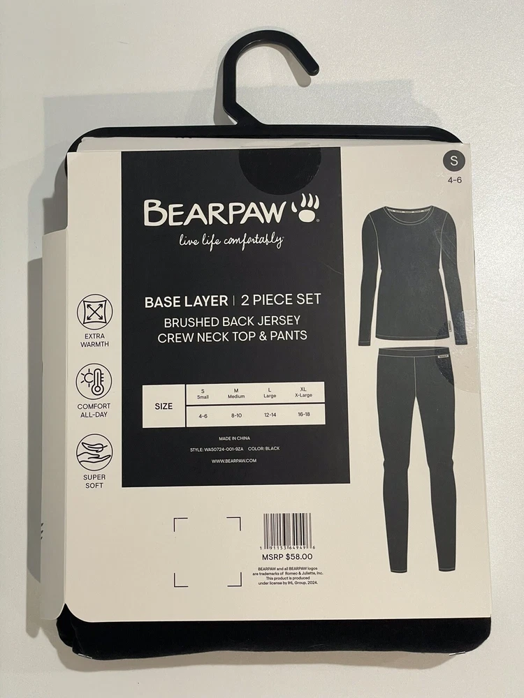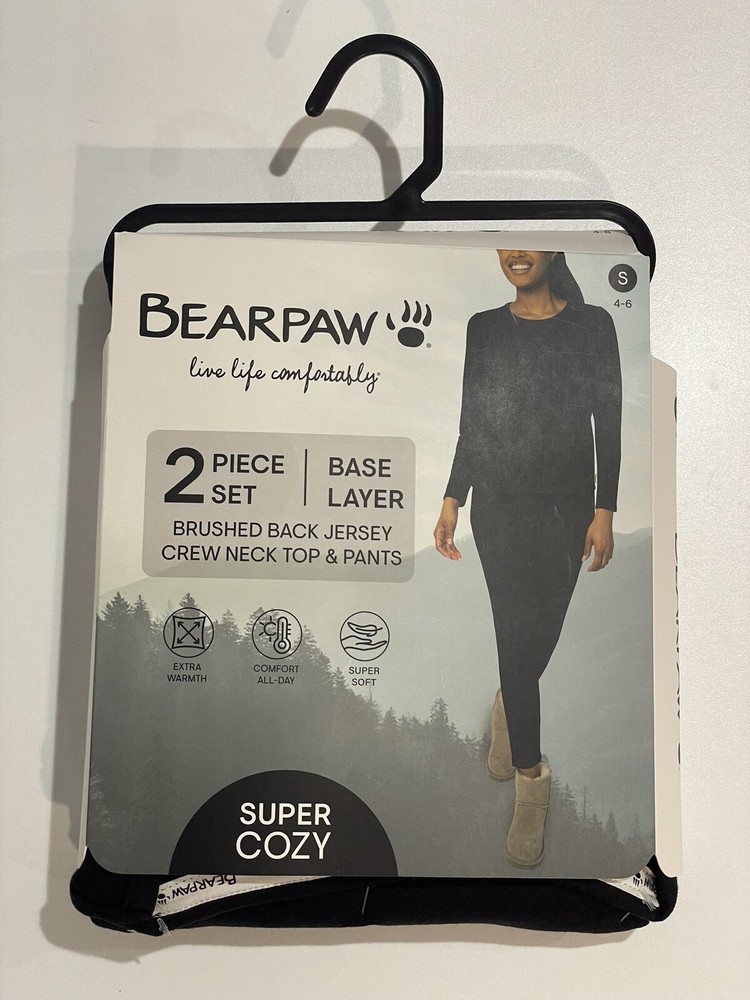 Stay warm and cozy this winter with BEARPAW Women's Base Layer Super Cozy 2 Piece Set. The set includes a long sleeve top and pants in size S (4-6). The material is brushed back jersey, making it extra soft and comfortable to wear. The BEARPAW brand is known for its quality and durability, making this set a great addition to your winter wardrobe. Get ready to beat the cold with this super cozy base layer set!