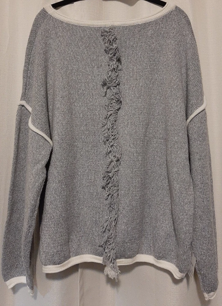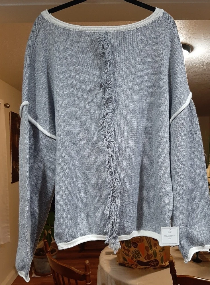 BEAUTIFUL Belle De Jour gray XL Pullover Sweater w/fringe back stripe NEW. MRP $50-$65. This is a cozy extra Long sleeves & fun Fringe back. Great for holidays. B14