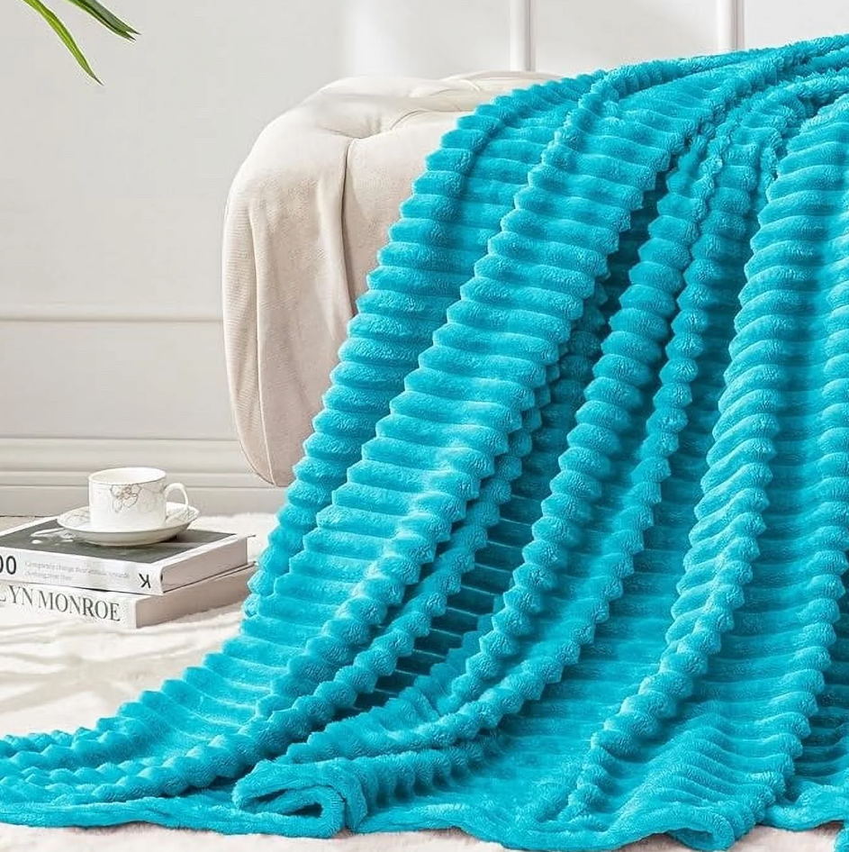 This fleece throw blanket is incredibly soft and cozy—perfect for snuggling on the couch or bed! The 3D ribbed texture adds a luxurious feel while keeping you warm without overheating. It's lightweight yet thick enough for chilly nights, and the elegant jacquard pattern looks stylish in any room. The blue color is rich and vibrant, making it a great decorative piece too. Washes well and stays plush even after multiple uses. Highly recommend for comfort and style!