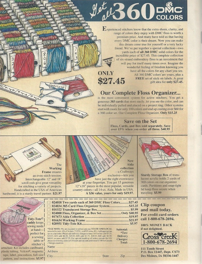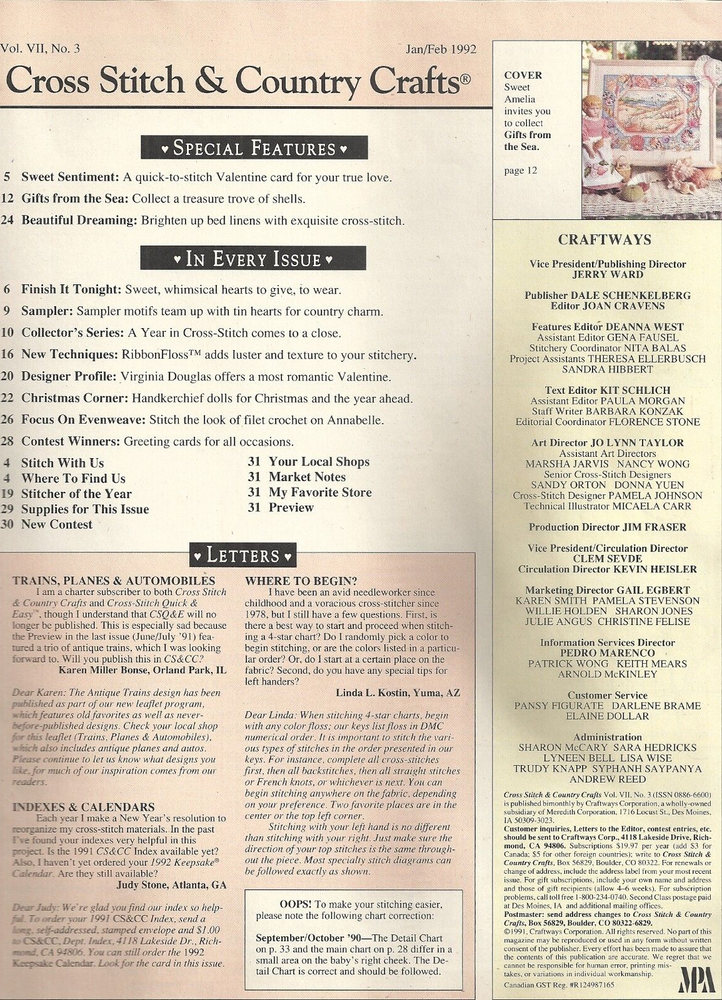 Welcome to 513.s.marino BETTER HOMES & GARDENS CROSS STITCH & COUNTRY CRAFTS MAGAZINE ~~JANUARY/FEBRUARY 1992 ~~ • 27 GREAT PROJECTS • VALENTINES • HANDKERCHIEF DOLLS • RIBBON FLOSS 30 PAGES SHIPPING INCLUDES TRACKING NUMBER. IF NOTIFIED , I WILL BE HAPPY TO COMBINED SHIPPING OF MULTIPLE MEDIA ITEMS SHIPPED WITHIN THE UNITED STATES. PLEASE REQUEST INVOICE FOR SHIPPING DISCOUNT IF BUYING MORE THAN ONE ITEM! SHIPPING TIME: 1 BUSINESS DAY AFTER CLEARED PAYMENT IS RECEIVED. SMOKE & PET FREE HOME!