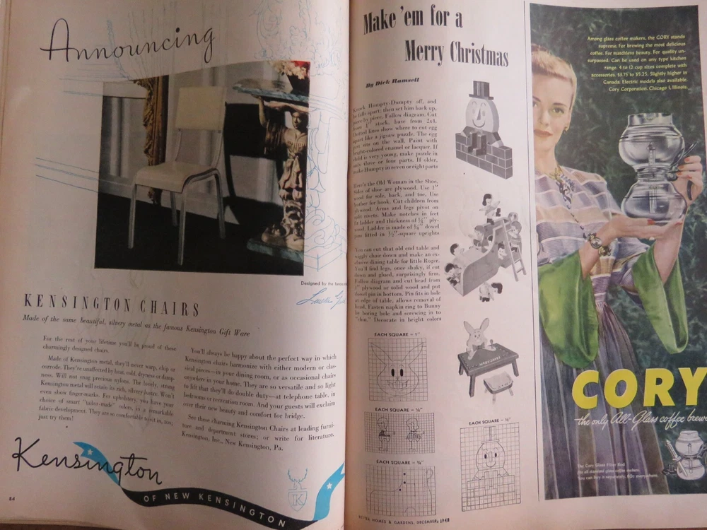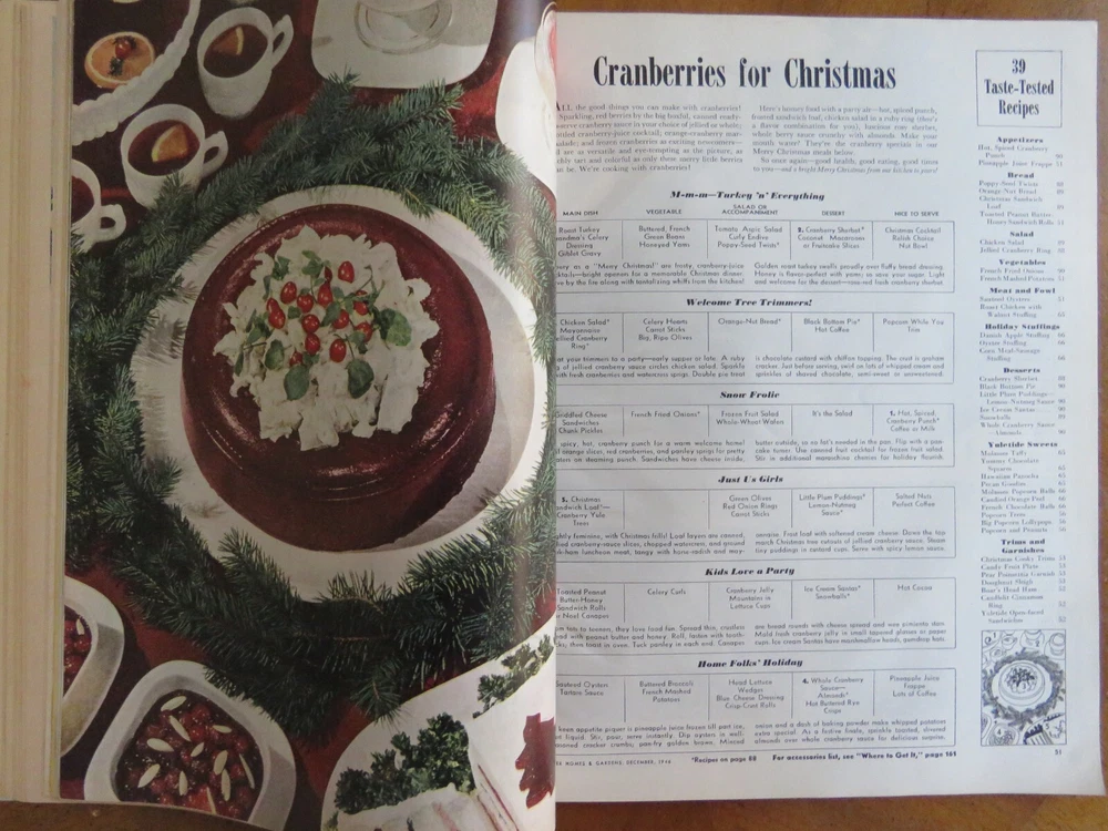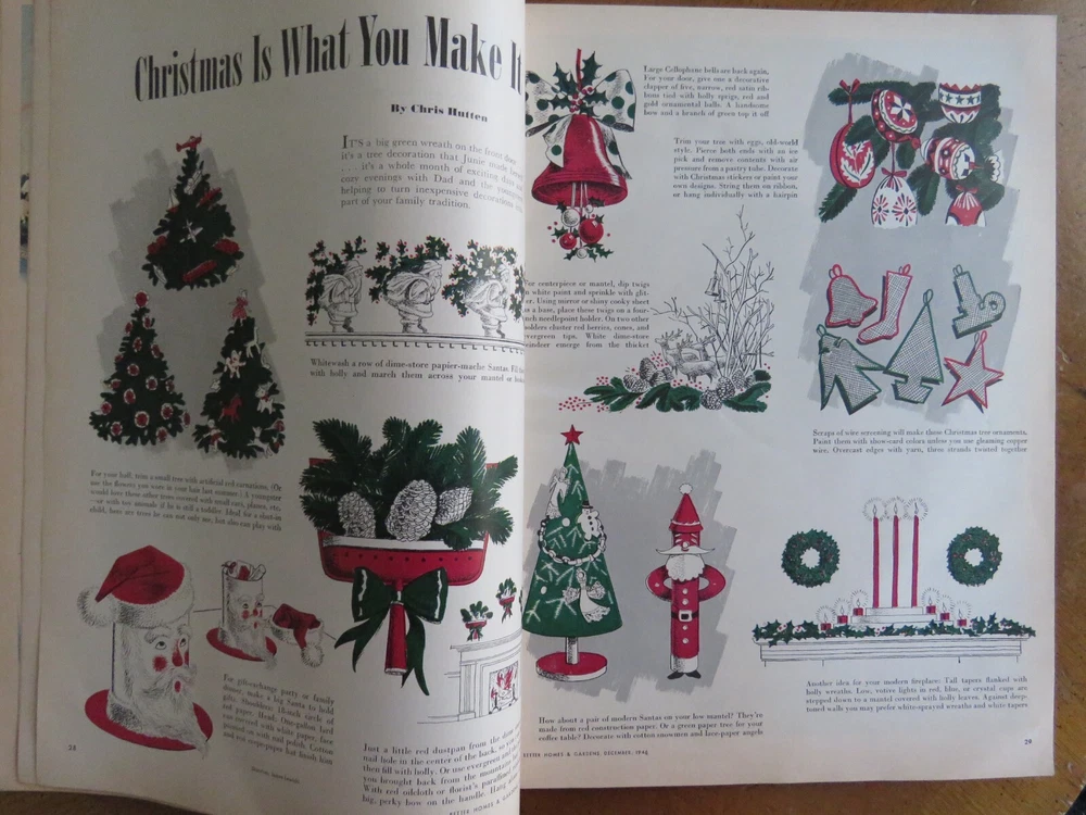 BETTER HOMES AND GARDENS December 1946 was published by Meredith Publishing Company. Cover photo of a boy in bed by Anton Bruehl. Articles include "Profile of a Real Santa Claus," "The Building Bandits are Back in Business", "Mexico - Where the Hunt is Half the Bargain", 162 pages. Also, Christmas gifts, recipes and cooking, plants, toys, home decor such as fireplaces. Full-page ads. Softcover measures 10" x 13." Very good condition. Pages tanned. Tear at mid-spine and vertical crease near spine from opening. Thanks for looking!