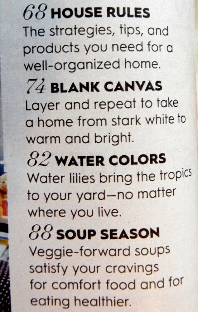 January 2019 Volume 97, Issue 1 Up for your consideration is a gently used, Great Condition, January 2019 BETTER HOMES AND GARDENS MAGAZINE!! The front features: Cool, calm and decluttered. Real-life organizing ideas. ; We love soup - winter comfort in a bowl. ; Plus Much, Much More!! 110 Pages Total!! Nice Combination of Home Decor, Health, Nutrition, Crafts, Gardening and Recipes!! I've included a picture of the Table of Contents and Many Pictures to further show the magazine. It's in Good Condition Overall! Please see the pictures for more details. Place your mouse (arrow) over the pictures, to zoom in and get a closer look! If more pictures are needed, please feel free to ask. -- This magazine will be shipped in an envelope that will be marked "Do Not Bend" and "Fragile" in Red Marker, to help prevent bending. Please feel free to ask any questions you may have! *I purchased an Antique Store and will be listing new items, just about every day!! This is the reason I'm able to sell such a Wide Variety of Rare & Collectible Items!! I've also been a "Collector" myself, since I was a small girl. Some items listed will be from my personal collections. Please Check Back Daily!!* *I'm planning to get married to my high school sweetheart (after 12 years of dating) and am currently selling items to try to save up money for our wedding and to start a family. Please feel free to make me an offer on items. I'm open to all reasonable offers! --------------------------------------------------------------------------------------------------------------------------------------------------------- Add me to your Favorite Sellers! I'm Always Listing New Items in my STORE - One2RememberCollectibles! Thanks for Looking!! ------------------------------------------------------------------------------ I combine shipping, please ask for specifics! (Combined shipping, does not mean free shipping on the second item. The shipping prices will be combined, for a lower price than if they were purchased separately.) I always package everything very well to help ensure that nothing will break. - Check my feedback. :-) Payments must be made within 5 days of winning the auction/listing. I'll Ship the Winning Product within 1 Business Day of receiving payment. ALL items get scanned at the post office, for proof of shipment. USPS Shipping Includes Tracking ! Shipments will only be made to Confirmed Shipping Addresses, that are included when the purchase is made. There will be no change of address available, after payment is made. Please make sure that all of your information is correct before submitting it. Please ask any questions you may have, before you purchase the item. For U.S. Buyers: Shipping Insurance Will be Included , when Priority Shipping is purchased. I provide the "Guaranteed 3 Day Shipping" option for many of the items in my store. If for some reason the item doesn't get to you in the "guaranteed time" please understand that this is not my fault in any way, but the fault of the Post Office. As promised in my listing, I will ship out all purchases within 1 business day of receiving payment. Depending on the time of the year and how busy they are, the post office may be a bit slower with shipments. I'm happy to help in any way possible, but am not responsible for them holding up to their promised shipping time. eBay will help with any problems that occur. Please Do Not leave negative feedback for shipping times, as I will hold up to my promised handling time of 1 business day. I will do my best to get it shipped out the same day, if payment is made before 8am PST (and possibly after). I greatly appreciate your understanding that I'll do everything I can to get it to you in the Guaranteed 3 Days!! For International Buyers: Some International shipping prohibits Tracking and/or Delivery Confirmation. If it's available, for the priority shipping price paid, I Will include it! Insurance will not be included with International Purchases. *If you're interested in shipping insurance, contact me Before you make your purchase. I can then make a revision and include it into the shipping price (if it's available for your country). All revisions need to be done Before purchases are made.* Please ask any questions you may have, before you purchase the item. INTERNATIONAL BUYER'S PLEASE NOTE: IMPORT DUTIES, TAXES AND CHARGES ARE NOT INCLUDED IN THE ITEM PRICE OR SHIPPING CHARGES. THESE CHARGES ARE THE BUYER'S RESPONSIBILITY. PLEASE CHECK WITH YOUR COUNTRY'S CUSTOMS OFFICE TO DETERMINE WHAT ADDITIONAL COST WILL BE PRIOR TO BIDDING/BUYING. THESE CHARGES ARE NORMALLY COLLECTED BY THE DELIVERING FREIGHT (SHIPPING) COMPANY OR WHEN YOU PICK THE ITEM UP. - DO NOT CONFUSE THEM FOR ADDITIONAL SHIPPING CHARGES. WE DO NOT MARK MERCHANDISE VALUES BELOW VALUE OR MARK ITEMS AS GIFTS. - U.S. AND INTERNATIONAL GOVERNMENT REGULATIONS PROHIBIT SUCH BEHAVIOR. -------------------------------------------------------------------------------------- 100% Customer Satisfaction Is My Goal! FEEDBACK We All crave Feedback. After you have received your item, please let me know that you are satisfied with your purchase by posting Positive Feedback for my store. I will then post Positive Feedback about you within 1 Business Day. If you're thinking about posting neutral or negative feedback, I ask that you contact me first. Remember, communication can resolve most problems. --------------------------------------------------------------------------------------- Please disregard - Personal seller message: Box #422