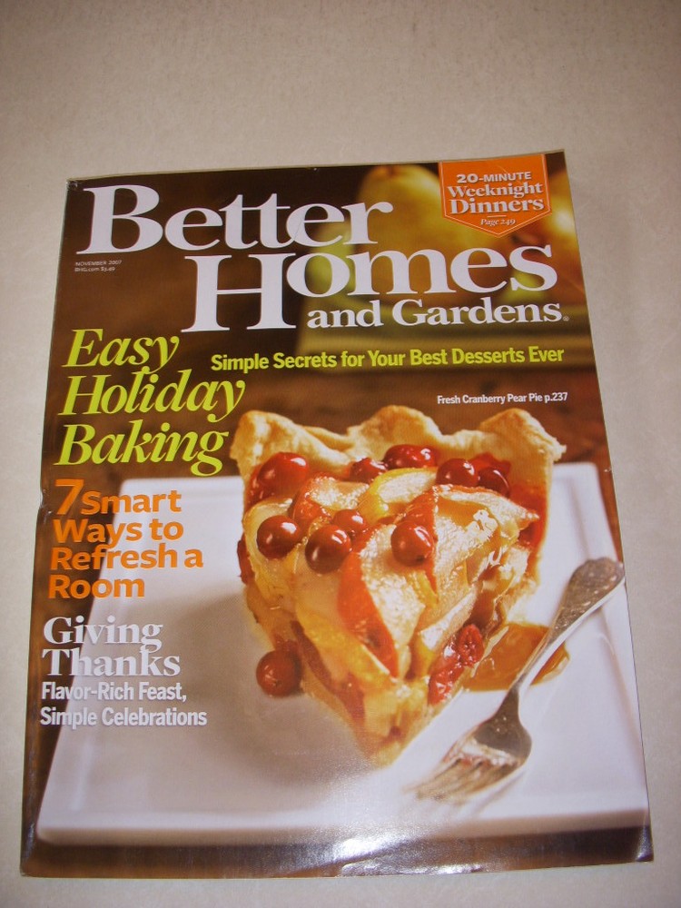BETTER HOMES AND GARDENS Magazine, NOVEMBER 2007, EASY HOLIDAY BAKING, SIMPLE SECRETS FOR YOUR BEST DESSERTS EVER, 20-MINUTE WEEKNIGHT DINNERS, 7 SMART WAYS TO REFRESH A ROOM, GIVING THANKS: FLAVOR-RICH FEAST SIMPLE CELEBRATIONS! Condition of the Magazine is Excellent (Minimal Wear and No Address Label)! We Have Many S imilar Items Listed! Combine Lots to Save on Shipping! The Item Pictured is the Item You Will Receive! Grading Just a few words on my grading - I consider myself conservative when it comes to grading but should you disagree I have a Return For Any Reason Policy! Return Policy If you don't like your item for any reason you can return it within 30 days of receipt. No questions asked. I ask that you pay the return shipping because I describe the items in great detail. I also require that you email me in advance of any return. Shipping Information Item will be shipped via USPS and will be packaged securely. Combine lots to save on shipping . I have many similar items listed! Payment Information I accept PayPal. Bid With Confidence! Powered by eBay Turbo Lister The free listing tool. List your items fast and easy and manage your active items.
