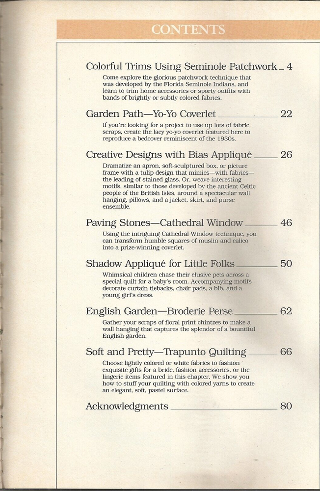 Welcome to 513.s.marino BETTER HOMES and GARDENS SPECIAL PATCHWORK ~~VINTAGE © 1989 ~~ Techniques of Seminole Patchwork, Bias Appliqué, Shadow Appliqué and Trapunto with a variety of projects. 80 PAGES SHIPPING INCLUDES TRACKING NUMBER. PLEASE REQUEST INVOICE FOR SHIPPING DISCOUNT IF BUYING MORE THAN ONE ITEM! SHIPPING TIME: 1 BUSINESS DAY AFTER CLEARED PAYMENT IS RECEIVED. SMOKE & PET FREE HOME!