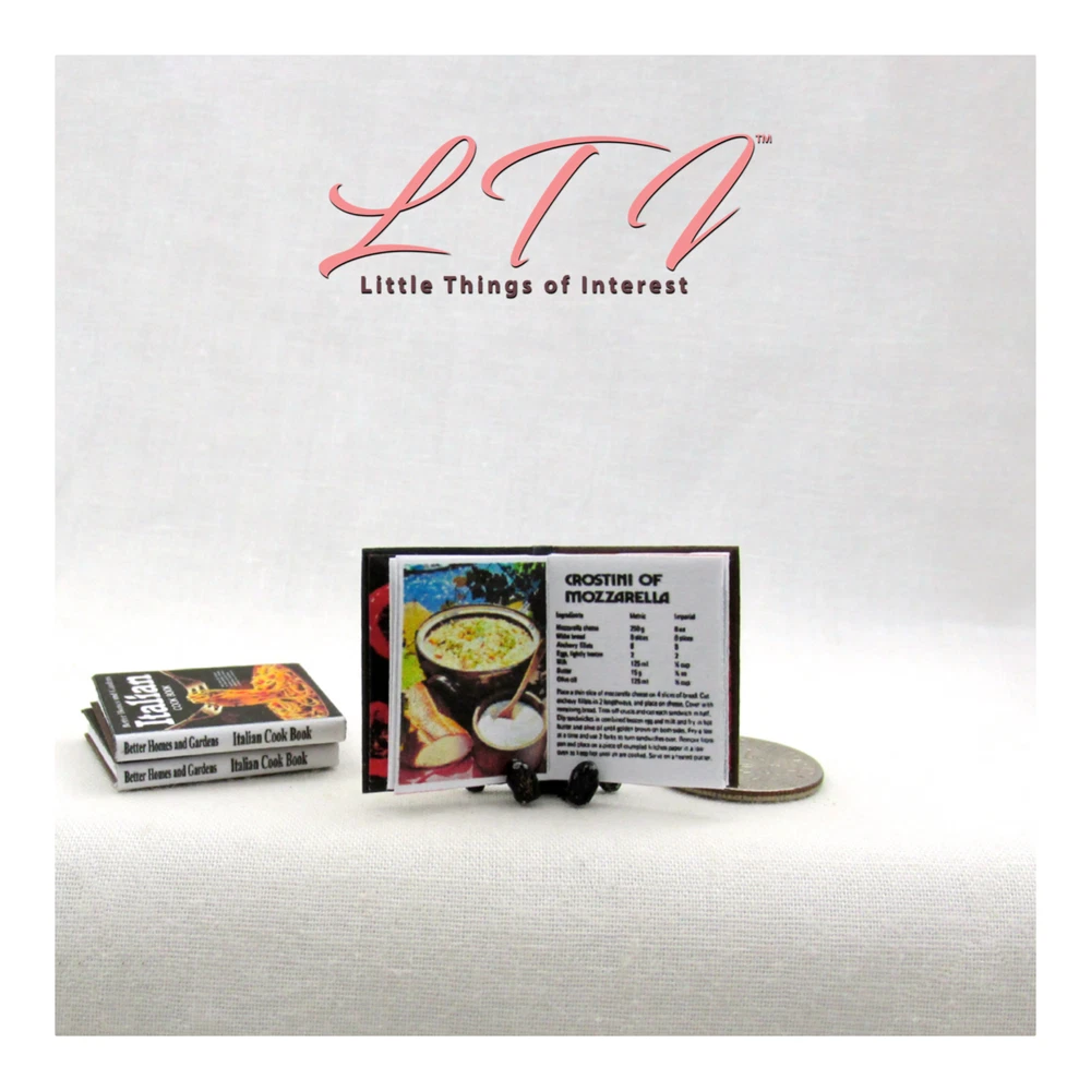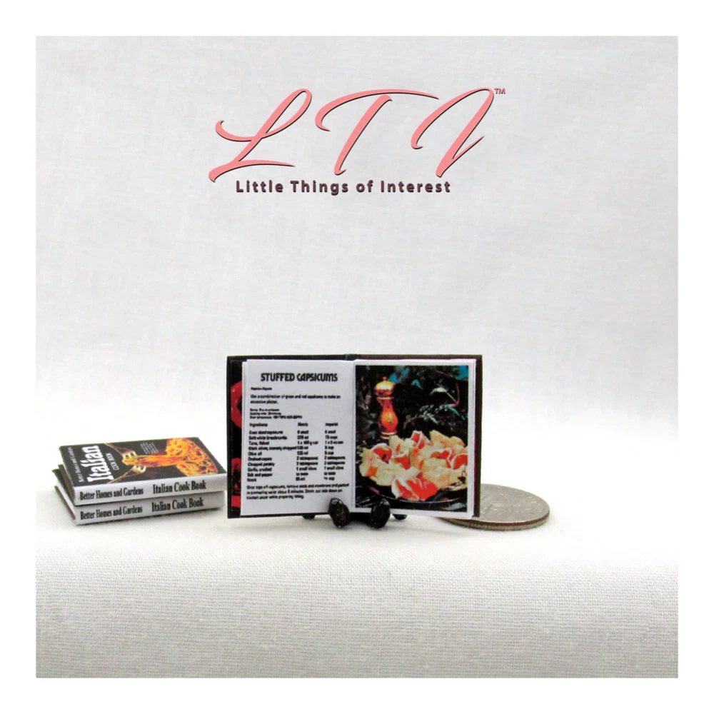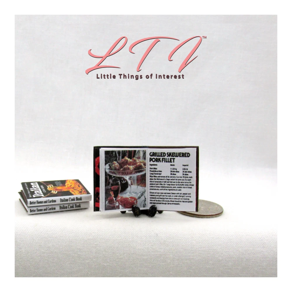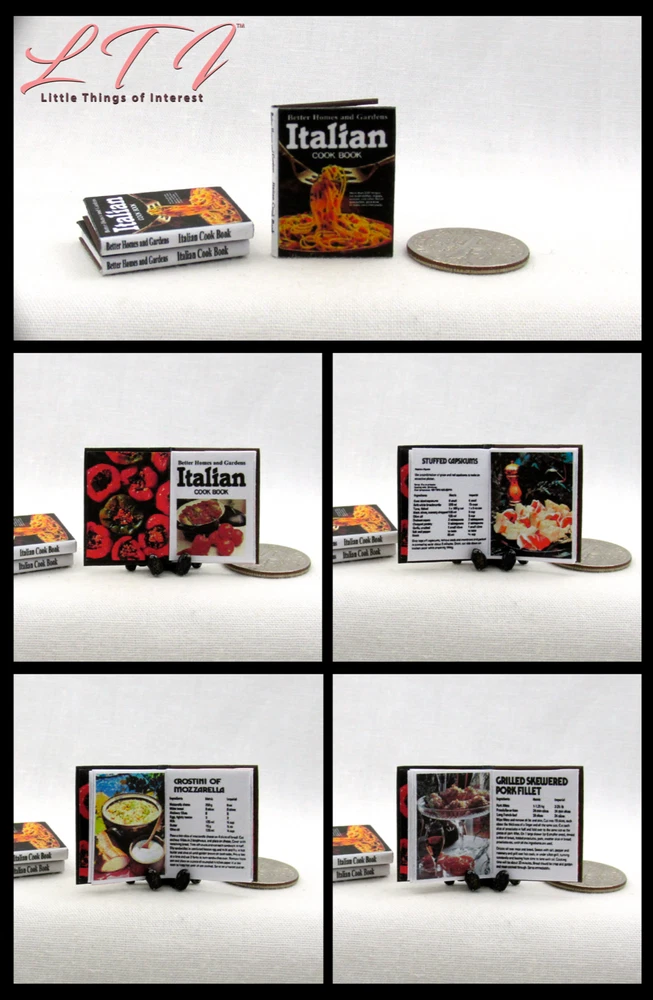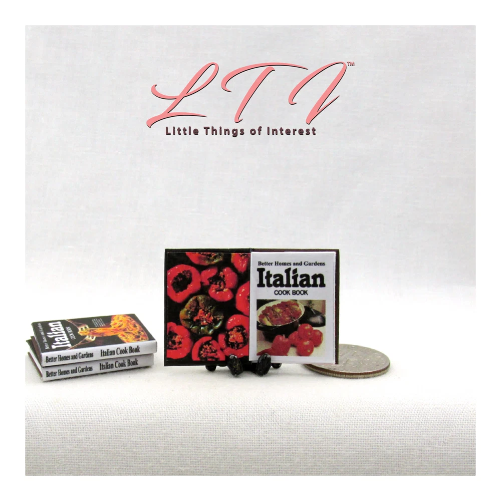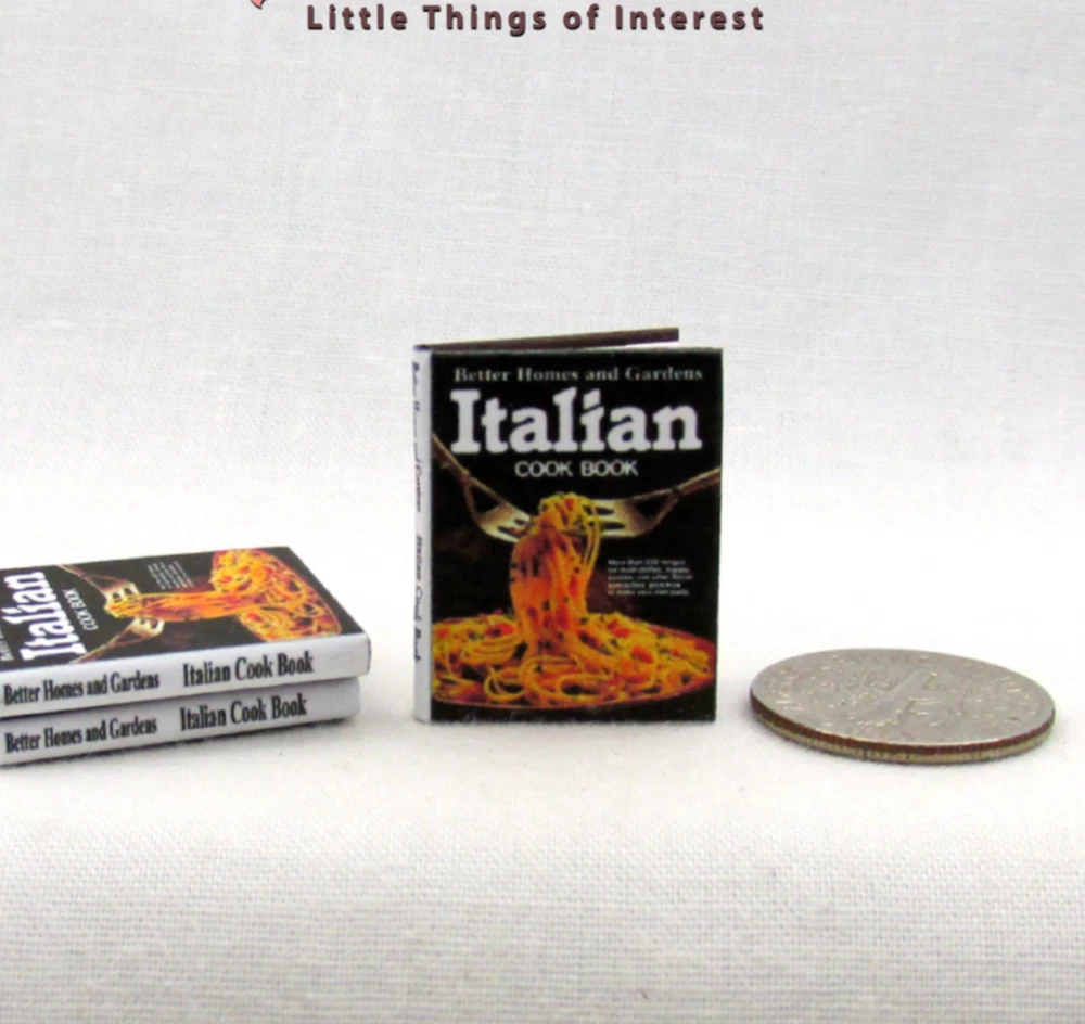My miniature Better Homes and Gardens Italian Cookbook in 1:12 scale has 14 pages with several full color illustrations. This miniature book measures approximately 7/8 of and inch high by 11/16 of an inch wide. The title is prominent on the spine so it will look GREAT open or closed. Other items sold separately. I personally design every book which can take more than 2 hours. Scaled perfectly for your dollhouse, room box, dollhouse coffee table or a book shelf in your miniature scene. All my books that are 1/12 scale have miniature hard covers. Most of my miniature books are readable BOOKS. They are printed on both sides of the page with a readable passages. All of my books interior paper, hardcover book board covers, ink and glues are acid-free archival quality. THANKS FOR LOOKING! Please leave positive feedback for me when the item arrives, I will do the same for after you have left feedback for me. If for some reason there is an issue with the item when it arrives, please contact me ASAP to address it. To get shipping discounts don't use the buy it now button. Instead click add to cart, shipping discounts will be automatically applied at the end of check out. UK buyers may need to log into eBay.com to see cart option . **INTERNATIONAL BUYERS ..... PLEASE READ ** Import duties, taxes and charges are NOT included in my items price or shipping charges. These charges are the buyer’s responsibility. Please check with your country’s customs office to determine what these additional costs will be prior to bidding/buying. These charges are normally collected by the delivering freight (shipping) company or when you pick the item up – do not confuse them for my shipping charges. I will not mark merchandise values below value or mark items as ‘gifts’ - US and International government regulations prohibit such actions. © 2012 Terrie Wertz LittleTHINGSofInterest.com All rights reserved