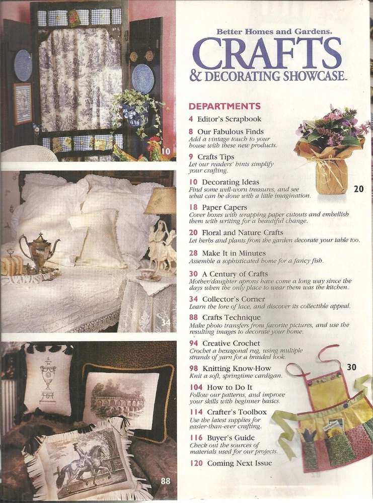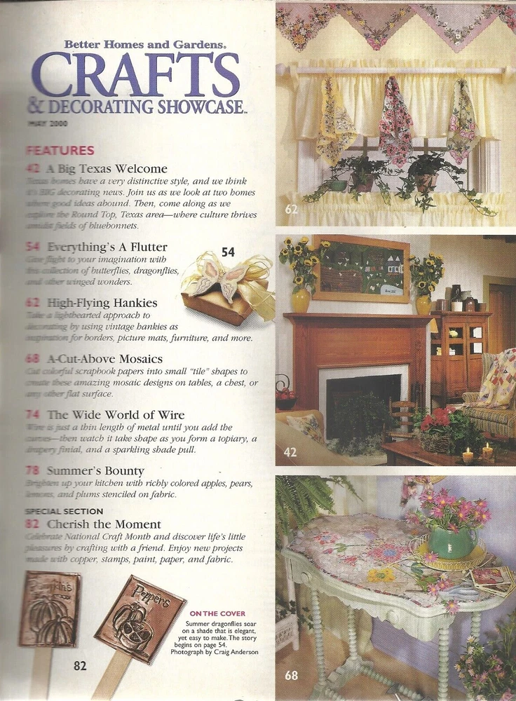 Welcome to 513.s.marino BETTER HOMES & GARDENS CRAFTS & DECORATING SHOWCASE CRAFTS COLLECTION ~~MAY © 2000; VOLUME 6, ISSUE 3 ~~ • ROOMS COME ALIVE WITH OUTDOOR ACCENTS • DECORATING IDEAS • VINTAGE LINENS • WONDERFUL WIRE PAPER MOSAICS • FLEA MARKET MAKEOVERS 120 PAGES SHIPPING INCLUDES TRACKING NUMBER. IF NOTIFIED , I WILL BE HAPPY TO COMBINED SHIPPING FOR EACH ADDITIONAL MEDIA MAIL ITEM SHIPPED WITHIN THE UNITED STATES. PLEASE REQUEST INVOICE FOR SHIPPING DISCOUNT IF BUYING MORE THAN ONE ITEM! SHIPPING TIME: 1 BUSINESS DAY AFTER CLEARED PAYMENT IS RECEIVED. SMOKE & PET FREE HOME!