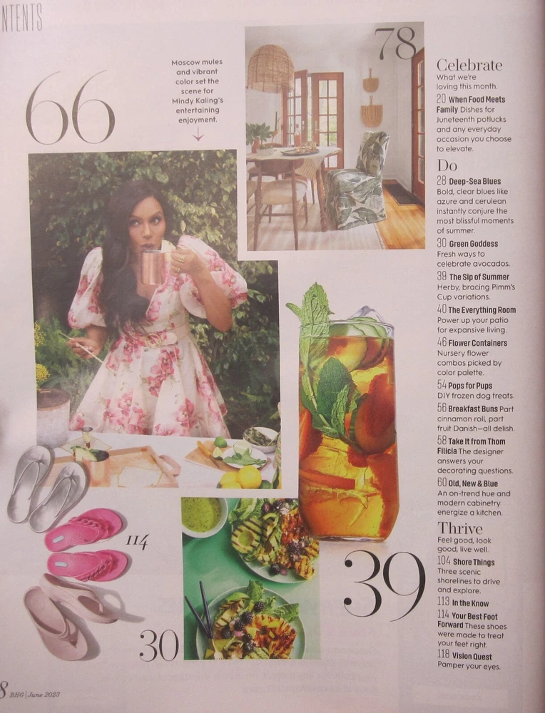 Better Homes & Gardens is the fourth best selling magazine in the United States. It focuses on interests regarding homes, cooking, gardening, crafts, healthy living, decorating, and entertaining. The 120-page June 2023 issue's cover story is: Life in Color - The Colorful, Joy-Filled World of Mindy Kaling - The versatile Hollywood star brings her signature bold, bright style to outdoor entertaining. Other featured articles include: LIFE IN COLOR Pizza Farm - Bring the "pasture to pie" trend home with inspiration from Luna Valley Farm in Iowa. Playing for Keeps - Clever updates and lots of white paint refresh a cottage on Lake Michigan. Making a Splash - As the weather heats up, this New York garden reaches its flower-filled crescendo. CELEBRATE - What we're loving this month. When Food Meets Family - Dishes for Juneteenth potlucks and any everyday occasion you choose to elevate. DO Deep-Sea Blues - Bold, clear blues like azure and cerulean instantly conjure the most blissful moments of summer. Green Goddess - Fresh ways to celebrate avocados. The Sip of Summer - Herby, bracing Pimm's Cup variations. The Everything Room - Power up your patio for expansive living. Flower Containers - Nursery flower combos picked by color palette. Pops for Pups - DIY frozen dog treats. Breakfast Buns - Part cinnamon roll, part fruit Danish-all delish. Take It from Thom Filicia - The designer answers your decorating questions. Old, New & Blue - An on-trend hue and modern cabinetry energize a kitchen. THRIVE - Feel good, look good, live well. Shore Things - Three scenic shorelines to drive and explore In the know Your Best Foot Forward - These shoes were made to treat your feet right. Vision Quest - Pamper your eyes. IN EVERY ISSUE Editor's Letter Off the Page Dream: Inspiration of the Month Cookbook Stylemaker Due to changes in USPS policy and a recent postage rate increase, I have had to raise my shipping costs. I have a number of other issues of this magazine as well as other titles. I will apply a shipping discount on multiple purchases. Please let me know if you are interested.