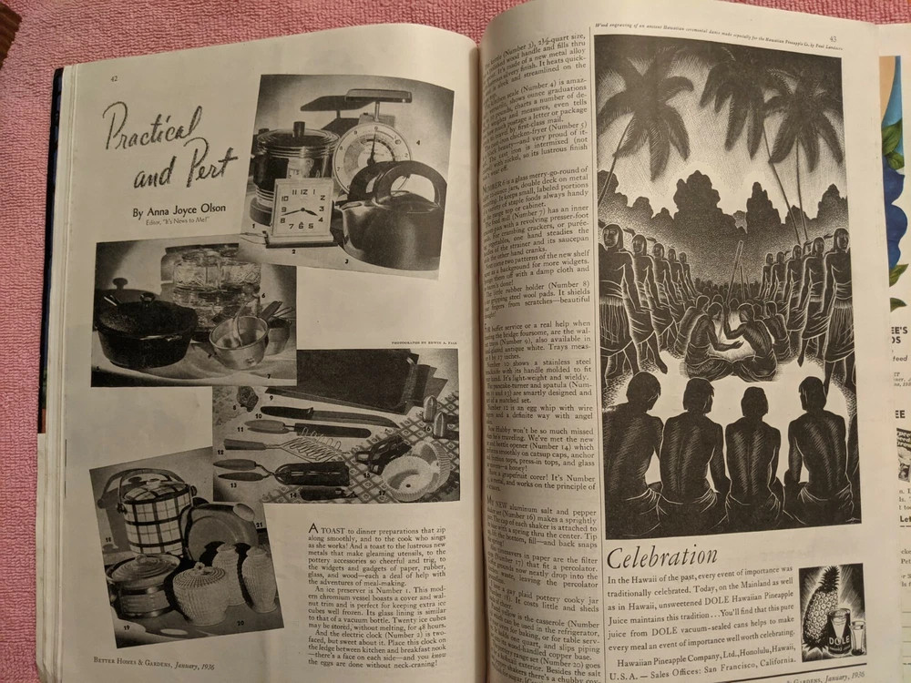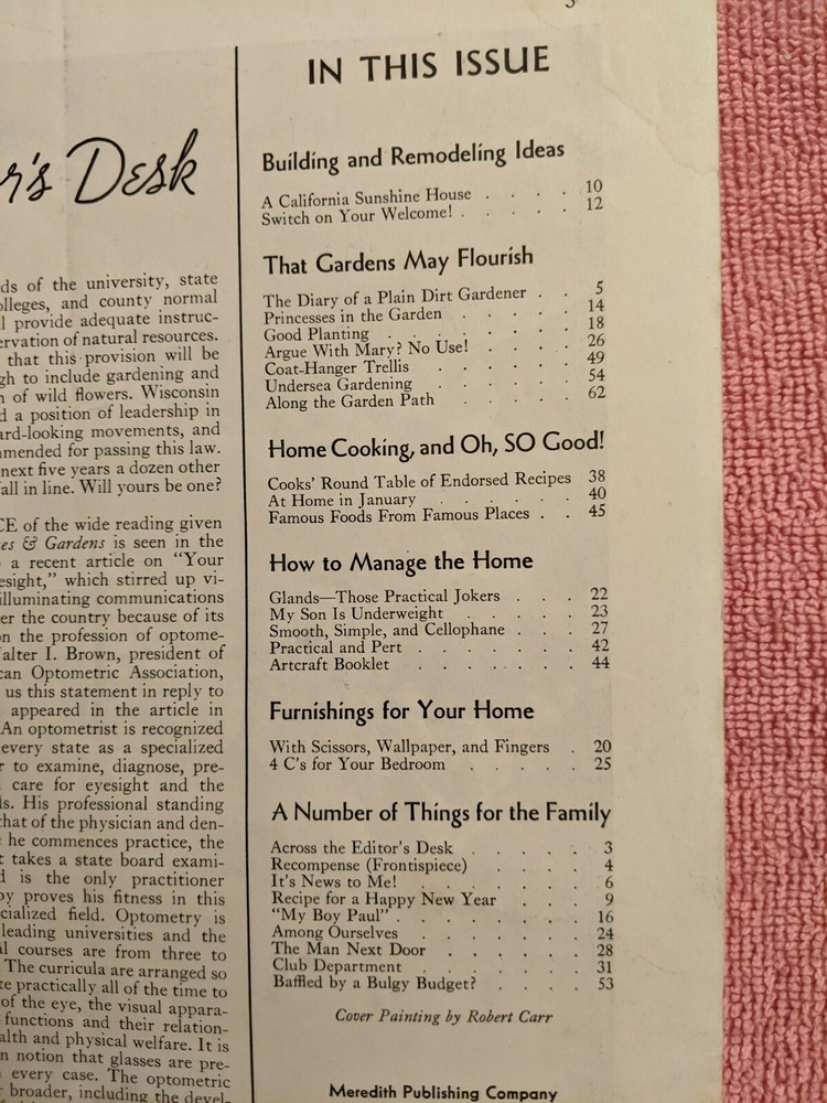 BETTER HOMES & GARDENS, January 1936, 62 Pages, Gardening, Cooking, Great Ads Vintage magazine in good, clean condition. Clean text. 62 pages. Some light wear to cover. Please see photos for the Table of Contents. $3.50 domestic shipping. International shipping at cost. Please email with any questions. Better Homes and Gardens (magazine) From Wikipedia, the free encyclopedia Jump to navigation Jump to search For the Australian television show, see Better Homes and Gardens (TV series) . Better Homes and Gardens August 1924 issue, the first under the Better Homes and Gardens name Editor-in-chief Stephen Orr Categories home economics, interior design Frequency 12 issues/year Publisher Dotdash Meredith (US) Pacific Magazines (Australia) Total circulation (2015) 7,624,910 [1] Year founded 1922 ; 100 years ago Country USA Based in Des Moines, Iowa Language English Website bhg.com (US) bhg.com.au (Australia) ISSN 0006-0151 Better Homes and Gardens is the fourth best selling magazine in the United States . The editor in chief is Stephen Orr. Better Homes and Gardens focuses on interests regarding homes, cooking , gardening , crafts , healthy living, decorating , and entertaining. The magazine is published 12 times per year by Dotdash Meredith . It was founded in 1922 [2] by Edwin Meredith , who had previously been the United States Secretary of Agriculture under Woodrow Wilson . The original name was Fruit, Garden and Home from 1922 to 1924. The name was changed to Better Homes and Gardens beginning with the August 1924 issue. Better Homes and Gardens is one of the " Seven Sisters ", a group of women's service magazines.