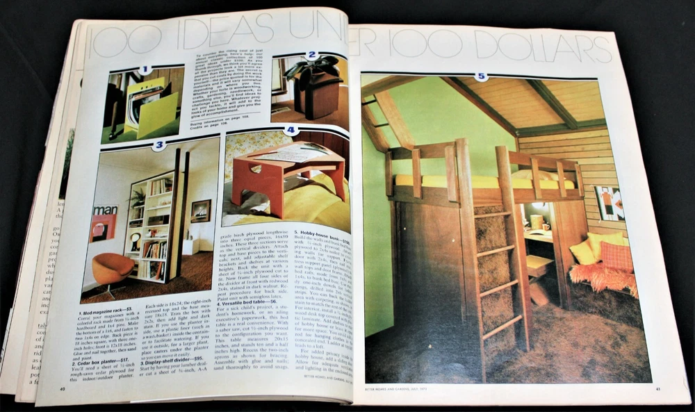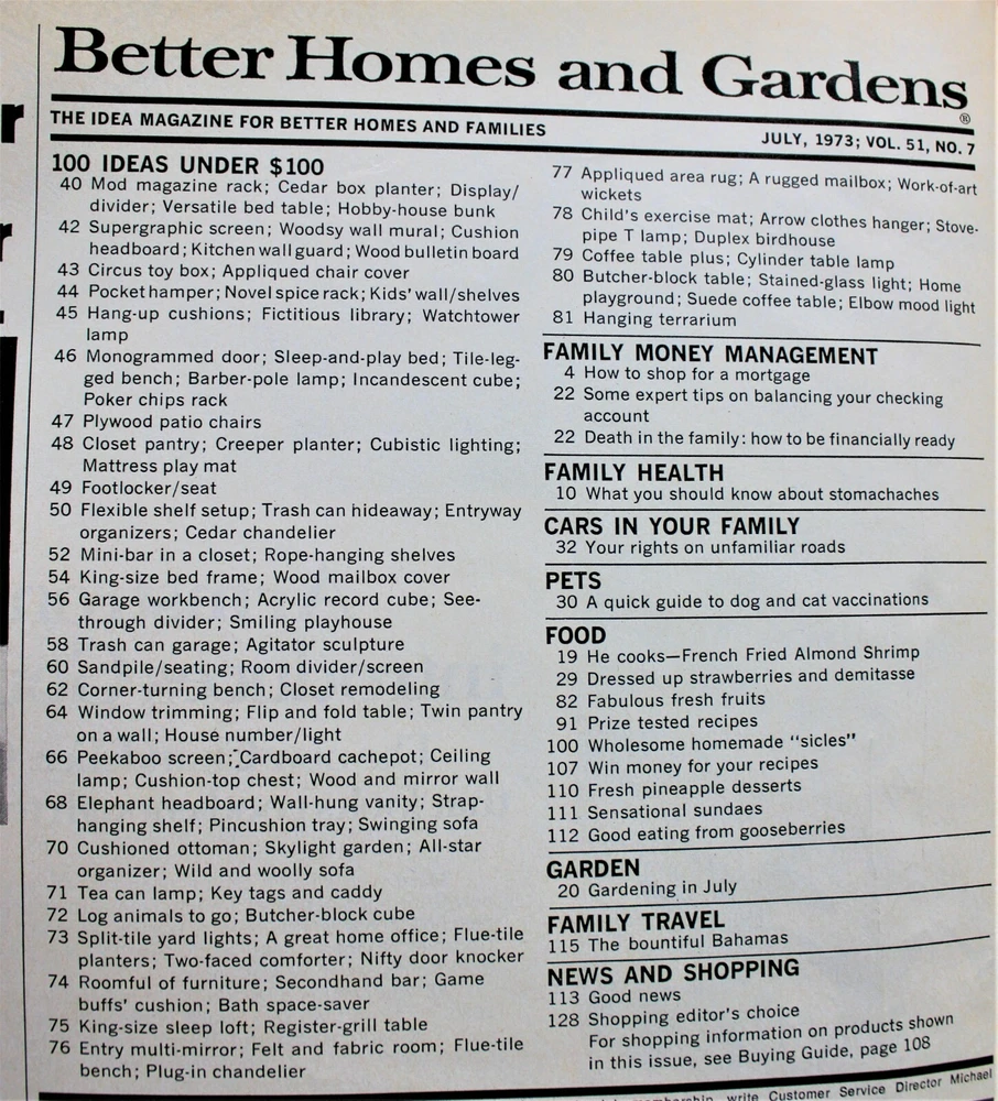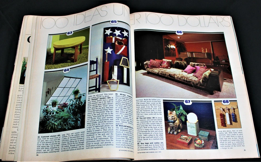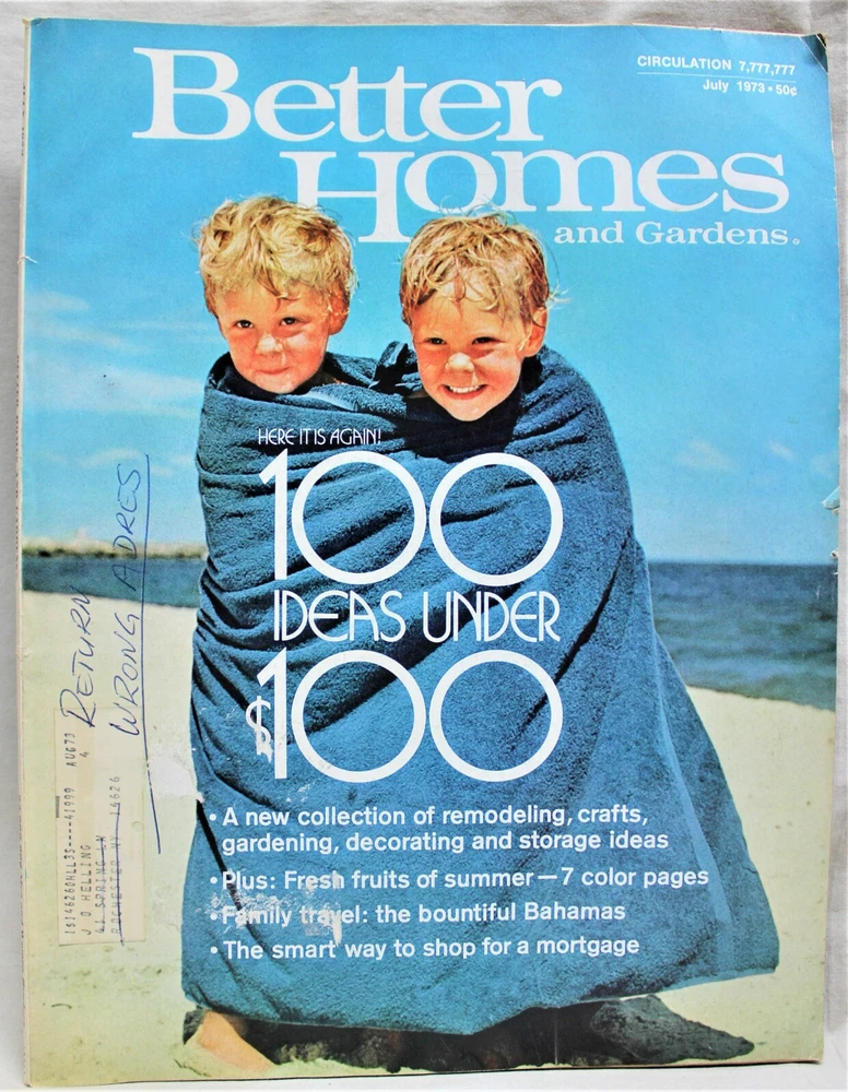 Vintage Better Homes & Gardens magazine of interior decorating, entertaining, landscaping, home building and advertising circa July 1973. Cover titled: 100 Ideas Under $100. Measures 10 1/2 X 13 inches in size (27 X 33cm) and is 120 pages in length. Publication is an authentic original in good condition as shown in photos. Every buyer gets a MyStoreRewards invitation for cash back