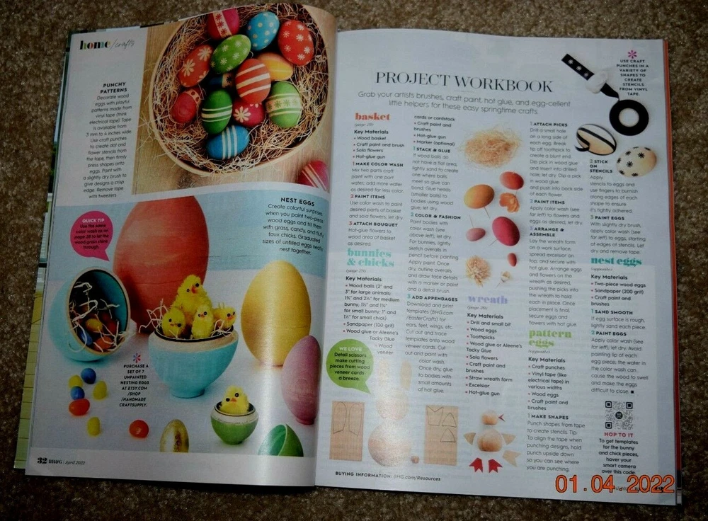 BETTER HOMES & GARDENS MAGAZINE"BIRGHT IDEAS - EASTER DECORATIONS," 108 Pages, April 2022, New; Great Room Alcove, Desk Top, Folder II - 01 Better Homes & Gardens recently announced they will no longer be publishing hard copy magazines. Has been Stored in a Humidity and Temperature Controlled , Smoke-Free Environment. THESE ARE ACTUAL PHOTOS OF THE ITEM FOR SALE; NOT STOCK PHOTOS. BEWARE OF STOCK PHOTOS, WHICH MAY NOT REPRESENT THE SPECIFIC OFFER. Will be Shipped in Stiff Card Board to insure that it arrives flat, with crisp and Sharp Corners, in Excellent Condition. We Normally mail the Next Business Day, unless Out-of-Town attending a Living History Event.