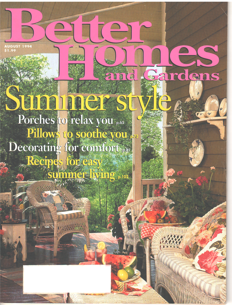 ************************************ BETTER HOMES & GARDENS Magazine August 1994 Pages: 148 COVER/SOME PAGES HAVE CREASES/WRINKLES/TINY TEAR OTHERWISE IT IS IN VERY GOOD CONDITION MAILING LABEL HAS BEEN COVERED ************************************ THANKS FOR LOOKING