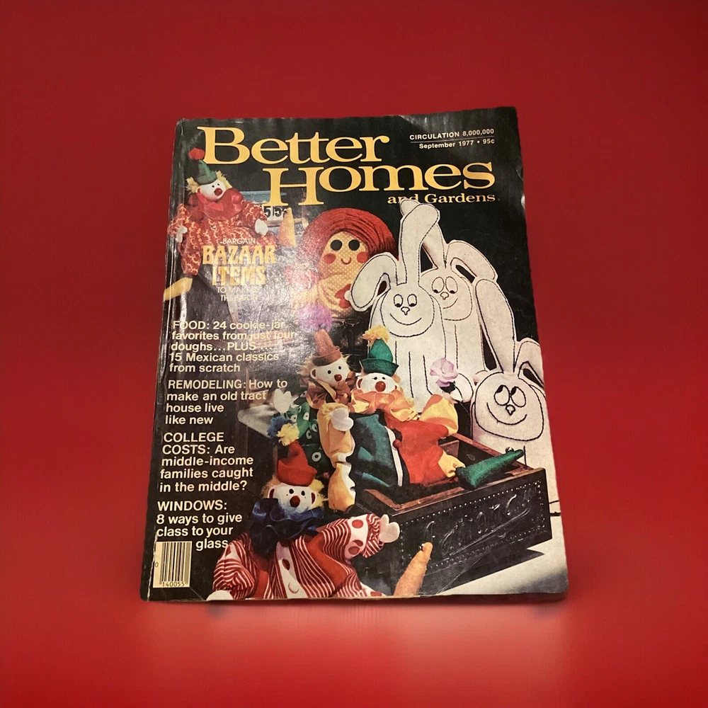"BETTER HOMES & GARDENS Magazine from September 1977, is an English-language monthly publication focusing on home and garden topics. The issue features a section on making bazaar items by batch, catering to readers interested in DIY projects and creative home decor ideas. It was manufactured in the United States."
