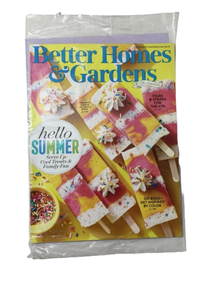 BETTER HOMES & GARDENS-JULY/AUGUST 2022-HELLO SUMMER 100th Anniversary. •Still in plastic mailer. •Magazine still has mailing address so we covered it up for the photos. Packaged and shipped securely to avoid bending. We Ship Quick! Thank you for your consideration!