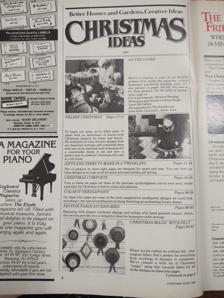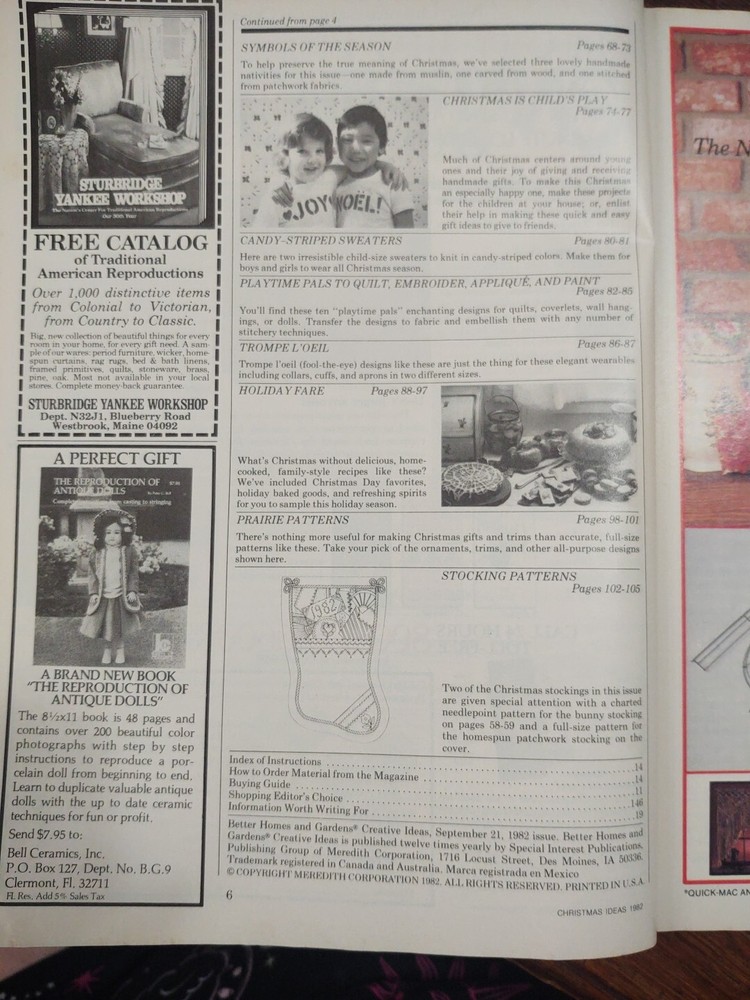 BETTER HOMES and GARDENS Creative Ideas Christmas Ideas Magazine 1982 I am selling my full collection of Christmas Ideas magazines from 1980 to 2023, This one shows its age but still good. It has a bookplate on the inside cover. The front cover has a small tear and some wrinkles (see pictures). All the patterns are intact. Please look at the pictures carefully before bidding. There may be differences in computers in picking up the various colors. The item pictured is the exact one you will receive. I do not accept returns unless I have grossly misstated an item. I ship by the lowest rate and I do combine shipping. Let me know if you are interested in any other items. Please Note: magazines CANNOT be shipped Media Mail. They contain advertisements and are not allowed. Smoke free and pet free home. Import duties, taxes and charges are not included in the item price or shipping charges. These charges are the buyer's responsibility and will generally be collected by your post office or customs office on delivery of the item. Please check with your country's customs office to determine what these additional costs will be prior to bidding/buying. I cannot mark any items as a gift or undervalue any items on a customs form.