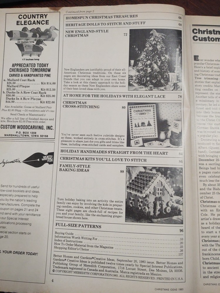 BETTER HOMES and GARDENS Creative Ideas Christmas Ideas Magazine 1983 I am selling my full collection of Christmas Ideas magazines from 1980 to 2023, This one shows its age but still good. It has a bookplate on the inside cover. The cover has a small tear and there is a small stain at the top of the magazine (see pictures). All the patterns are intact. Please look at the pictures carefully before bidding. There may be differences in computers in picking up the various colors. The item pictured is the exact one you will receive. I do not accept returns unless I have grossly misstated an item. I ship by the lowest rate and I do combine shipping. Let me know if you are interested in any other items. Please Note: magazines CANNOT be shipped Media Mail. They contain advertisements and are not allowed. Smoke free and pet free home. Import duties, taxes and charges are not included in the item price or shipping charges. These charges are the buyer's responsibility and will generally be collected by your post office or customs office on delivery of the item. Please check with your country's customs office to determine what these additional costs will be prior to bidding/buying. I cannot mark any items as a gift or undervalue any items on a customs form.