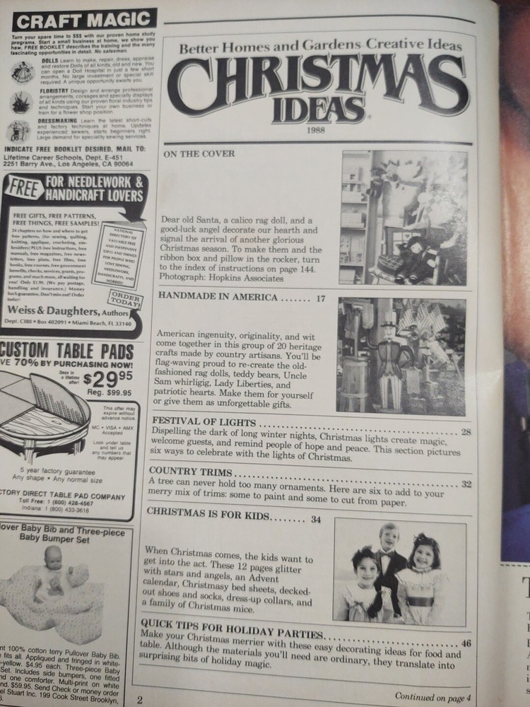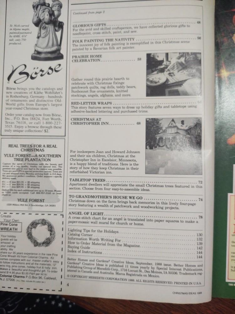 BETTER HOMES and GARDENS Creative Ideas Christmas Ideas Magazine 1988 I am selling my full collection of Christmas Ideas magazines from 1980 to 2023, This one shows its age but still good. It has a bookplate on the inside cover. All the patterns are intact. Please look at the pictures carefully before bidding. There may be differences in computers in picking up the various colors. The item pictured is the exact one you will receive. I do not accept returns unless I have grossly misstated an item. I ship by the lowest rate and I do combine shipping. Let me know if you are interested in any other items. Please Note: magazines CANNOT be shipped Media Mail. They contain advertisements and are not allowed. Smoke free and pet free home. Import duties, taxes and charges are not included in the item price or shipping charges. These charges are the buyer's responsibility and will generally be collected by your post office or customs office on delivery of the item. Please check with your country's customs office to determine what these additional costs will be prior to bidding/buying. I cannot mark any items as a gift or undervalue any items on a customs form.