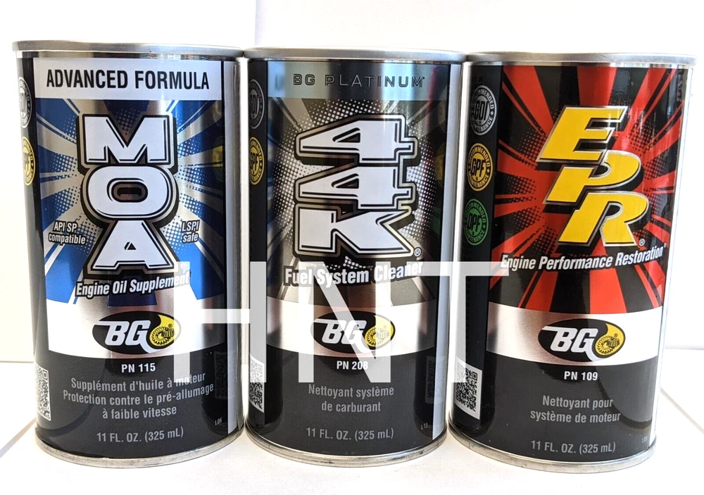BG 44K PLATINUM Fuel System Cleaner BG Engine Oil Supplement MOA BG Engine Performance Restoration EPR Complete Oil Change Kit Made in the USA BG Platinum® 44K® Restores performance Restores fuel efficiency Increases power output Reduces exhaust emissions BG Advanced Formula MOA®: Allows safe extended oil change intervals Ensures reliability of critical engine components Prevents excessive oil consumption Extends engine life BG EPR®, PN 109: softens and dissolves hard-to-remove deposits from piston rings cleans micro passageways to maintain the critical hydraulic function of components such as valve train actuators and turbochargers restores fuel economy and power prevents excessive oil loss