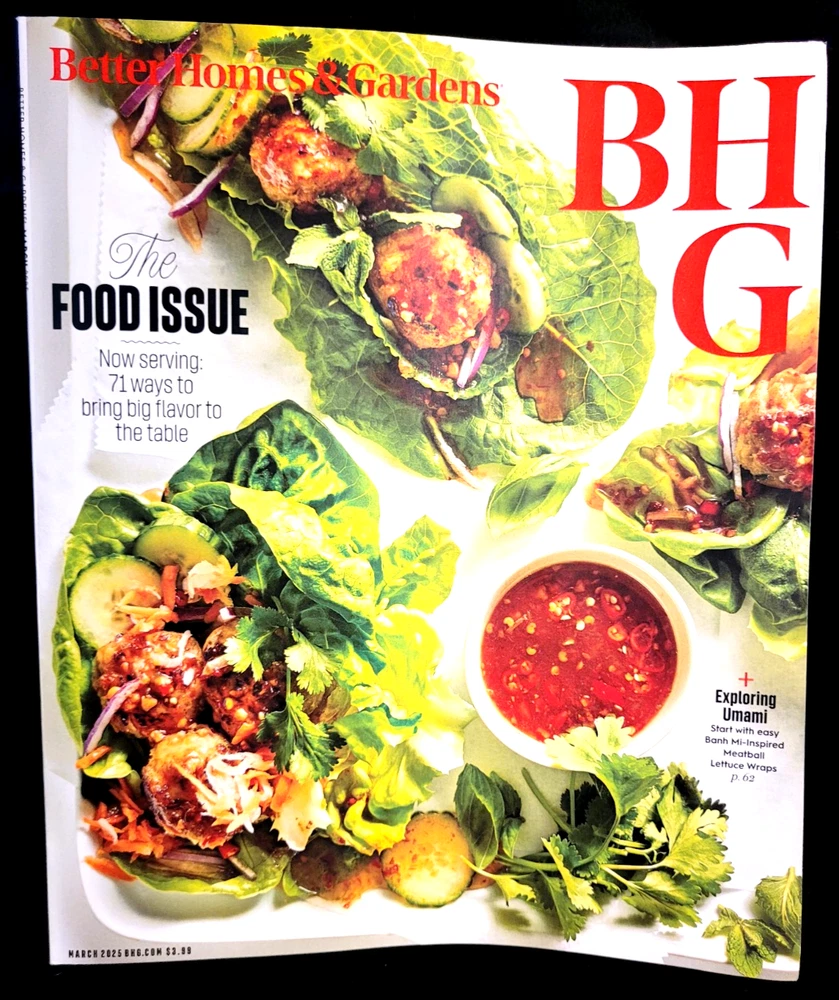 BHG Better Homes & Gardens March 2025 Magazine The Food Issue Umami & Decorating Delve into a world of culinary inspiration with the March 2025 issue of Better Homes & Gardens, showcasing an array of mouth-watering recipes and delightful garden-themed content. As issue number 3 of volume 103, this edition is a treasure trove for enthusiasts of both home gardening and gastronomic delights. The Food Issue magazine offers a comprehensive look at spring's bounty, featuring vibrant salads, hearty main courses, and delectable desserts that will breathe new life into your dining experience. With its engaging content in English, this publication serves as a delightful guide for anyone passionate about bringing the joys of home-grown ingredients to their table. Shipping of this item may be delayed due to the USPS and Covid delays. If there is a delay past the expected delivery date, please file a complaint with the USPS. I strive for optimum service. I ship within one business day with USPS. However, I do make mistakes. Please contact me with any problems before you leave negative feedback. If, for any reason you are unhappy with your purchase I will always work with you to resolve the issue. If you feel I do not deserve a five star rating on any category, please let me know so that I may work to correct the problem in the future. I am not a big corporate company, but a small home based company working to survive and thrive. Any comments that will help me to provide optimum service will always be appreciated. Your feedback will be left after I hear from you! Thank you for looking. (SH)