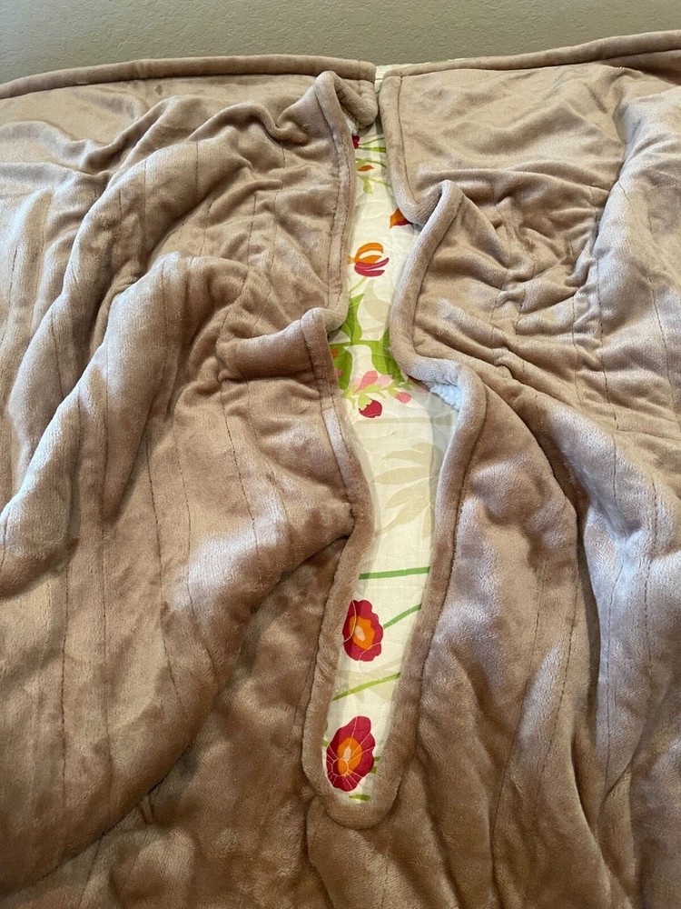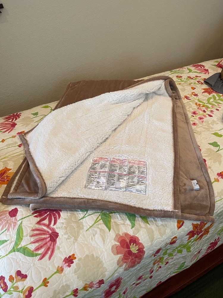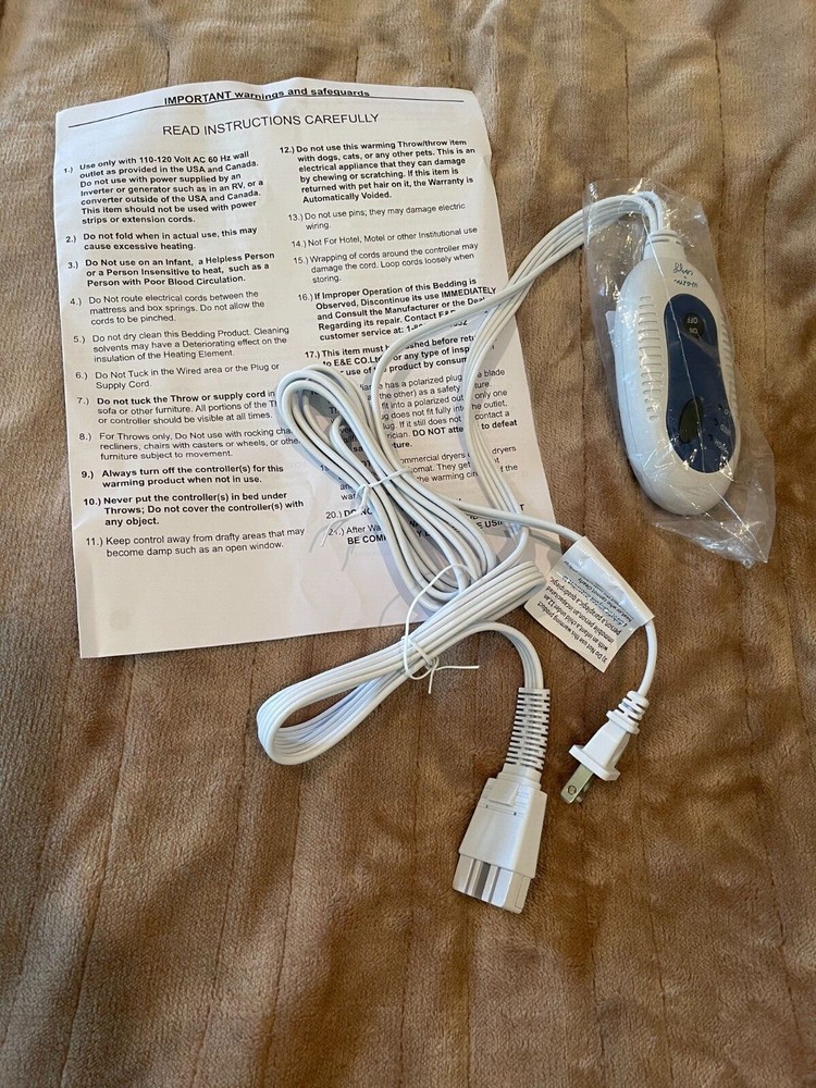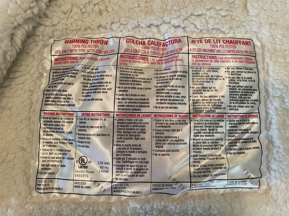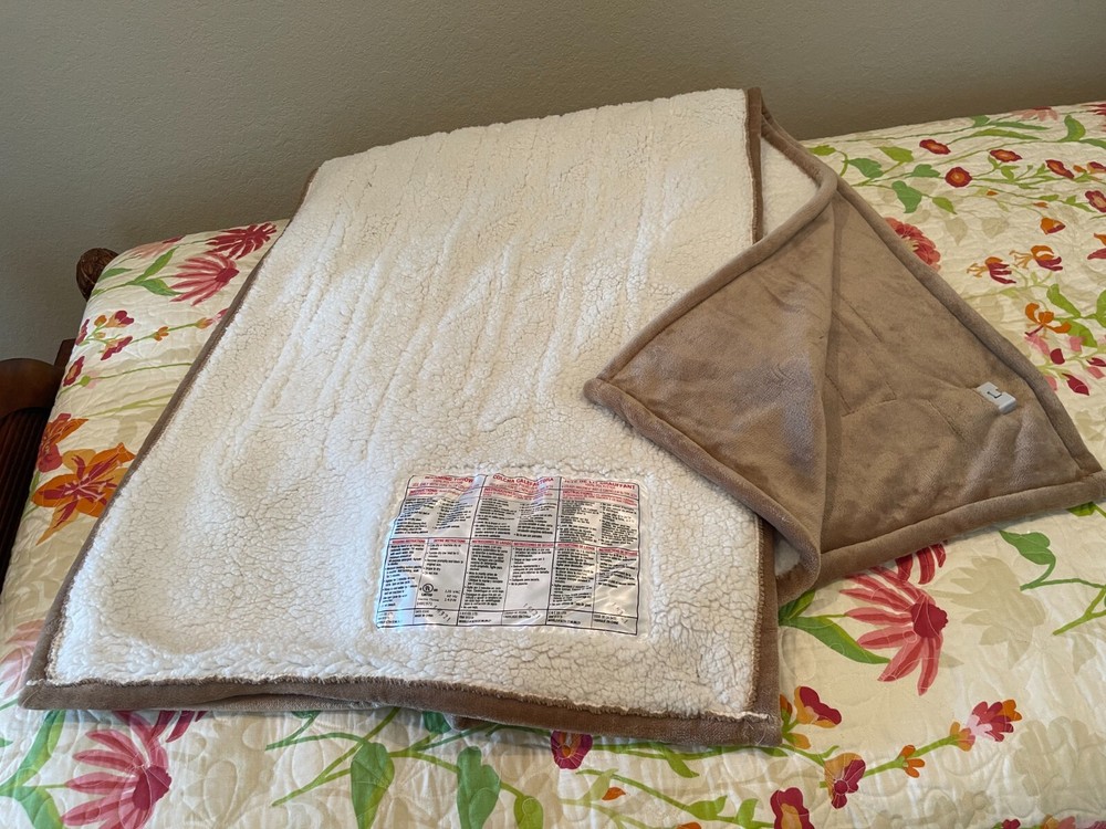 WARM AND COZY AUTOMATIC THROW BLANKET WITH WARMING CONTROLS. WASH BY HAND OR IN A WASHER WITH DIRECTIONS. CAMEL COLOR WITH WHITE.HAS A SPLIT IN THE THROW SO YOU CAN PUT IT AROUND YOUR SHOULDERS.MEASURES ABOUT 68 X 50". PRE-OWNED NEW AND NEVER USED. PLEASE VIEW MY PICTURES AND IF QUESTIONS CONTACT ME. I DO NOT SHIP TO ALASKA, HAWAII OR OUTSIDE THE CONTINENTAL UNITED STATES. 966