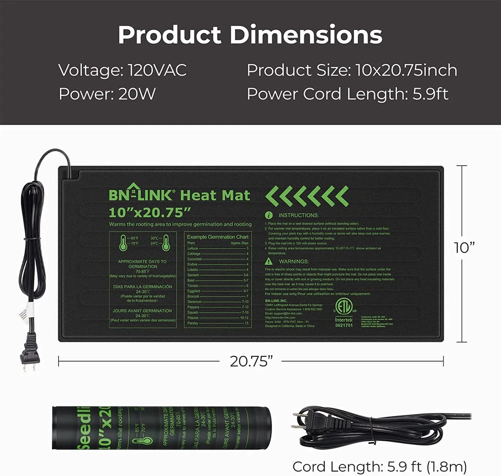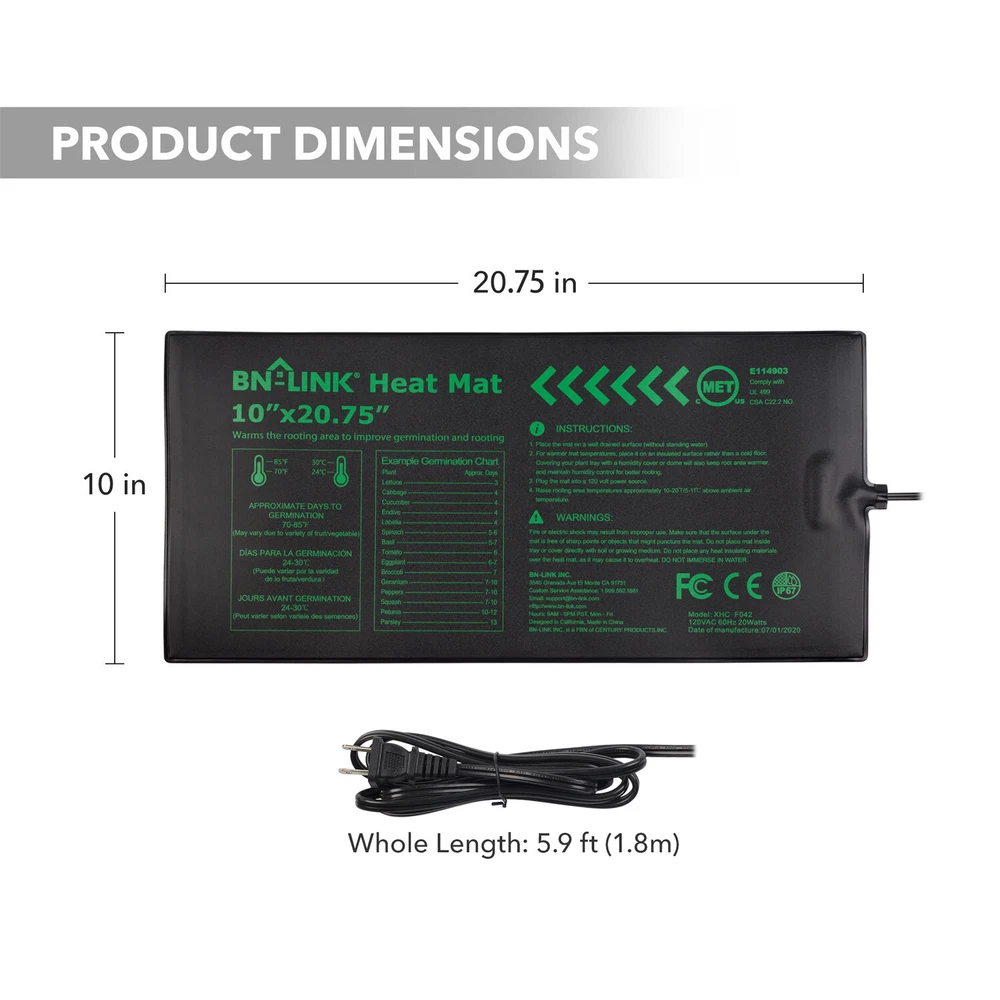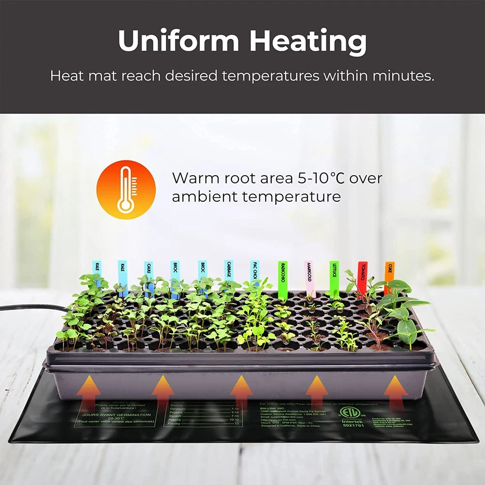 The BN-LINK Durable Seedling Heat Mat Warm Hydroponic Heating Pad Waterproof 10" x 20.75" is your perfect solution for providing constant warmth to either your pets, seeds, kombucha or anything else you may want to keep warm! Have peace of mind that your beloved furry/scaly buddy or plants are cozy and being properly nurtured all day and night. CONSISTENT HEATING : The BN-Link Durable Seedling Hydroponic Heating Pad provides consistent, uniform heating at temperatures around 68°F to 86°F (20°F to 30°F), which are the perfect temperatures for seed starting and cutting propagation. NICE AND TOASTY FOR YOUR PLANTS : The protective film on the heating mat ensures that the roots of your plants are warm, but never scorched. DURABLE AND FLEXIBLE : Not only is the BN-Link Durable Seedling Hydroponic Heating Pad built to last with its durable, water-resistant material, the Heating Mat also remains elastic and flexible. Perfect for most conditions indoors/outdoors. Each unit comes with BN-Link’s strong 15-month warranty. EASY SETUP : Nothing difficult or convoluted here! All you gotta do is pull it out of the box and plug it in. GREAT SIZE AND SAFE : The BN-Link Durable Seedling Hydroponic Heating Pad 10" x 20.75" mat is the perfect size for standard 1020 trays. The heating film and insulation allows the mat to reach the desired temperatures within minutes without burning your seeds. Size: 10" x 20.75" Package Includes:1X Seedling Heat Mat 10" x 20.75" Water-Resistant Design Getting humid or wet where you are? No problem! This heating mat has a water-resistant design that allows it to endure any kind of wet conditions (Note: please do not submerge the product in water). Ideal Germination Temperatures Our propagation mats raise the temperature of the soil by 5-11℃ over ambient (room temperature) to promote faster germination and strong, healthy seedling. They are useful for rooting cuttings. Easy to Use with a Heat Mat Put our heat mat under seed starting flats, celled trays, or even individual pots and then plug it into an electricity source. You are done! Have Total Control Over Your Habitat With fast heating and the uniform heat distribution on the BN-LINK heating mat, you’ll be able to heat up the area quickly and consistently. Perfect for indoor gardening, for better plant growth and flower seed germination, spring seedling starts and cutting propagation. Effortless Application With the strong back adhesive, you’ll have the ability to place this heating mat anywhere you need. Just peel off the sticker and you are good to go. Energy Efficient and Easy to Clean Using only 20W, its energy efficiency and low maintenance features allow you to just set heat mat up and relax with your pets! For easy maintenance, just wipe down the mat to easily maintain the cleanliness of the heating mat! SHIPPING FEEDBACK PAYMENT ABOUT US RETURN SHIPPING - Order should be processed and shipped after one full business day cycle. - Free shipping only valid within U.S. - Buyer will be responsible for covering any shipping costs if the shipping address is incorrect and the package is delivered to the wrong address. - Shipping cost will not be deducted for local pick up - Seller not liable for any duty fees, or brokerage fees for International orders FEEDBACK We aim to earn positive 5 star feedback for every item. If you are happy with your purchase please take 30 sec to leave positive 5 star feedback. If you have any issues with your purchase please contact us directly using eBay’s message service to resolve the issue, so that we can earn your positive 5 star feedback. PAYMENT We only accept payment methods requested We provide free USPS first class mail service within US. We also offer USPS priority mail service within US and international shipping via eBay’s Global Shipping Program (GSP). Please inquire with eBay about cost & availability. SHIPPING TIME: We ship all items the same business day of your cleared payment before 15:30 PST. (Excluding holidays and weekends) ABOUT US If you have any questions about our products, shipping, payments, or services, you can always contact us via ebay's message. We will response within 1 hour normally, and no more than 24 hours. RETURN - Returns for damages/defects/item not as described are covered by our company if claimed within the stated 30 day warranty period. After the 30 day warranty period, no claims may be made for a refund. -If the item is defective after 30 days, normally, we will always provide a new replacement. All our products have 1 year warranty. - If the buyer would like to return an item and the reason for return is not a result of our error, the buyer will be responsible for the return shipping costs.
