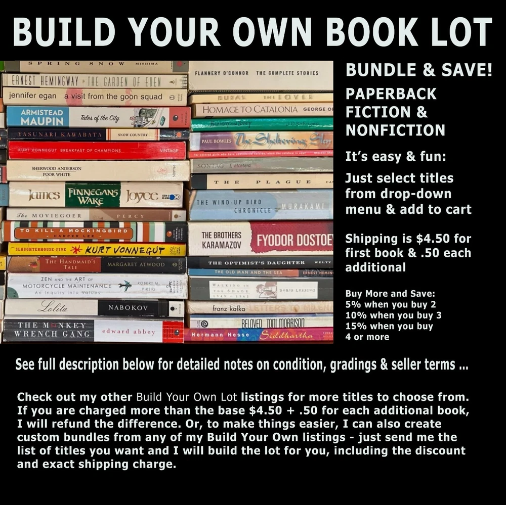 BUILD YOUR OWN LOT LISTING - 3 of 4 -- -- -- + + + -- -- -- The books you want to read! Banned Books | Subversive Books | Cult Novels | Outsider Lit | Existentialism | Mystery Novels | Drama | Eastern Philosophy | Contemporary Classics | European Authors | African American Literature Buy More and Save: 5% when you buy 2 10% when you buy 3 15% when you buy 4 or more ** Check out my other Build Your Own Lots for hundreds more titles to choose from - you can buy from all of them and I will refund the extra shipping charges OR - to make things easier - I can create a custom bundle from any of the books in those lots or anything else I have listed - so if you see some things you’d like, jsut send me the list and I'll build the lot for you with the discount and exact shipping charge. AVAILABLE TITLES: Author - Title - Grading - Price All books are trade paperbacks (sized approx. 5 in. x 8 in.) except those marked MMP , which are mass market paperbacks (4 in. x 7 in.) or Large PB which are generally 6 in. 9 in. (See below list of titles for details on my grading system) NEWEST ADDITIONS: The Saga of the Volsungs [Penguin Classics] (Fair, some pages wrinkled from a little moisture, some wrinkles on cover, minor reading wear) Ama Ata Aidoo - The Dilemma of a Ghost and Anowa (Good, a few scattered colored pencil marks, front cover has indentations and some creases) Margaret Atwood - The Handmaid’s Tail (VG-, some reading wear, minor rubbing along edges, light crease on front cover) Honoré de Balzac - Old Goriot [1959 Penguin Classics MMP] (G, signs of age, reading wear, foxing, rubbing along edges) Jacques Barzun - Darwin, Marx, Wagner: Critique of a Heritage [Second Edition - 1981 Univ. of Chicago Press] (G, spine sun-faded, some rubbing along edges, minor cover wear, light foxing on top page ends) Carl Bernstein and Bob Woodward - All the President’s Men [40th Anniversary Edition] (VG+, minor edge wear) Ambrose Bierce - The Devil’s Dictionary (VG) Robert Bly - A Little Book on the Human Shadow (G+, some rubbing along edges, light reading wear) Eric Bogosian - Drinking in America (G+) Archie Bongiovanni & Tristan Jimerson - A Quick & Easy Guide to They/Them Pronouns (VG, minor edge wear) Patricia Bosworth - Diane Arbus: A Biography (G, spine creased and slanted, reading wear, page ends discolored, rubbing along edges, small abrasion on front cover) Jeremy Brecher - Strike! [Revised and Updated Edition] (Fair, ex-library, stain on side page ends, rubbing along edges, creases on cover, corners somewhat curled - reading/studying copy) Bertolt Brecht - Galileo: A Play [1966 Black Cat MMP] (G, spine creased, some reading wear, minor edge and cover wear - pages clean and bright) Bertolt Brecht - Mother Courage (MMP) (G+, just some light foxing) (MMP) Brian Broome - Punch Me Up To The Gods: A Memoir ( G+, some reading wear, minor edge wear, corners slightly curled, else fine) Anthony Burgess - The Wanting Seed (VG-, pages show some mild reading wear, some minor edge wear and corners slightly curled, else fine.) Edmund Burke - Reflections on the Revolution in France (VG-) James M. Cain - Serenade [1978 MMP] (G, spine creased, reading wear, light indentations on cover) Albert Camus - The Fall [MMP] (G, some foxing, reading wear, minor rubbing along edges) Albert Camus - Resistance, Rebellion, and Death [MMP] (G, some reading wear and signs of age, light foxing, spine creased, minor edge and cover wear) Albert Camus - The Stranger (VG, minor edge and cover wear) Lewis Carroll - Alice in Wonderland & Through the Looking-Glass (G+, name written on bottom page ends) Carolyn Cassady - Off the Road: Twenty Years with Cassady, Kerouac, & Ginsberg (F, reading wear, rubbing along edges, corners curled and frayed) Carlos Castaneda - The Teachings of Don Juan: A Yaqui Way of Knowledge [MMP - 1973] (G+, some reading wear, signs of age, minor edge wear) Carlos Castaneda - A Separate Reality: Further Conversations with Don Juan (G+, some reading wear and mild signs of age, minor edge wear, light crease on spine - pages bright) Raymond Chandler - Farewell, My Lovely (Good, bit of a wave in book) Stephen Chbosky - The Perks of Being a Wallflower (VG-, some reading wear, minor edge wear) Sandra Cisneros - The House on Mango Street [25th Anniversary Edition] (VG, name written on inside front cover, else just mild reading wear) Arthur C. Clarke - The Fountains of Paradise (G, crease on front cover) J. M. Coetzee - Waiting for the Barbarians (Good) Joseph Conrad - Nostromo (MMP) (G+) Stephen Crane - The Red Badge of Courage and Other Stories [Penguin Classics] (VG-, small crease on cover, else just minor reading wear) Sloane Crosley - How Did You Get This Number ( G+, some reading wear, minor edge wear, corners slightly curled, else fine) Richard Dawkins - The Selfish Gene (Good, rubbing along edges and spine, small closed tear along edge of spine, some creases, blemishes and indentations on cover, corners somewhat curled) Vine Deloria, Jr. - Custer Died For Your Sins: An Indian Manifesto (Fair, top page ends wrinkled from some water damage - still a great reading copy) René Descartes - Meditations and Other Metaphysical Writings [Penguin Classics] (G, small amount of underlining, reading wear, creases on cover, univ. bookstore stickers on spine and back cover) Kristin Dombek - The Selfishness of Others: An Essay on the Fear of Narcissism (VG) Fyodor Dostoevsky - Crime and Punishment [Signet MMP] (VG-, light reading wear, a few dogeared corners, minor edge wear) Stephen Dunn - Different Hours (G, coating wrinkled along edge of cover, a few pencil marks) Edward F. Edinger - Ego and Archetype: Individuation and the Religious Function of the Psyche [1982 Pelican Books] (G, some scratches on front cover, corners slightly curled, some edge wear, pages have minor reading wear) Harlan Ellison - Angry Candy [Large PB] (Fair, some chips along edges of cover with a few missing bits on side and corners, foxing on page ends an