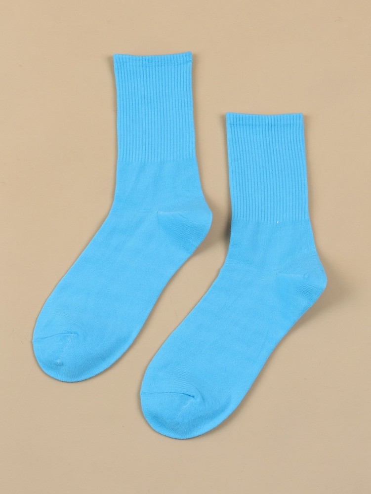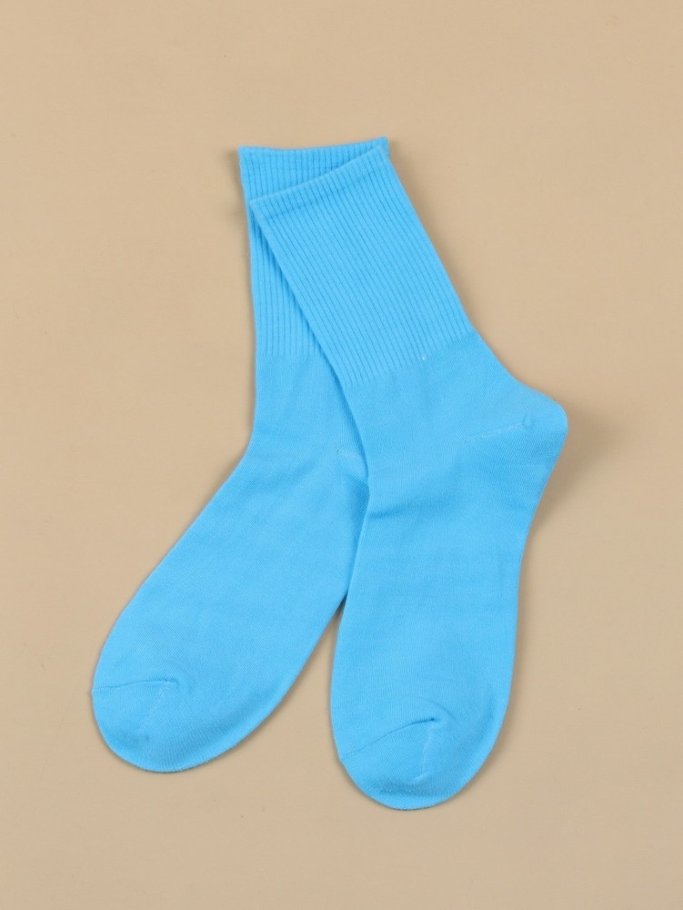 Color: Blue Composition: 100% Polyester Material: Fabric Pattern Type: Plain Socks Quantity: Single Pair Type: Crew Socks Care Instructions: Machine wash or professional dry clean Product Measurements in cm : Size Length Width one-size 19 8 Baby Blue Ribbed Crew Socks for Women Plain Socks Cozy Socks Fashion Socks Here we have our vibrant and playful line of Socks, where fun and fashion collide! These socks are designed to add a touch of joy and individuality to your wardrobe. With a wide range of unique patterns, bold colors, and quirky designs, our Socks are the perfect accessory to showcase your personality and make a statement. Key Features: Comfortable Fit: We understand the importance of comfort, which is why our socks are made with soft, breathable materials that provide a cozy and snug fit. They feature a blend of high-quality fabrics that keep your feet comfortable throughout the day, making them perfect for both lounging around and stepping out in style. Great Conversation Starters: Get ready for compliments when you step out wearing our Socks. These attention-grabbing accessories are excellent conversation starters and ice-breakers, sparking interactions and creating memorable moments wherever you go. Perfect Gift Idea: Looking for a fun and unique gift? Our Novelty Socks make an excellent choice. Whether it's for a birthday, holiday, or just to surprise someone special, these socks are sure to bring a smile to their face. Give the gift of joy and individuality with our playful and stylish socks. Durable Quality: We take pride in crafting socks that not only look great but also stand the test of time. Our Socks are made with high-quality materials and constructed with care to ensure durability and long-lasting enjoyment. Let your feet do the talking and embrace your unique style with every step. Upgrade your sock collection and add a splash of fun to your outfits. Get ready to turn heads and spread smiles wherever you go! Product: Baby Blue Ribbed Crew Socks for Women Plain Socks Cozy Socks Fashion Socks