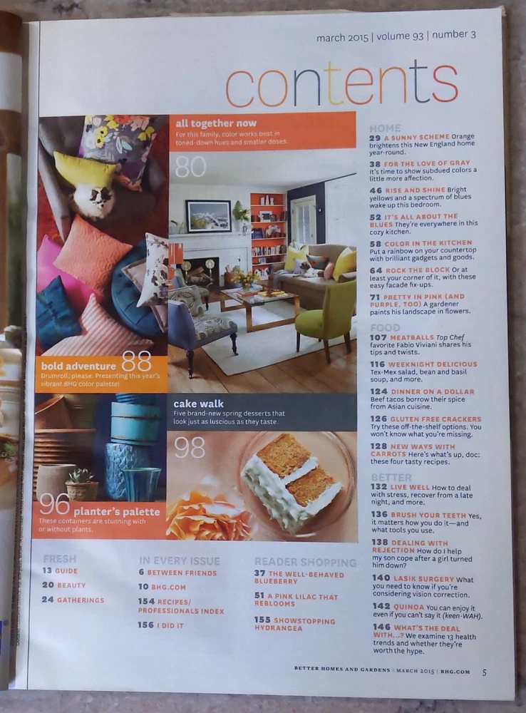 Better Homes and Gardens magazine offers home design, food and entertaining, garden, and lifestyle topics. It’s published by Meredith. This March 2015 issue has 156 pages and measures 8 by 11½ inches. This gently used issue is in perfect condition.