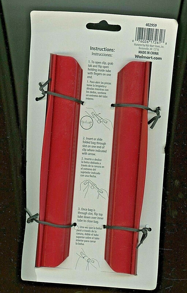 Most Orders Are Mailed... at 3:00 PM California Time... Monday Through Saturday. Bag Clips 2 Red Mainstays Brand 7" Wide Roll tubes apart to open. Put the open slot of tube onto the bag edge. Roll the tubes back together over the opened bags edge to hold it shut. I fold my bags over a couple times to help seal in the freshness. Brand New on retail card... take note that the retail card is torn, worn, and bent. see photos B6-C4 I might have new items listed each week before Friday. Settings on your computer/monitor/ect. Might show slightly different colors... so remember that as you try to match a certain color to an item. 100% Satisfaction is guaranteed... and a total refund is given... as soon as the item has been: recorded into eBay for a refund/return... and that item has been delivered back to us. We try to get orders packaged, and into the post office before 4 P.M. MST each day. On days that are bad weather, or the local post office is logging, one or two days late, with tracking scans ... those kind of conditions are outside of our control for an average speedy delivery. Our delivered orders' history is an expected average delivery, to arrive to a customer within 4 to 7 days after payment has been cleared. We try to respond to messages within 24 to 48 hours. Thank you.