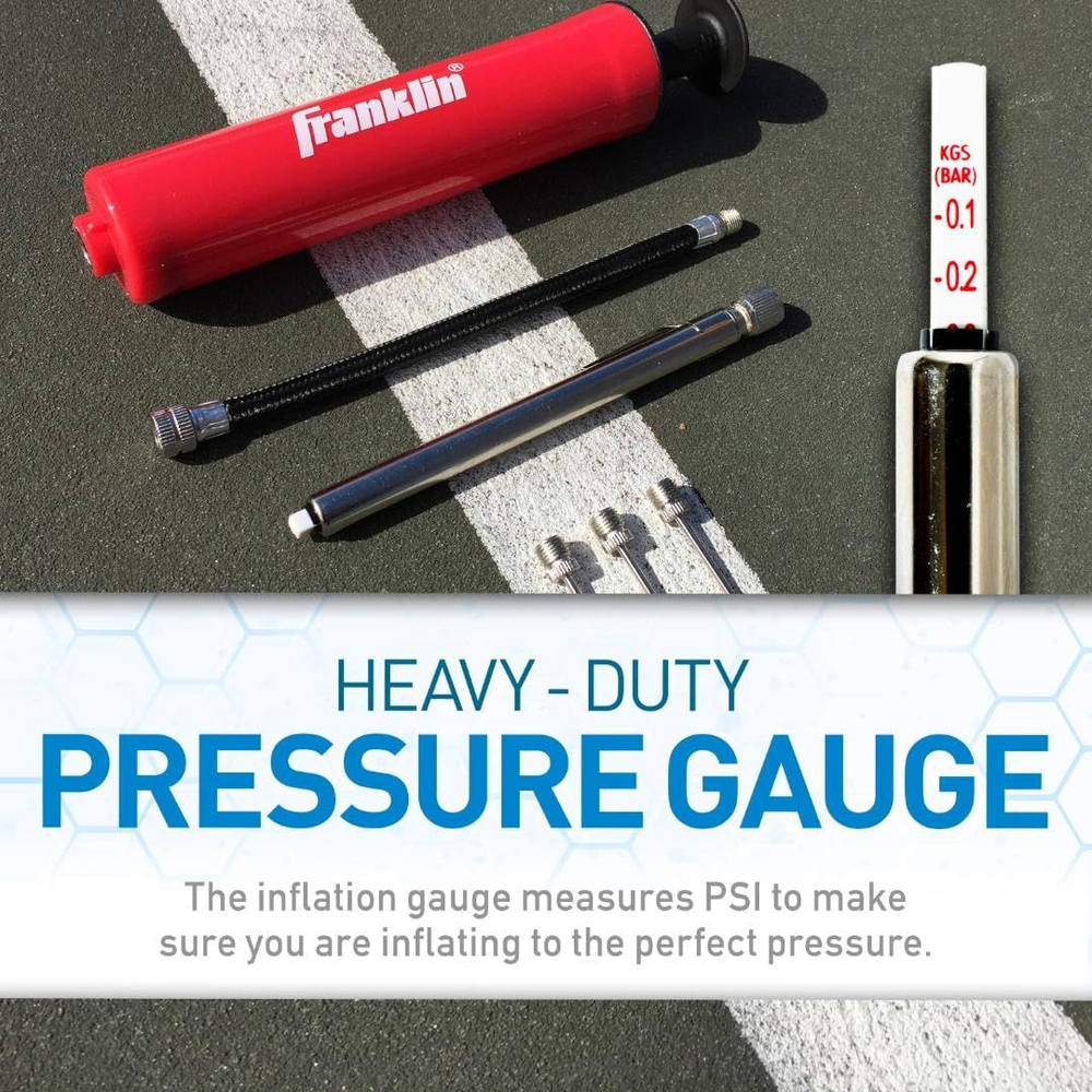 Complete pump kit: includes a 7.5 Inch pump with flexible extension hose, inflation needles and inflation gauge along with a carrying case to keep all components organized Inflation gauge: The heavy duty pressure gauge measures psi to make sure you are inflating to the perfect pressure Needles included: Includes 3 needles for pumping up all sizes of soccer balls, footballs, basketballs, playground balls and other inflatables. This pump is not recommended as a bicycle tire pump Emergency ball maintenance: Keep this ball maintenance kit in your bag so the game never goes flat; Ensure that the proper air pressure meets your game day requirements. Comes with a convenient carry case to bring with you wherever you go Easy to use: Pump up deflated sports balls quickly and easily, so you or your players can get back into the game. Don’t let a deflated ball ruin your play. Perfect for gyms, schools, sports centers, camps, and more Keep your sports balls inflated and ready to play with Franklin Sports' Ball Pump Kit! Nothing is worse than a flat basketball or soccer ball when you're ready to get the game started. But with this complete hand pump kit, you'll have everything you need to keep your sports balls inflated for optimal play. This set comes complete with (1) 7.5" hand pump, (3) inflation needles (1) flexible hose, (1) air pressure gauge, and (1) carry bag to make it easy to bring on the go. Don't let your game fall flat. Bring home one of Franklin Sports' Ball Pump Kits today and bring the bounce back.