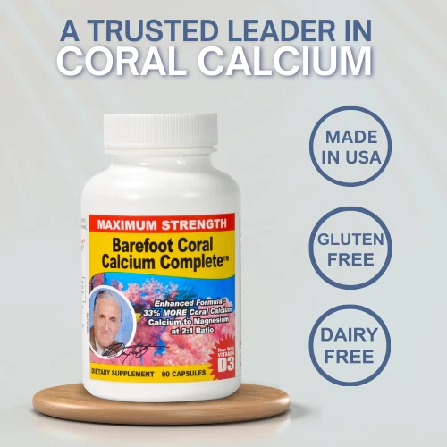 The Original Barefoot Coral Calcium Complete: Formulated & Endorsed by Robert Barefoot ENHANCED FORMULA : 1,500mg of marine-grade coral calcium harvested from the shores of Okinawa, Japan. It also includes extra levels of Vitamin D3 as well as Vitamins A, C, E, Vitamin B6, Vitamin B12, and other health-supporting nutrients. The result is the most comprehensive, highest-quality coral calcium supplement available to support overall health. 2:1 RATIO OF CALCIUM TO MAGNESIUM : Barefoot Coral Calcium Complete contains both calcium and magnesium in a biologically perfect 2:1 ratio. Magnesium helps your body use calcium more effectively. SUPPORTS PH BALANCE : Coral Calcium supports a healthy pH balance. Coral calcium acts as a natural alkalizer that helps support proper pH levels. SUPPORTS OVERALL HEALTH : Coral calcium is the perfect complement to support overall health. OKINAWA, JAPAN : The Okinawa prefectural government maintains strict guidelines for protecting the coral of Okinawa. The reefs of Okinawa extend to approximately 500 meters off shore. To be safe, our coral calcium is harvested from the shores of Okinawa where coral had broken off the reefs long ago. We do not in any way harm live coral or the reefs. Coral Calcium vs. Typical Calcium Supplements Coral calcium contains both calcium and magnesium in a biologically perfect 2:1 ratio. Magnesium helps your body use calcium more effectively. Coral Calcium is a natural source of 72 trace minerals helping your body maintain overall health and wellness. Coral Calcium is rich in special marine microbes and other micro-nutrients that support healthy digestion. Coral Calcium supports a healthy pH balance. Research suggests that when your body is too acidic, it takes calcium from the bones to restore balance. Coral calcium acts as a natural alkalizer that helps support proper pH levels. Coral Calcium is better absorbed than regular calcium. Research suggests that coral calcium is better absorbed and utilized in the body compared to calcium carbonate, the form of calcium used in most supplements. From A Trusted Leader in Coral Calcium... Barefoot Coral Calcium Complete is America’s trusted coral calcium supplement -- having sold millions of bottles since 1998. EffiHealth is proud to feature the original coral calcium formula developed by renowned chemist and natural health expert Robert Barefoot. Barefoot Coral Calcium Complete contains 1,500mg of marine-grade coral calcium harvested from the shores of Okinawa, Japan. It also includes extra levels of Vitamin D3 as well as Vitamins A, C, E, Vitamin B6, Vitamin B12 and other health-supporting nutrients. The result is the most comprehensive, highest-quality coral calcium supplement available to support overall health. The Okinawan Discovery to Health and Longevity Over 25 years ago, the Japanese Government commissioned a series of studies to determine why the people of Okinawa lived an average of 10 years longer than those on the mainland. The Okinawans enjoyed quick minds, slim bodies and stayed surprisingly energetic into their 80's and 90's. To the surprise of the scientists, all the studies reached the same conclusion: In addition to a healthy plant-based diet and regular physical activity, the calcium, minerals and other nutrients in the coral-rich water around the island helped keep the Okinawans healthy and vibrant well into their golden years.