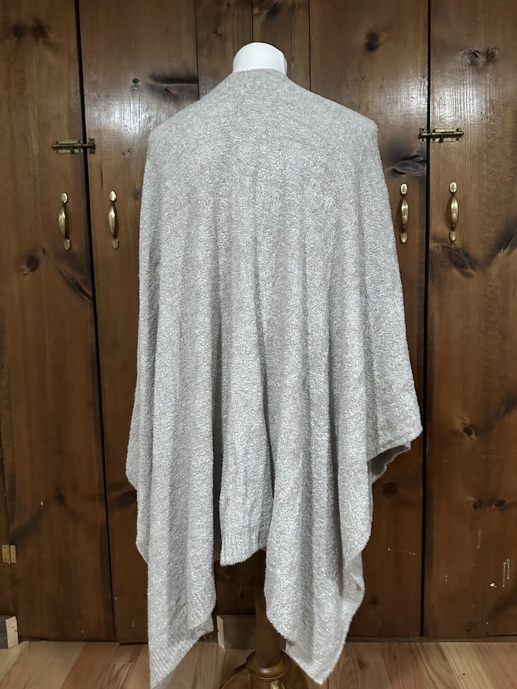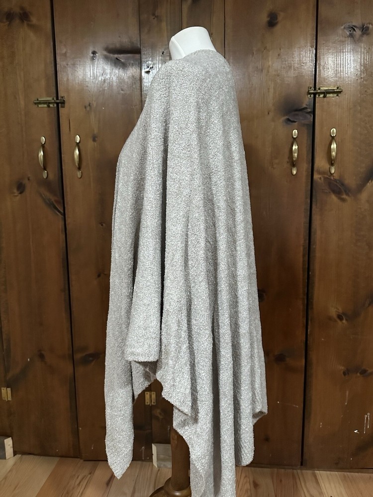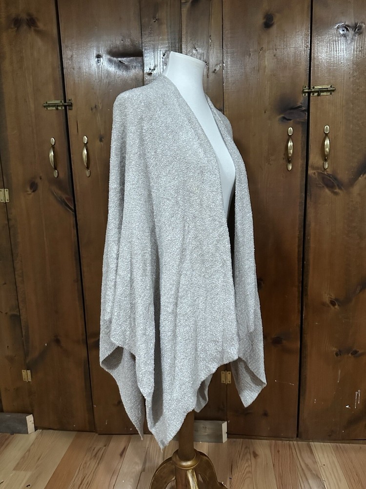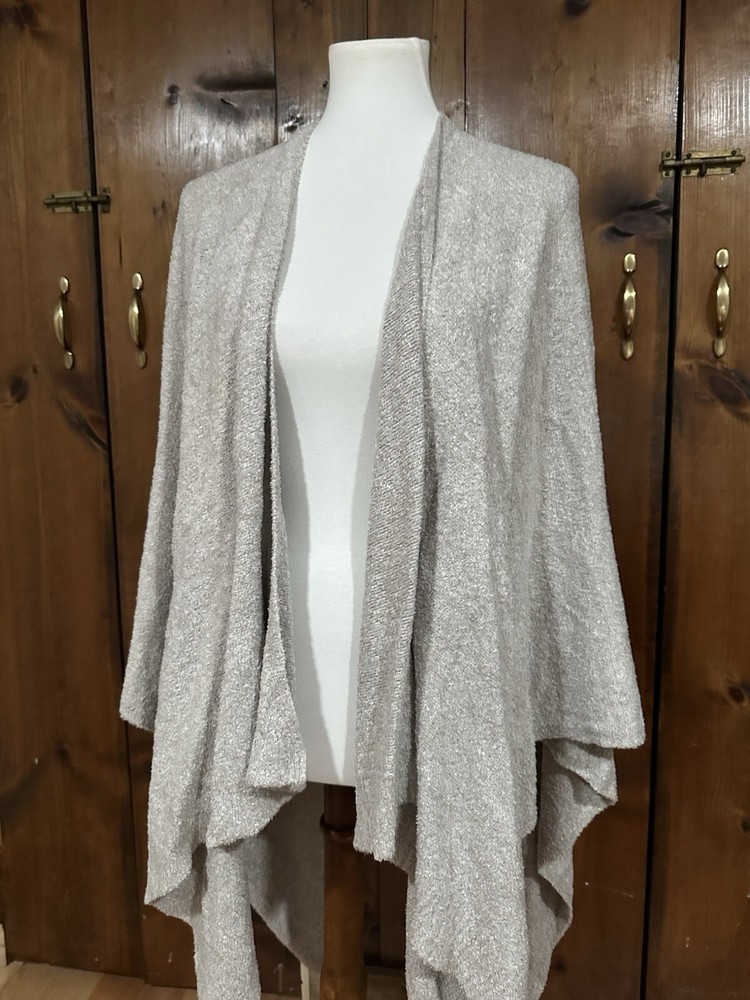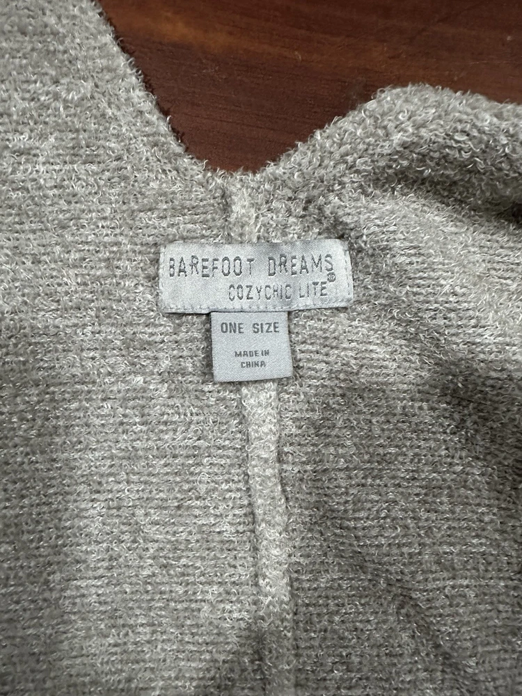 This is a cozy and chic Barefoot Dreams cardigan in a size medium. It is a pashmina gray color, featuring the brand's signature Dream character design. The cardigan is a regular fit and made from the brand's soft and comfortable Cozy Chic Lite material, perfect for staying warm and stylish. The style of the cardigan is a classic and versatile cardigan design, making it a great addition to any woman's wardrobe for a touch of luxury and comfort.