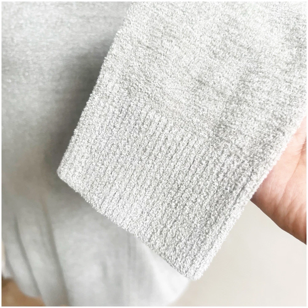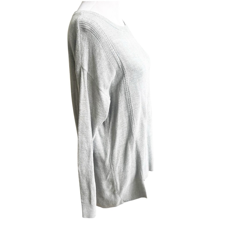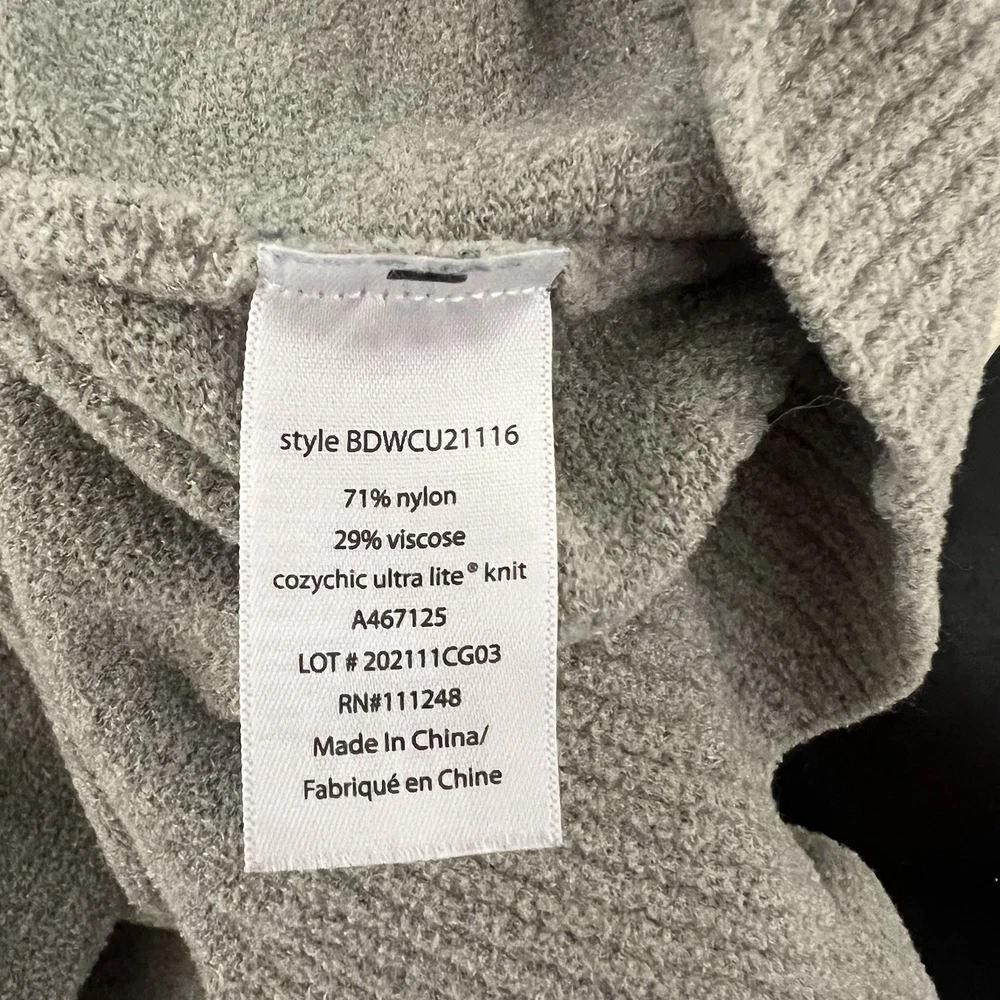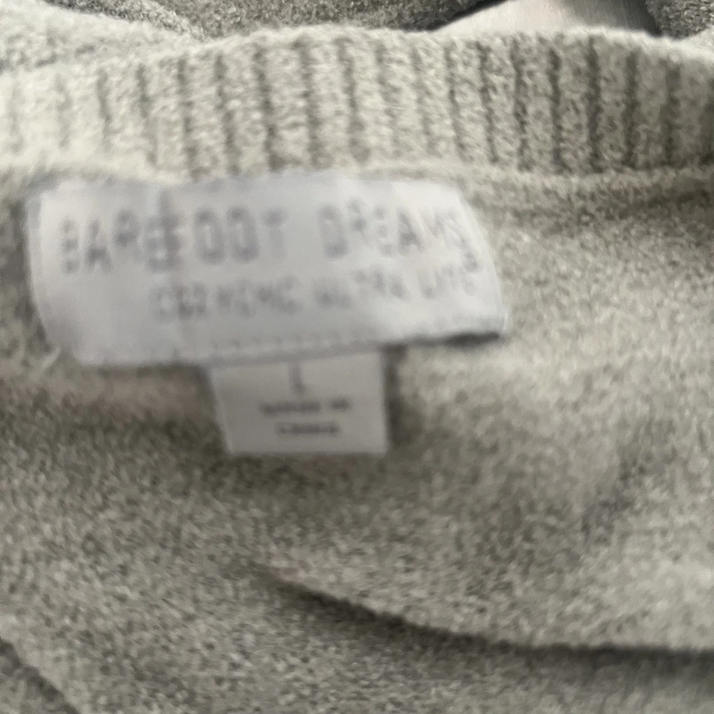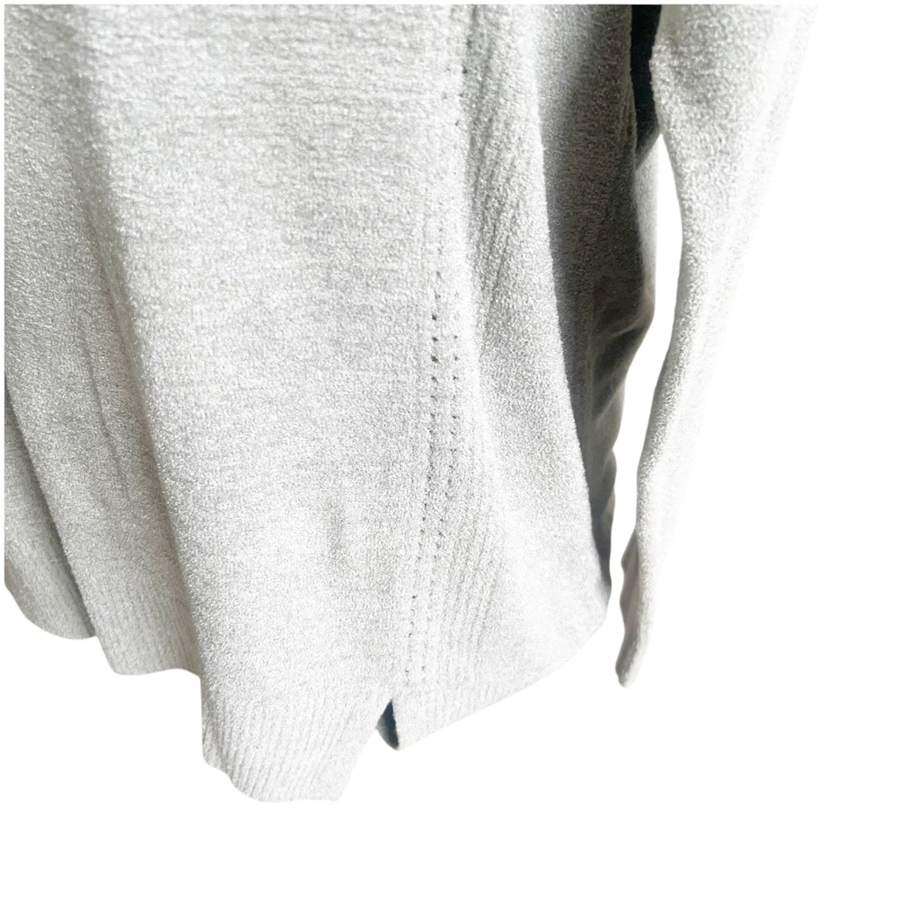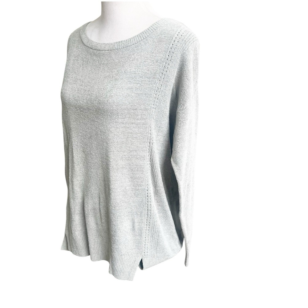 The Barefoot Dreams Cozy Chic Lite Sweater Pullover in light sage color is a stylish and comfortable piece for women in size Large. Made of a nylon and viscose blend in a tight-knit style, this pullover features a classic crew neckline and long sleeves, perfect for the winter, fall, and spring seasons. The sweater has a dreamy character and is machine washable, making it ideal for loungewear and everyday wear. Its bohemian and designer theme adds a touch of elegance to any outfit. Good used condition no holes or stains 23” pit to pit ; 27” front length; 29” back length 71% nylon; 29% viscose