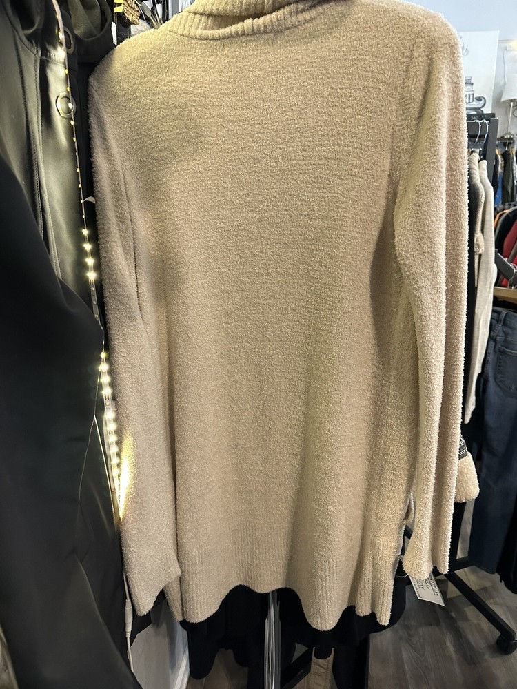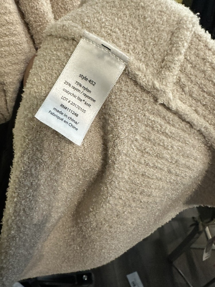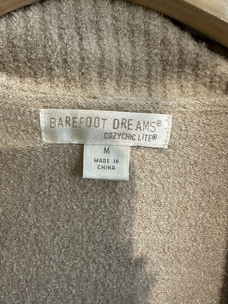 This Barefoot Dreams Cozy Chic cardigan sweater is the perfect addition to your wardrobe. The wide neckline and relaxed fit make it a comfortable and stylish choice for any casual occasion. With long sleeves and a tight-knit pattern, it's perfect for fall and winter seasons. The beige color is versatile and easy to match with other items in your closet. This sweater features pockets and an open style, making it easy to layer over your favorite outfits. Made from polyester material, it's both cozy and chic. The dream character adds a touch of whimsy to this sweater. Whether you're running errands or lounging at home, this cardigan is sure to become a staple in your wardrobe.
