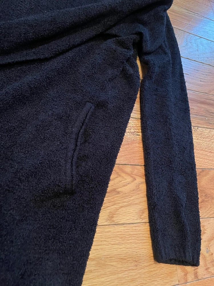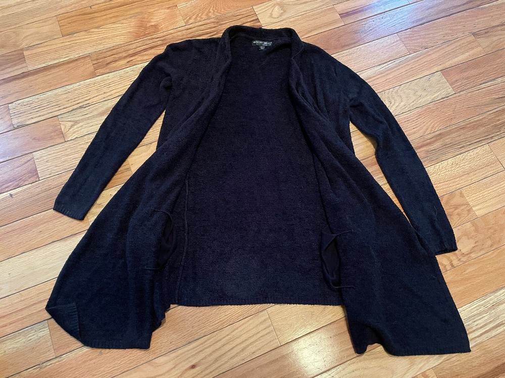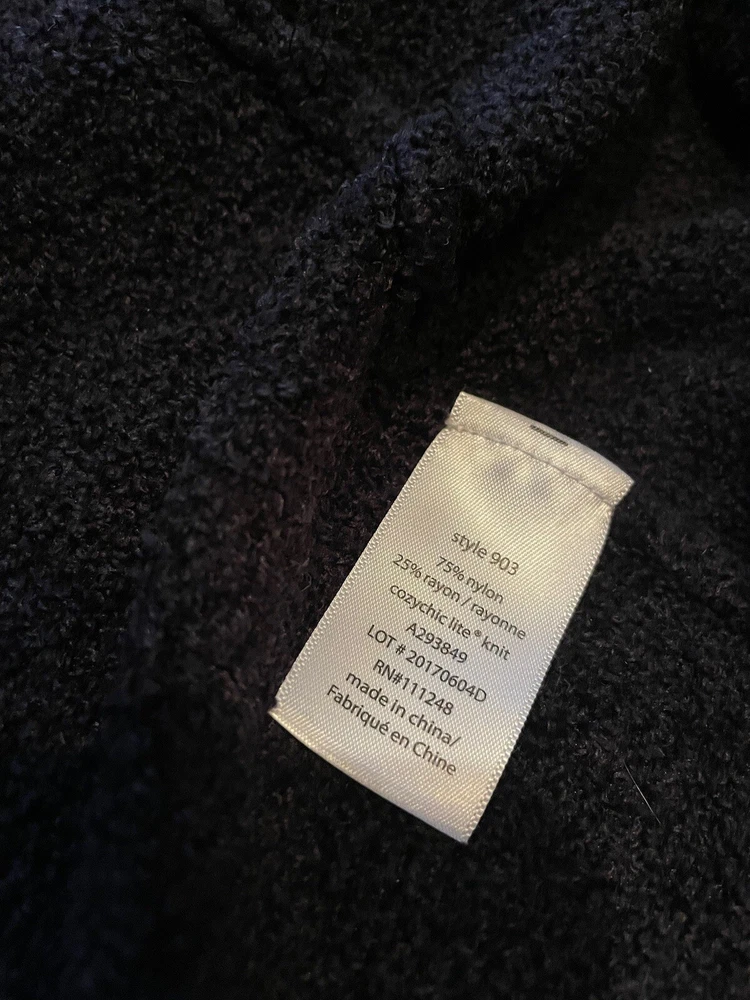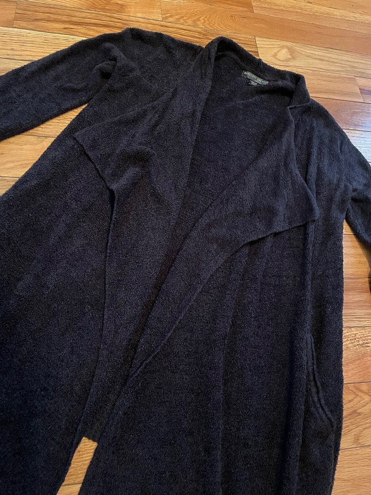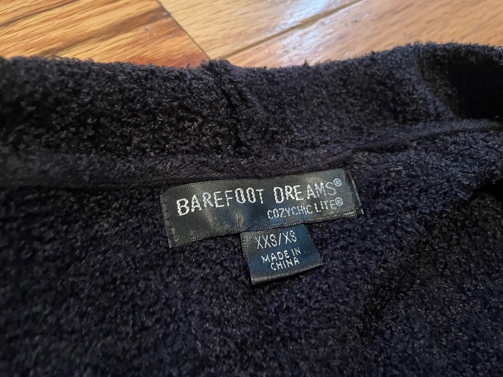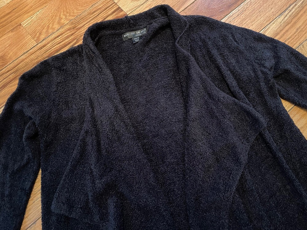 Barefoot Dreams Cozy Chic Lite black long sleeved wrap/drapey cardigan, women’s size XXS/XS (fits like a medium because of its oversized style). About 35 inches in length. Comfy and buttery soft. Pocket on each side. EUC. No rips, holes or stains. Please see photos for item details/dimensions. Some photos may appear different in color due to lighting. Ships from smoke-free home. Bin I