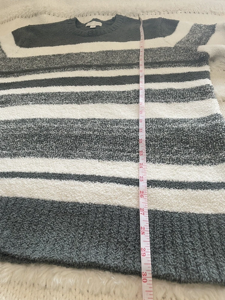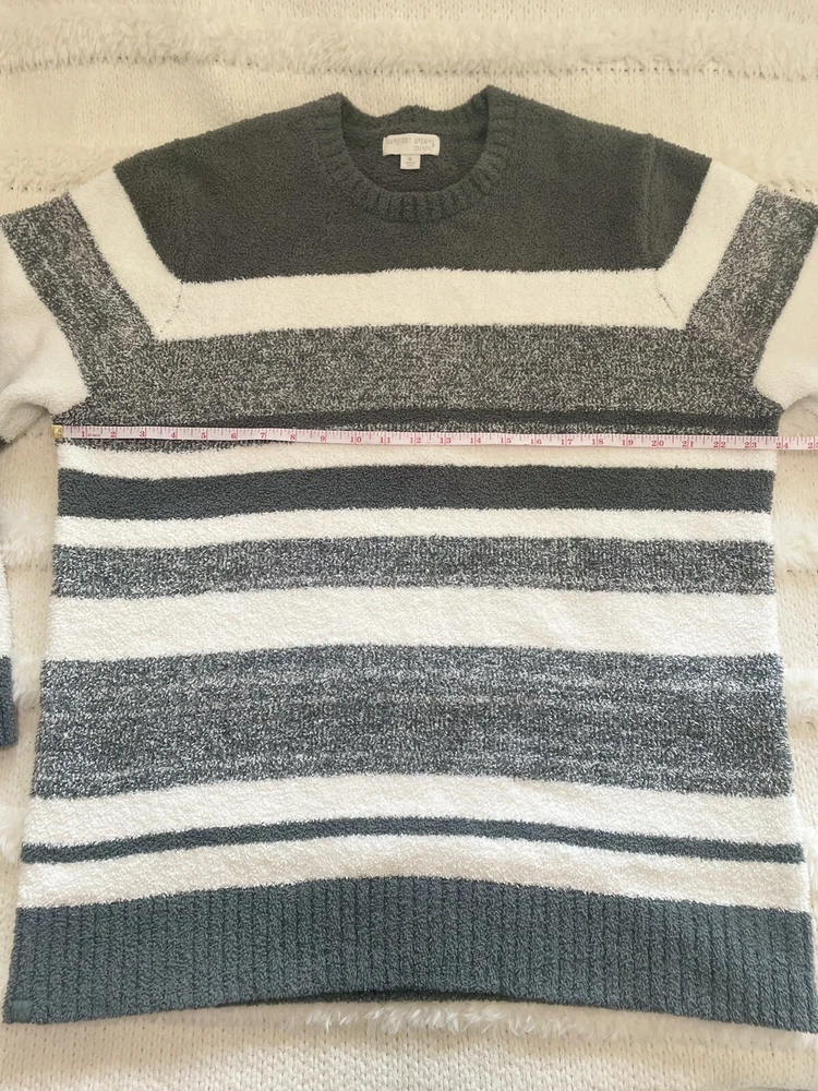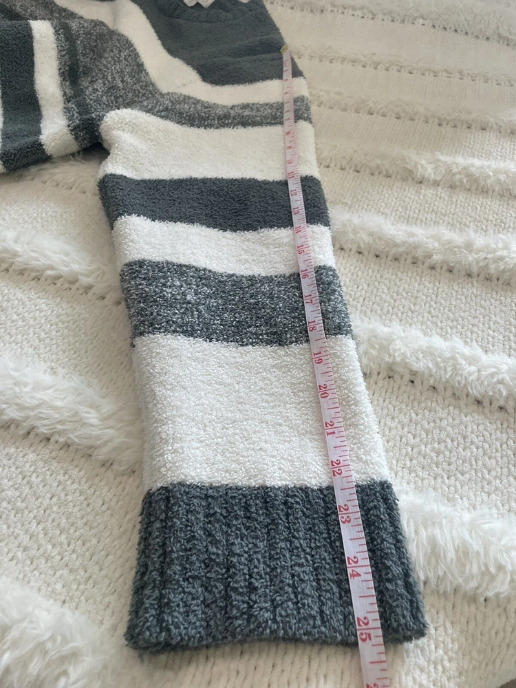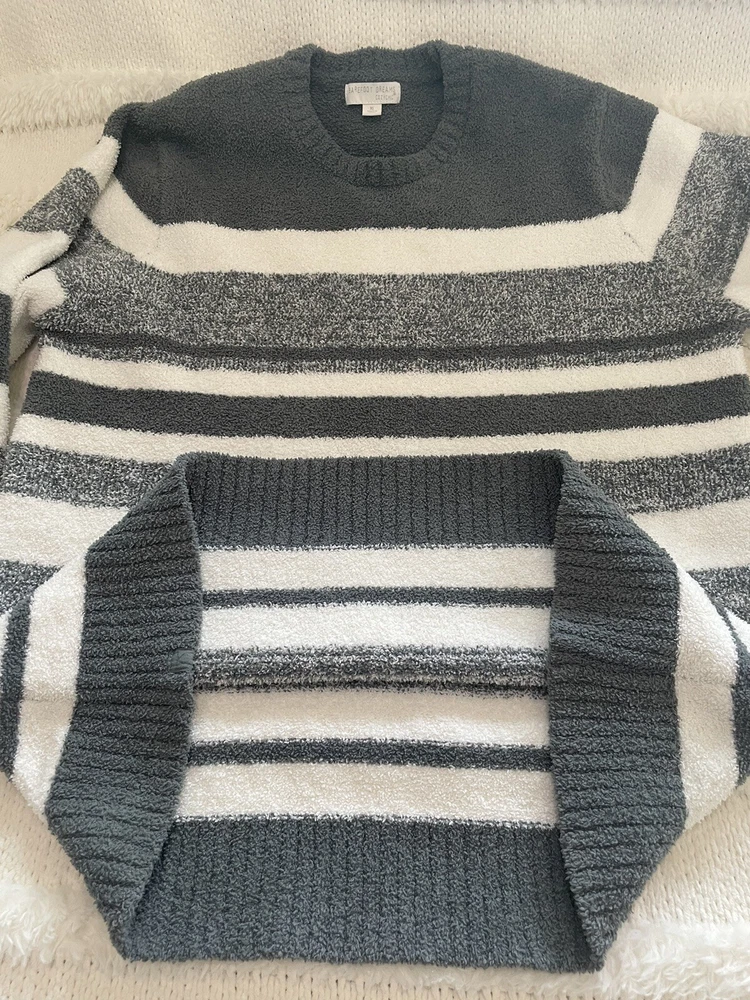 Pre-Owned in Great Condition Barefoot Dreams CozyChic Marled Stripe Pullover Sweater Size XL White/Gray Super Soft Cozy Warm style BDMCC1535 A382059 100% polyester cozychic® knit Measurements Laying Flat Approx Pit to Pit 24” Length 30” Sleeves 25” Smoke and Pet Free Home