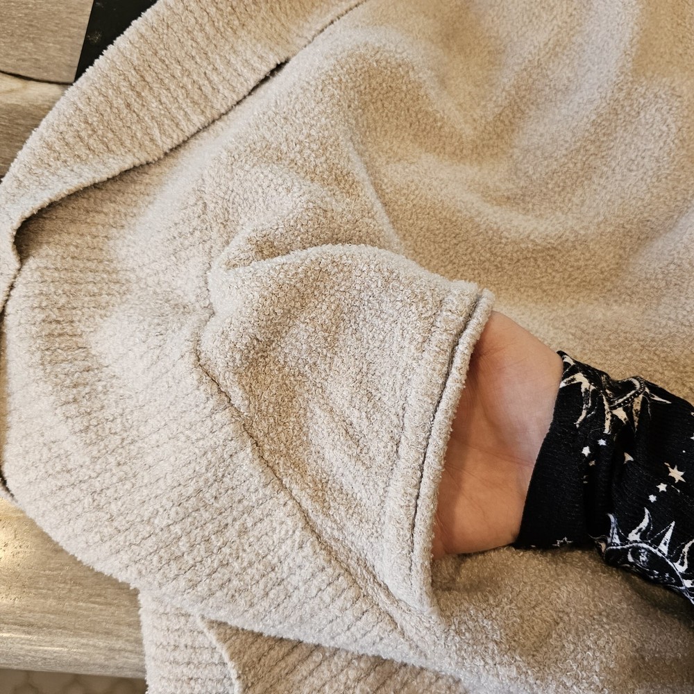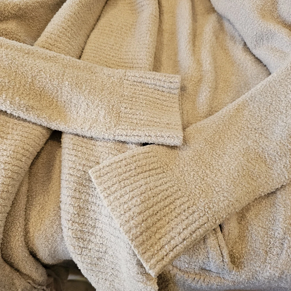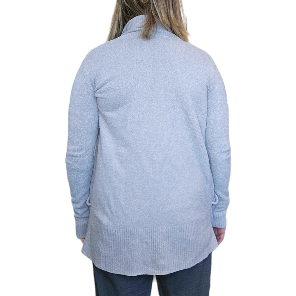 Add a touch of comfort and style to your wardrobe with this Barefoot Dreams Bamboo Chic Lite Circle Lounge Cardigan. The cardigan features a solid pattern with a tight-knit and relaxed fit, making it perfect for travel or casual occasions. The long sleeve cardigan is made of a blend of nylon and viscose, ensuring it is soft, cozy, and machine washable. The neutral cream color and bohemian, classic, and cozy theme make it a great addition to any outfit. Additionally, the cardigan is perfect for all seasons. Slight wash wear True color shown best in closeups of garment. Slightly fitted in arms Mid-length Approximate measurements laid flat Chest 18.5" Back Length 29.5"
