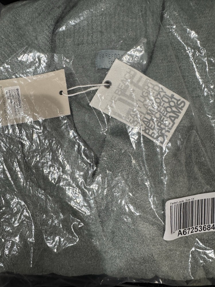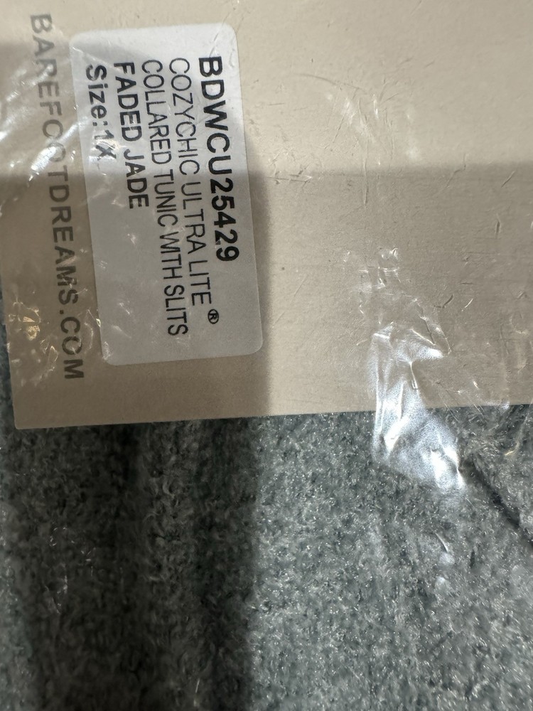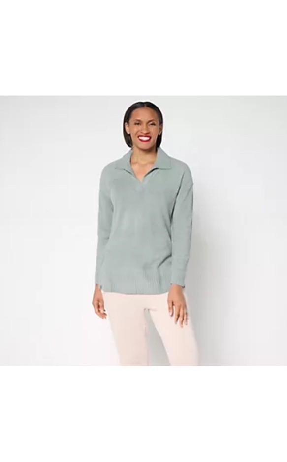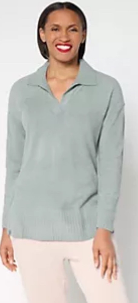 The Barefoot Dreams Cozy Chic Ultralight Collared Tunic in Faded Jade is a stylish and comfortable sweater designed for women in size 1X. This tunic features a collared neckline and slits for added detail, making it a chic and trendy addition to any wardrobe. The soft green color and cozy design of this sweater make it a versatile piece that can be dressed up or down for any occasion.