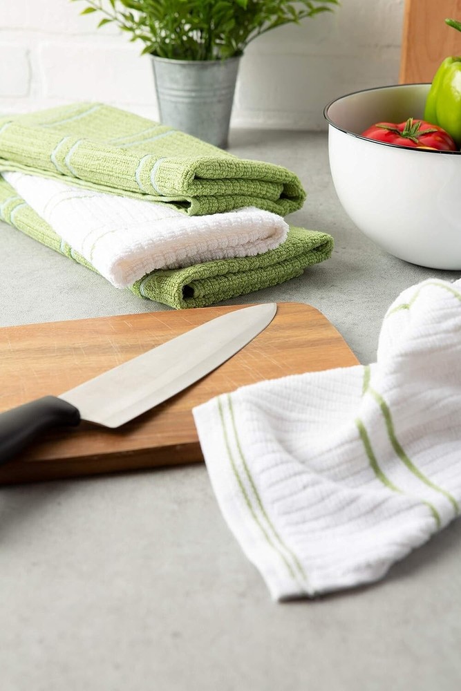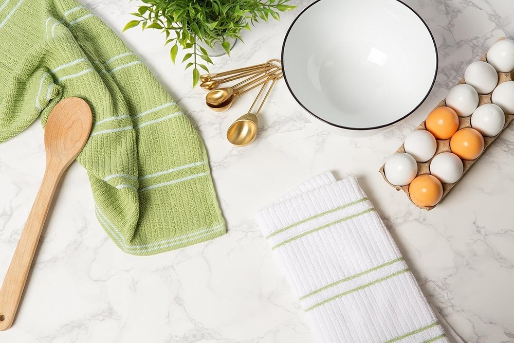 These kitchen towels are a must-have! Super soft, super absorbent, and the ribbed terry weave works like a charm for drying dishes and wiping spills. Love that they come in a set of six—perfect for rotating through laundry. The green color is fresh and brightens up the kitchen. They hold up well after washes and feel sturdy. Great value for the quality!