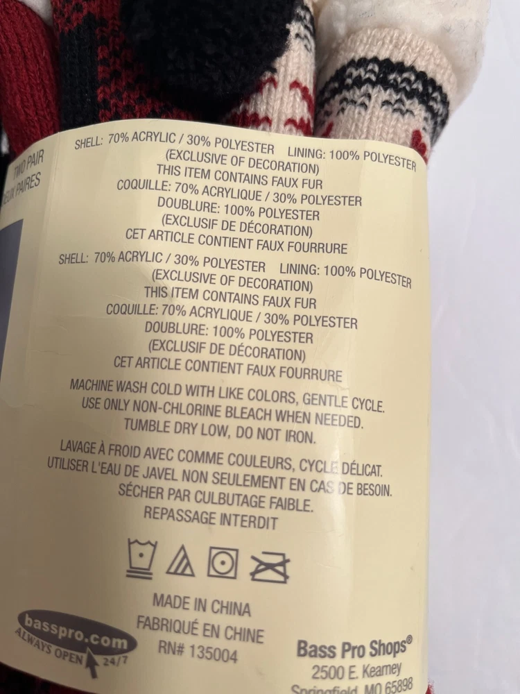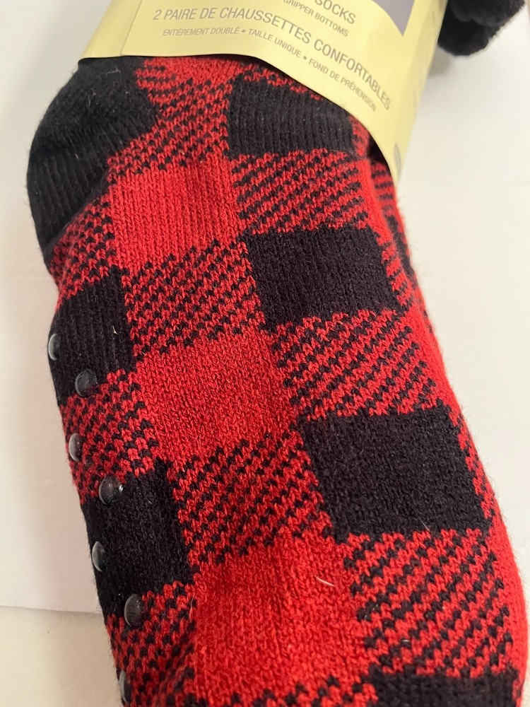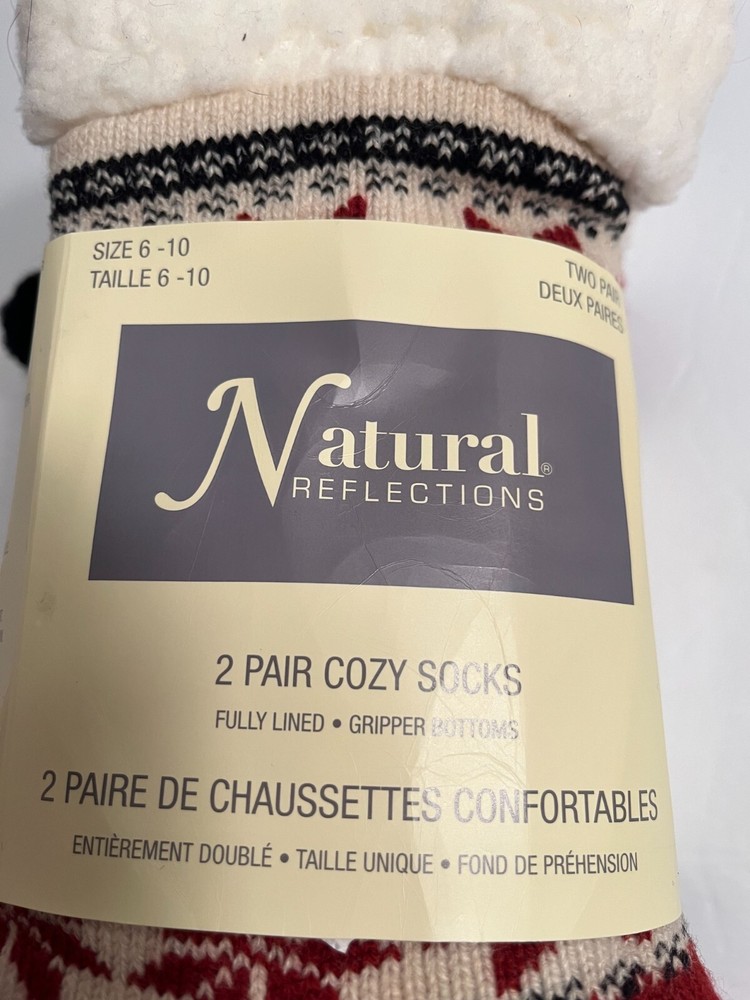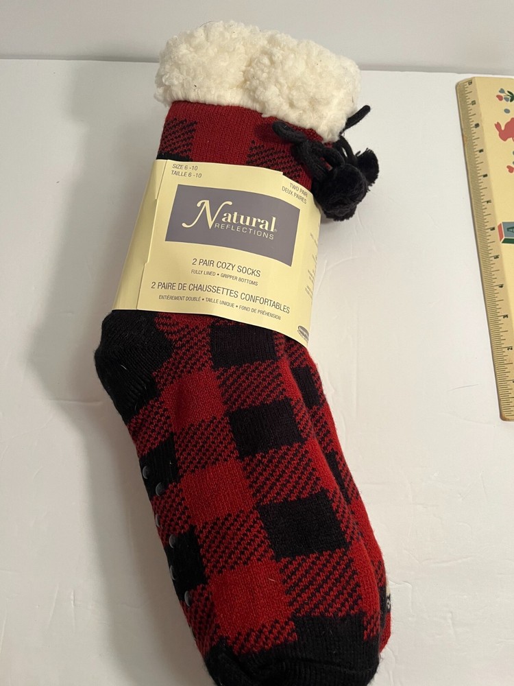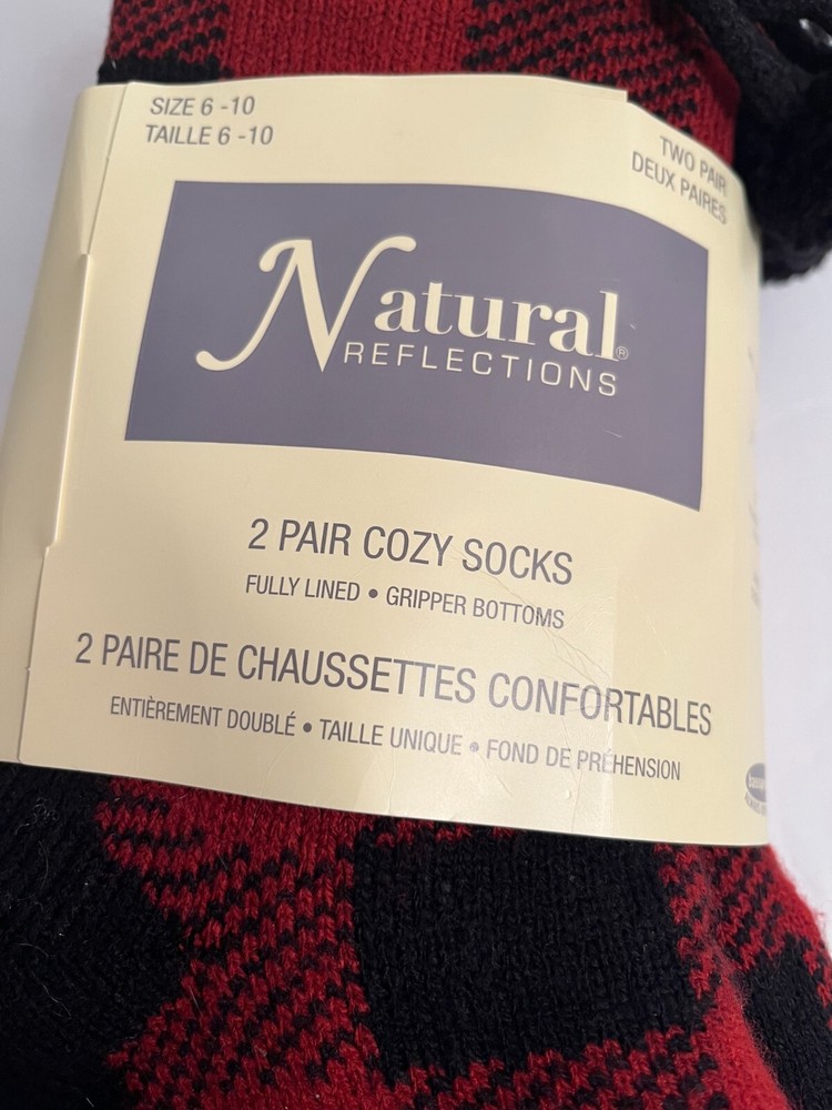 Stay cozy and comfortable this winter with the BassPro Natural Relections 2 pair of Cozy Socks. Fully Lined with Gripper Bottoms. These mid-calf socks are perfect for women who wear sizes 6-10. The socks come in a pack of two pairs and are made by the trusted brand, Bass Pro. The socks are perfect for winter and have a stylish cozy design. They are not handmade and are not personalized. The socks are suitable for any winter theme and are ideal for women who love to stay comfortable during the cold season. See photos. One plaid, One with Bear.