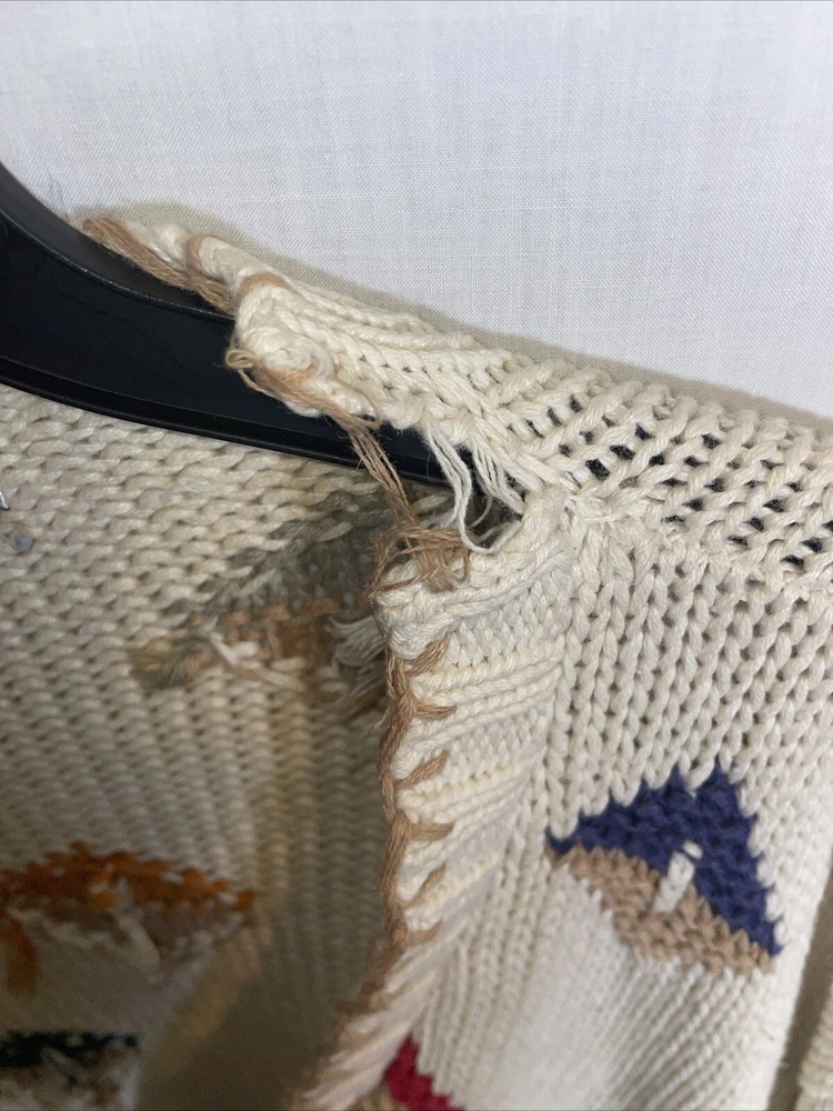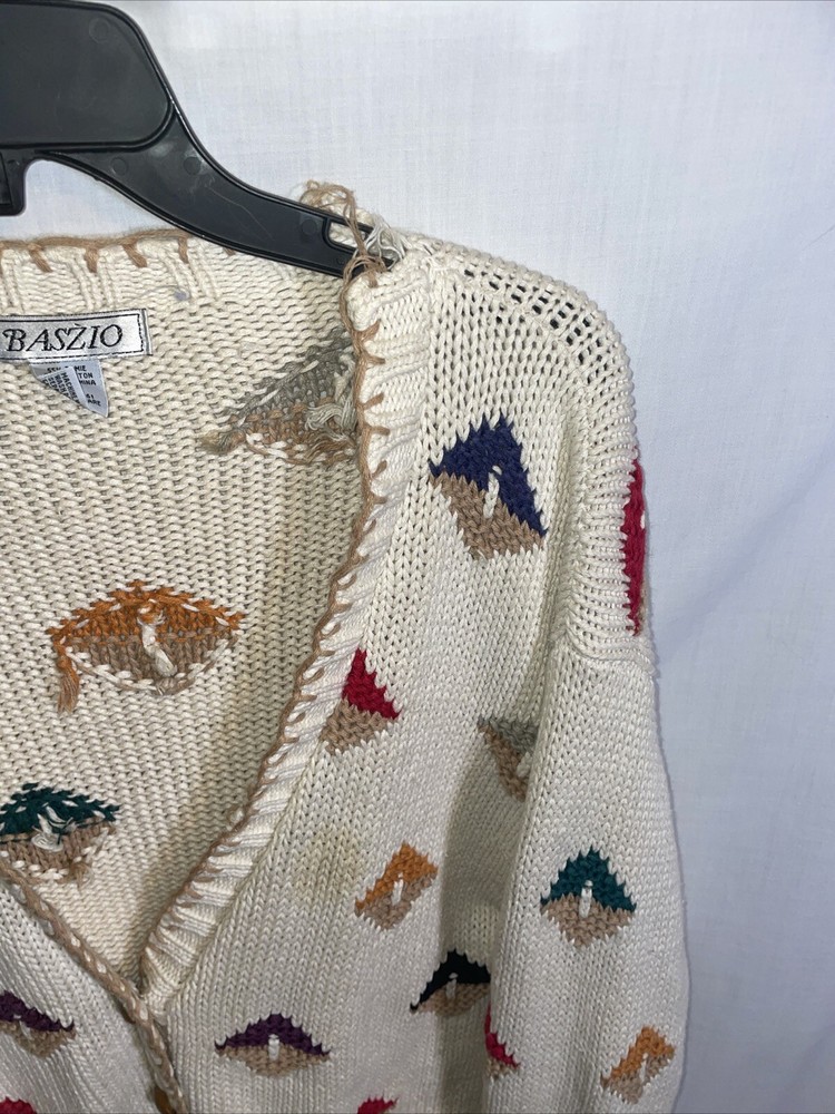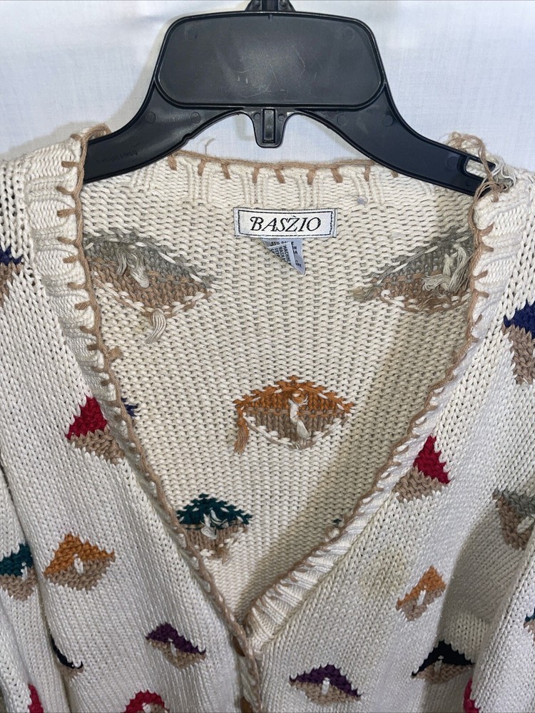This women’s beige geometric Baszio crochet cardigan has a break on neck and a stain on the front. This item comes in a size Medium Armpit to armpit is 20 Armpit to sleeve is 22 Back of collar to hem is 24 Make an offer! If it doesn’t go……message me what you’re thinking! Thanks for looking at our item!😊 S1 S2