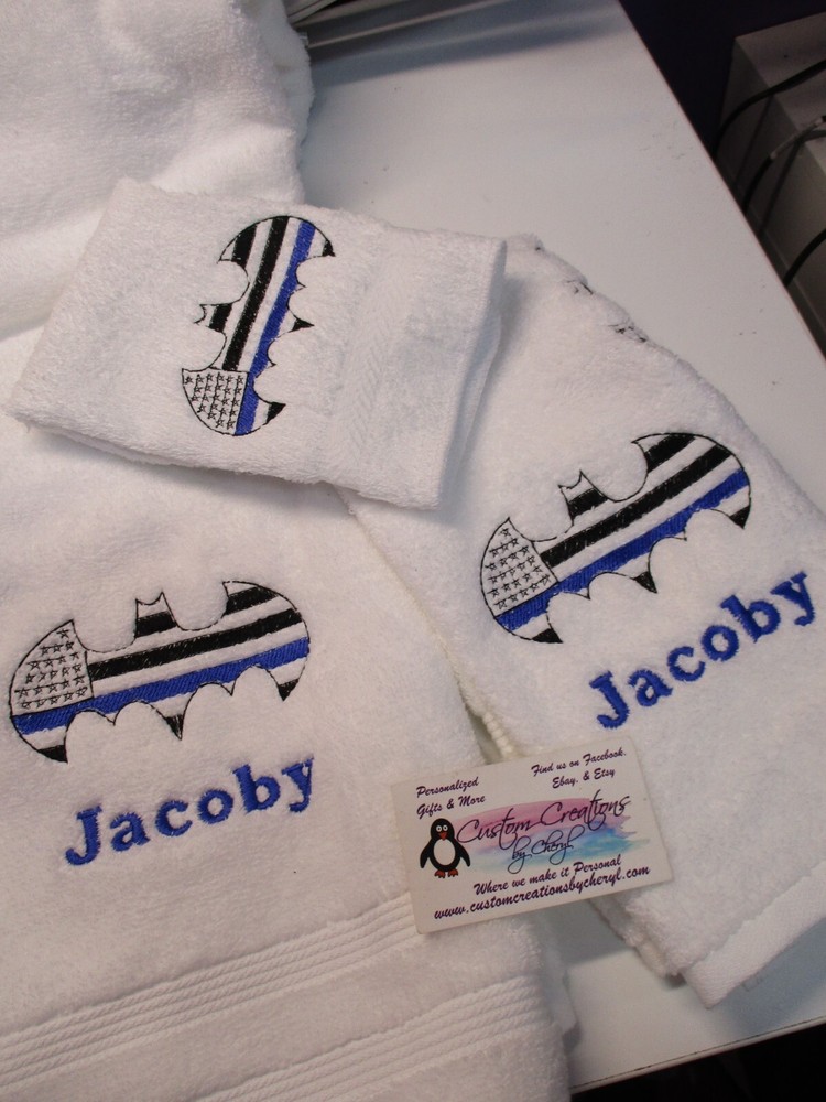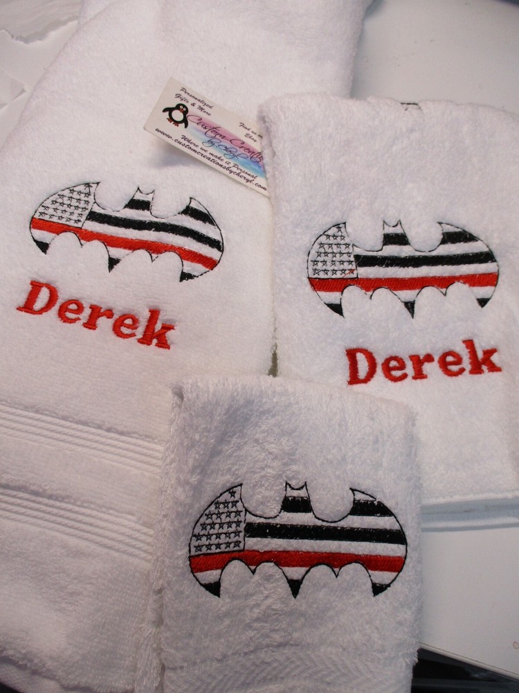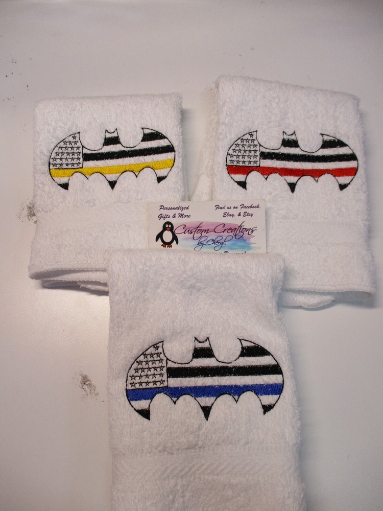 Up for sale on this auction is a really nice PERSONALIZED 3 piece towel set: bath (50 x 26) hand (25 x 16) towel and washcloth combo set. This set is a white set but I can do any towel, washcloth and or hand towel color that you would like just leave the info in the comment box when you checkout. I have green, purple, orange, tan, chocolate, hot pink, black, gray, white, navy blue, burgundy, red, & royal blue. This design is batman yellow gold Thin Line with a thin yellow gold line going through it and the name of YOUR choice the washcloth is the design only. I do have many thread colors to choose from. All of my items are custom made and do come from a smoke free home. I will be more then happy to combine shipping charges. If you do not see a design that you are interested in please ask as I am sure I will have it. Designs range from sports, mascots, kids themes, weddings, teens, and many more.... Please leave the info in the comment box when you checkout. PLEASE LEAVE THE TOWEL COLOR AND NAME THAT YOU WOULD LIKE ON THIS SET IN THE MESSAGE COMMENT BOX... IF NONE IS GIVEN THEN I WILL USE JUST THE LOGO AND THE TOWEL COLOR LISTED IN THE MAIN PICTURE !!! THANKS FOR LOOKING!!!