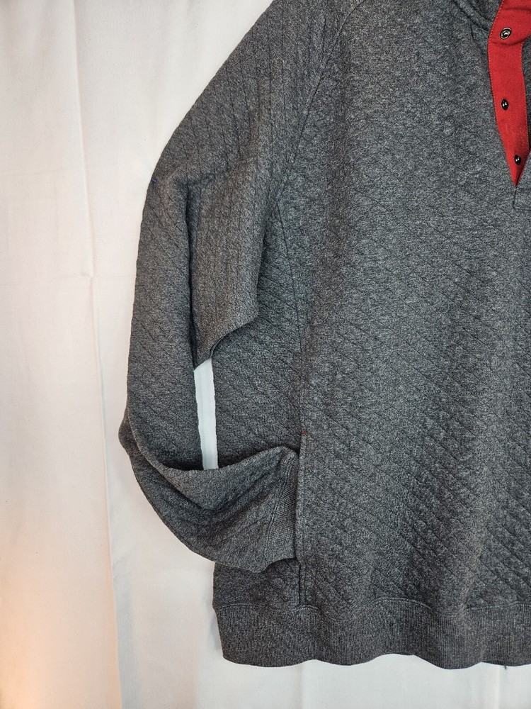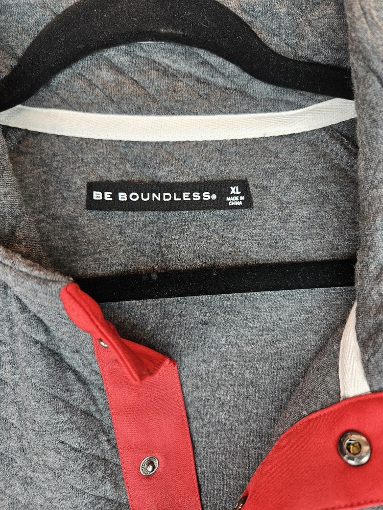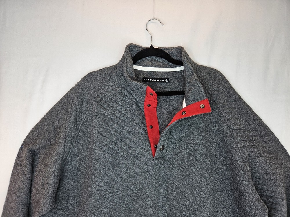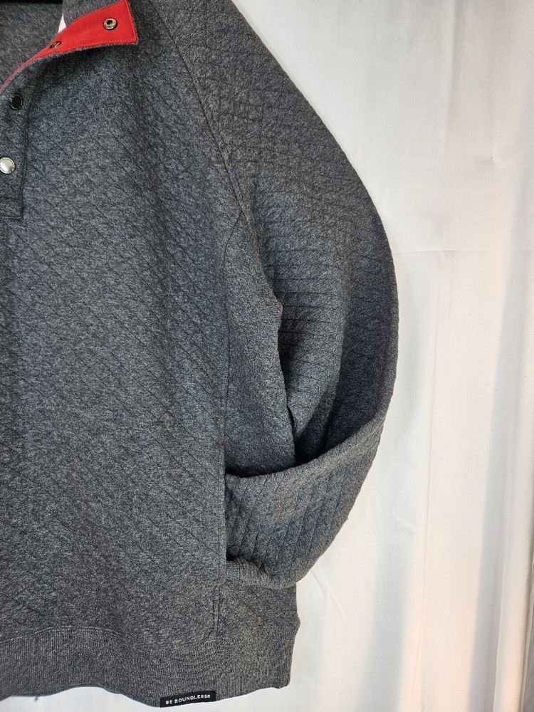 Stay warm and cozy this fall and winter with this men's pullover sweatshirt from Be Boundless. Featuring a quilted texture pattern, this cotton and polyester blend sweatshirt in size XL comes in a stylish gray color with red fabric accents. The V-neckline and front 1/4 snap closure add to its casual comfort, making it perfect for any activity or season. This sweatshirt is machine washable and has a regular fit, making it easy to care for and wear every day. The sweatshirt also includes the brand's signature "Boundless" character and the theme of "Warm & toasty." This sweatshirt is a perfect addition to any wardrobe and is sure to keep you warm and comfortable wherever you go. Kangaroo Pockets Chest 56 Waist 53 Length 28.5 Arm 22 #663 P&E #D 71323