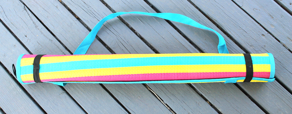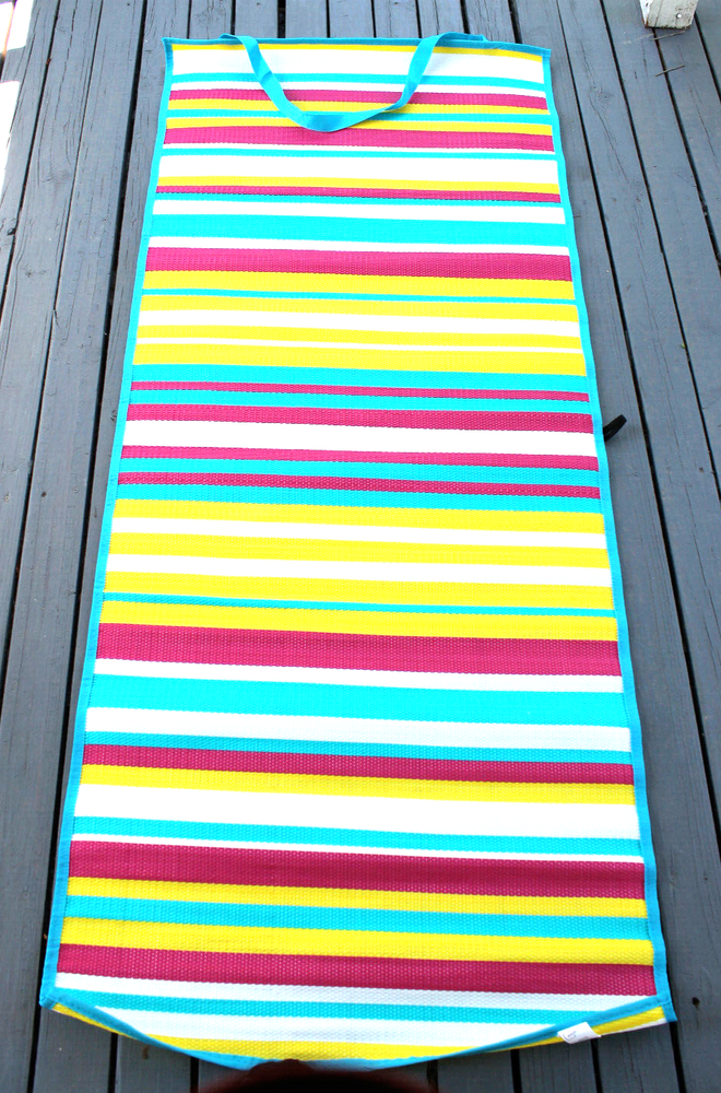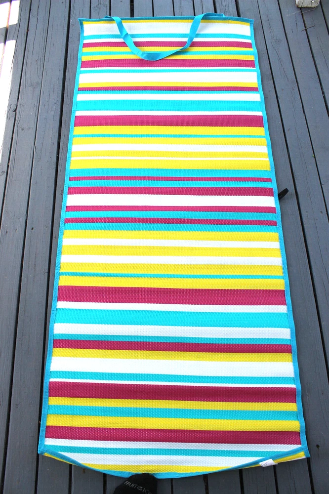 Enjoy the beach or pool in style with this red, white, yellow, and blue striped beach mat. The mat is perfect for sunbathing and features a carrying strap for easy transportation. Measuring 30 x 71 inches, this mat is large enough for you or your friends to relax on in comfort. Made by Mainstay and manufactured in China, this mat is of high quality and has a vintage look with its stripes. It is perfect for any outdoor activity and is sure to make your time at the beach or pool even more enjoyable. So, roll up your mat, carry it with you, and enjoy the sun and water in style!