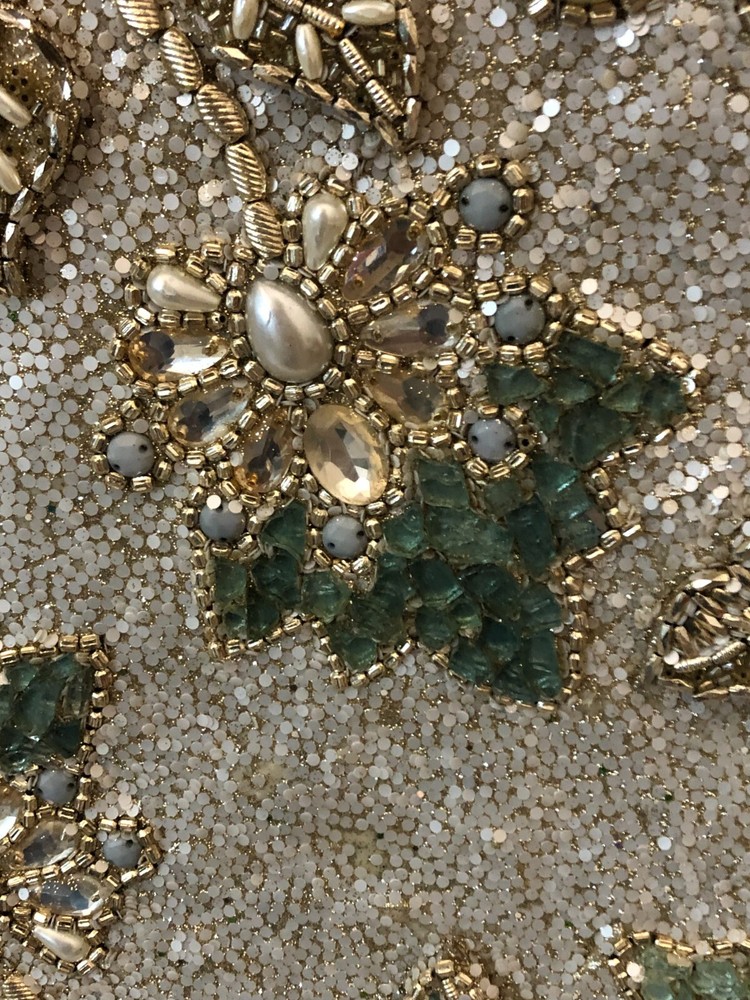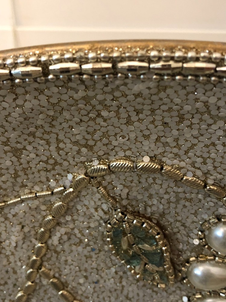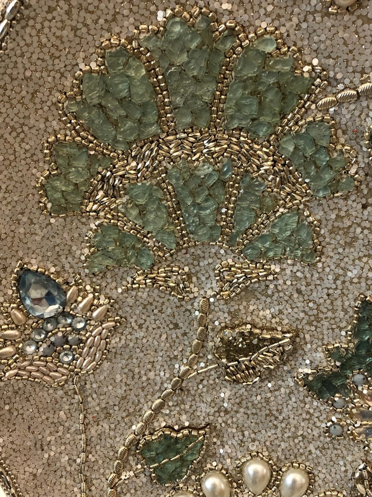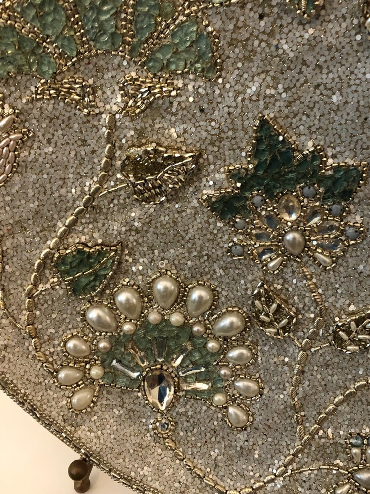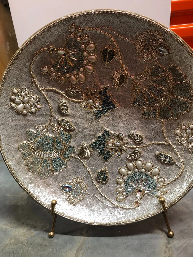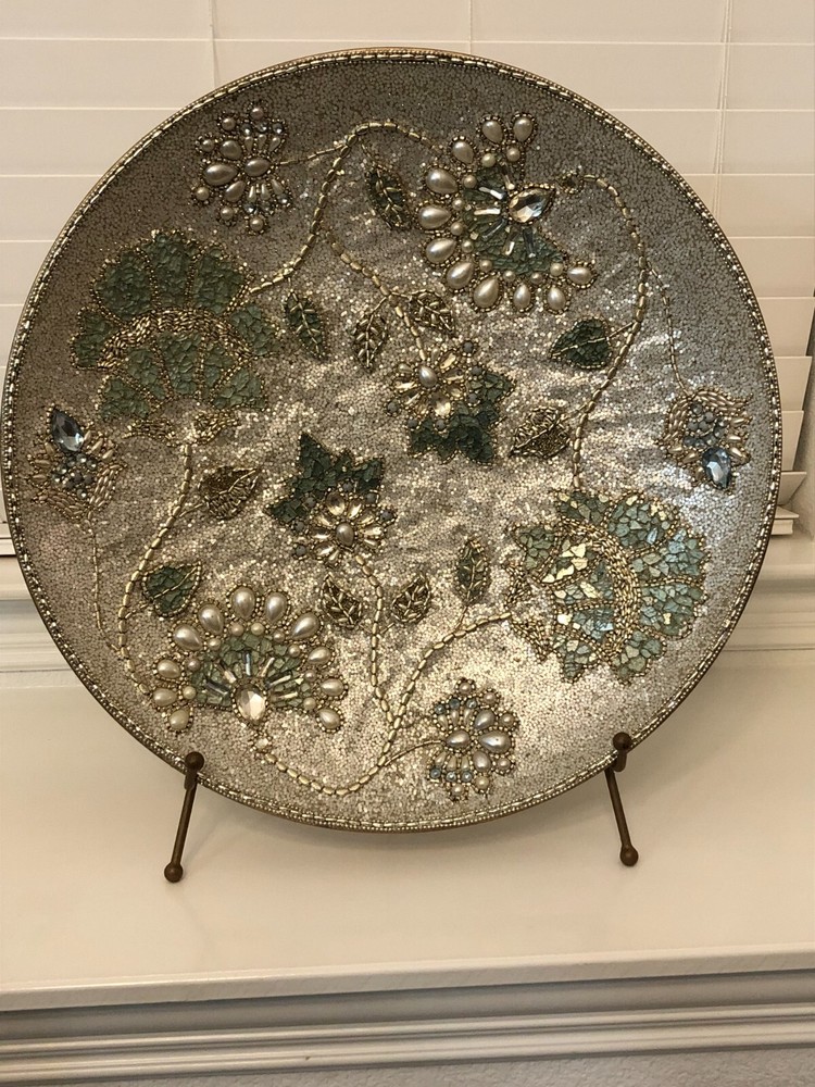 Add this Beautiful, Intricate, Hand Made piece to your home or office decor. Floral design of Textured Jewels, Beads, and Pearls on Gold Metal Platter. Last inventory item from Pier 1 imports. Includes Gold Metal display stand. Material: Glass, Pearls, Beads, Metal Dimensions: 21inches round