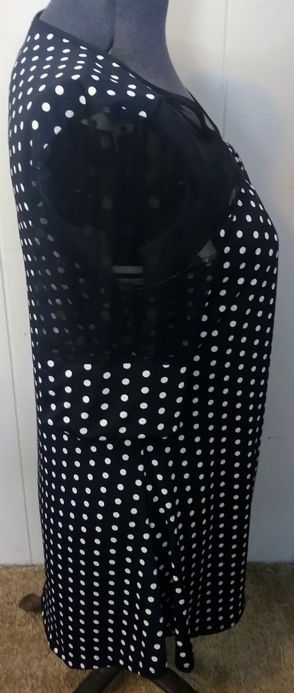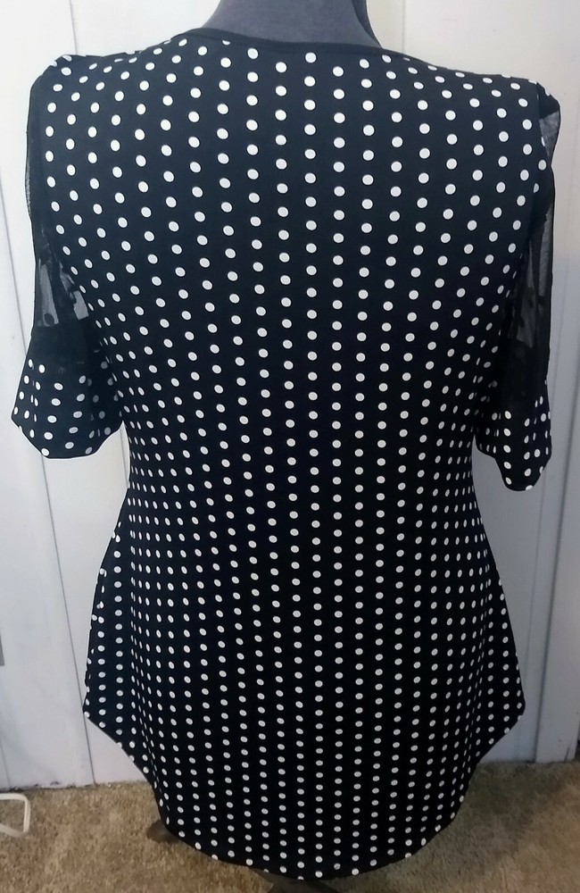 This beautiful blouse from Cozy Collection is a must-have for any wardrobe. The polka dot pattern and scoop neckline add a touch of elegance to any outfit, while the short sleeves and lightweight fabric make it perfect for warmer weather. The blouse is made from a comfortable blend of 96% polyester and 4% spandex, and can be easily cared for with a cold gentle cycle tumble dry low. The collarless and sheer features of this blouse make it perfect for a variety of occasions, from work to a casual day out. The black color and classy theme of the blouse make it a versatile addition to any wardrobe. This blouse is available in size M and is suitable for regular size types.