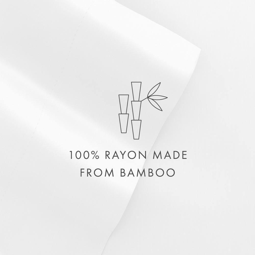 Solid color complements various styles of decor Set includes 1 fitted sheet, 1 flat sheet, and 2 pillowcases Drift off to sleep with this silky smooth bamboo 4 piece sheet set. Made from 100 percent rayon from sustainably sourced bamboo, this set is amazingly soft, naturally breathable and twice as strong as cotton. Available in a variety of colors you're sure to find the perfect set to give your bedding some added comfort and style. Bedding Material: Rayon from Bamboo Care Instructions: Machine Wash Color: White Color Family: White Decor Type: Bedroom Linen Features: Antimicrobial,Deep Pocket,Hypoallergenic Lifestage: Adult Linen Type: Sheet Set Material: Rayon (100%) Number of Pieces: 4 Occasion: Year Round Origin: Imported Pattern Type: Solid Color Pattern/theme: Solid Pocket Depth (in.): 16 in. Returnable: 30-Day Set Includes: Fitted Sheet,Flat Sheet,Pillow cases Size: California King Thread Count: 300