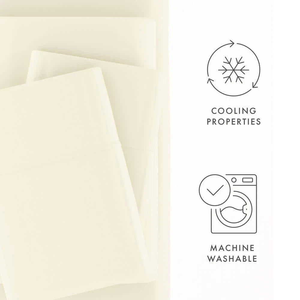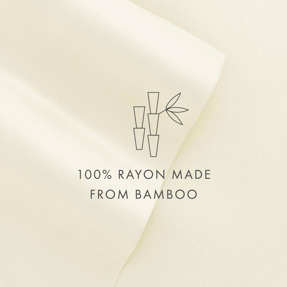 Solid color complements various styles of decor Set includes 1 fitted sheet, 1 flat sheet, and 2 pillowcases Drift off to sleep with this silky smooth bamboo 4 piece sheet set. Made from 100 percent rayon from sustainably sourced bamboo, this set is amazingly soft, naturally breathable and twice as strong as cotton. Available in a variety of colors you're sure to find the perfect set to give your bedding some added comfort and style. Bedding Material: Rayon from Bamboo Care Instructions: Machine Wash Color: Ivory Color Family: White Decor Type: Bedroom Linen Features: Antimicrobial,Deep Pocket,Hypoallergenic Lifestage: Adult Linen Type: Sheet Set Material: Rayon (100%) Number of Pieces: 4 Occasion: Year Round Origin: Imported Pattern Type: Solid Color Pattern/theme: Solid Pocket Depth (in.): 16 in. Returnable: 30-Day Set Includes: Fitted Sheet,Flat Sheet,Pillow cases Size: King Thread Count: 300